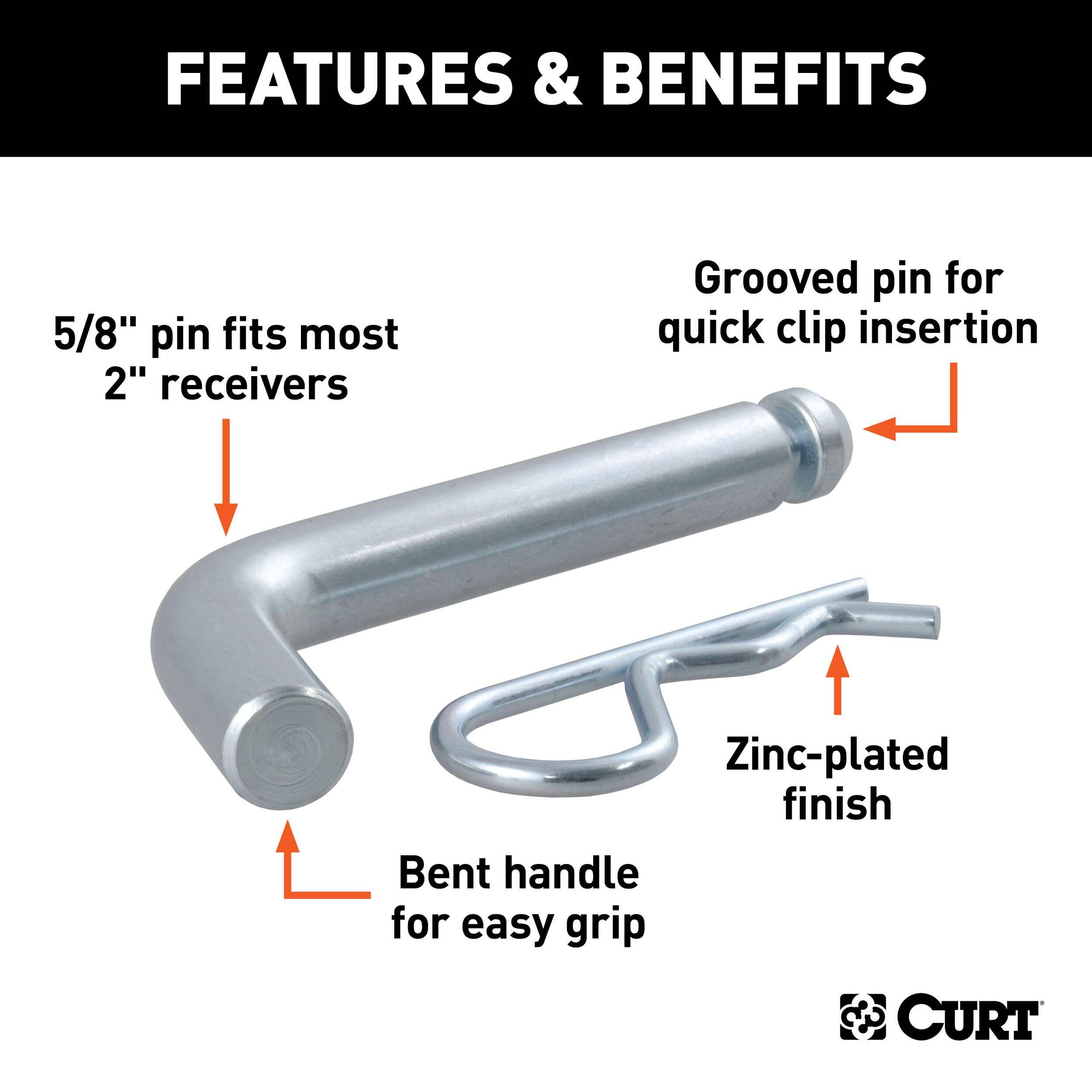 When you mount a ball mount on your trailer hitch, you expect it to stay put. Whatever type of load you are hauling, having towing equipment that can work as hard as you do is a must. For all types of heavy-duty towing, CURT 5/8" hitch pins and clips pack a little extra punch. We make our 5/8" hitch pins out of solid steel and coat them in one of four finish options. All of these finishes offer excellent resistance to rust and corrosion for long-lasting, smooth operation. CURT hitch pins are also constructed with a 105-degree bend, creating a useful handle for a better grip and allowing the pin to stay securely engaged in the trailer hitch and ball mount. This particular 5/8" hitch pin features a zinc finish and comes with a groove that allows the clip to be inserted at any angle. It provides a reliable installation for any ball mount or hitch-mounted accessory with a 2" shank, making it the perfect fit for class 3, 4 and 5 trailer hitches.