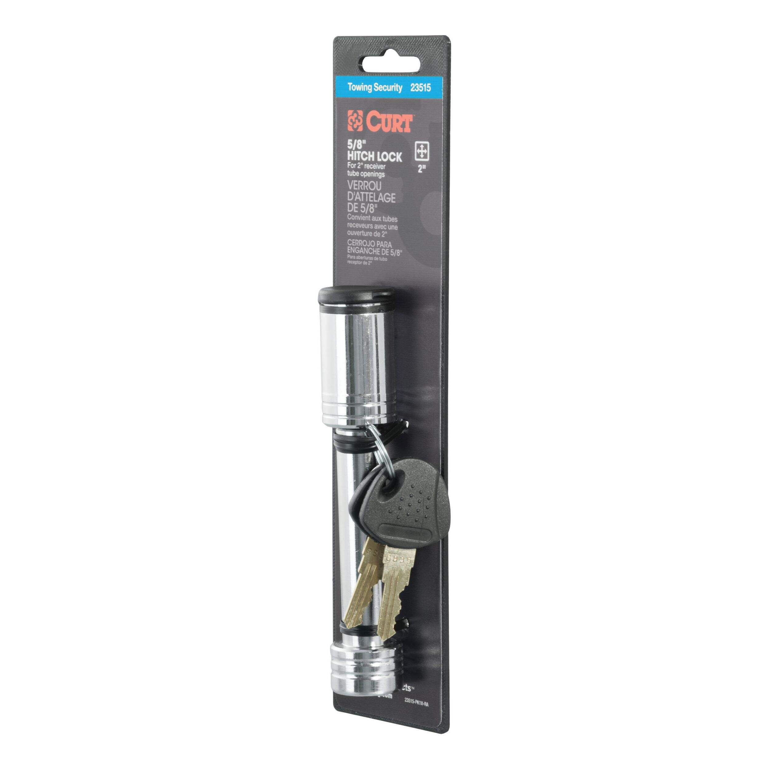 Make your tow vehicle and trailer more secure by keeping them locked up tight with a CURT hitch lock. Like a hitch pin and clip, a hitch lock is designed to insert into the fastener hole in the side of a receiver tube in order to hold a ball mount or hitch-mounted accessory in place. While a CURT hitch pin does offer sufficient strength for keeping your ball mount firmly attached, a CURT hitch lock goes one step further. CURT hitch locks allow you to lock your ball mount into your trailer hitch, deterring theft and preventing anyone from detaching your trailer at the ball mount and towing away your property without your permission. This CURT hitch lock features a barbell design and comes with a 5/8" pin diameter to fit a 2" receiver tube size. CURT barbell hitch locks are comprised of a pin with two end caps and a round locking mechanism. They are key-operated and activate with a simple 1/4-turn. They also come with a watertight dust cap to keep out the elements and prevent corrosion. For the ultimate in towing security, a hitch lock and coupler lock used together will provide security at both the vehicle-side and trailer-side of your towing setup. For your boat, ATV or camper, keep your toys more secure with CURT hitch locks.
