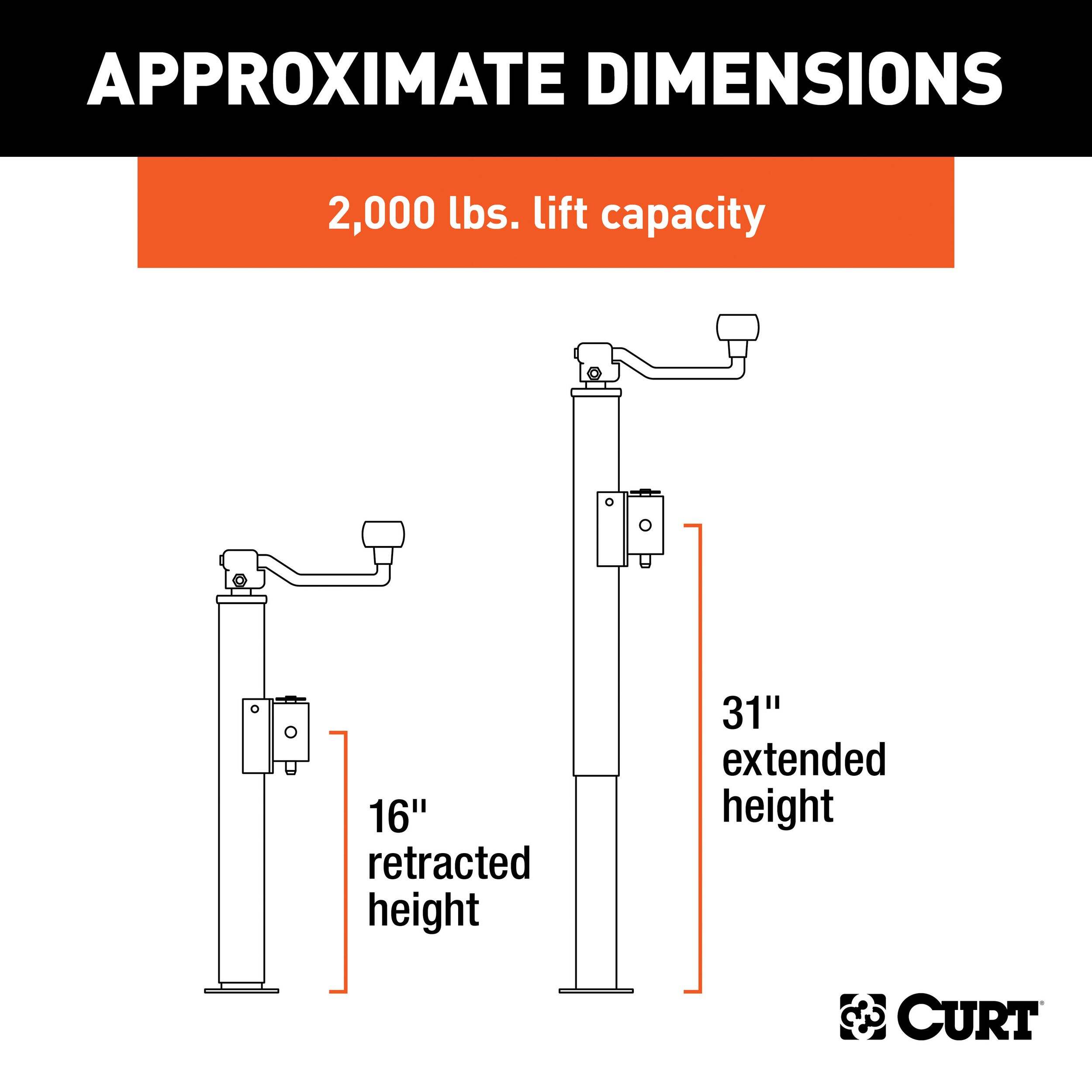 In our goal of being your best source for all things towing, the CURT line of trailer jacks is designed with care and manufactured with pride. CURT jacks are made with quality to promote the life and function of your trailer, and they come in several different styles to accommodate your needs, whether you are a frequenter of the boat landing, the campground, the racetrack or the field. CURT swivel jacks get their name from the pull-pin swivel feature that allows the jack to pivot on its mounting bracket and swing up and out of the way for travel. Our swivel trailer jacks are broken into two categories: pipe mount and bracket mount. This CURT pipe mount swivel jack features a support capacity of 3,000 lbs., a lift capacity of 2,000 lbs. and a travel of 15". With a jack foot plate welded on the bottom, this type of jack also provides added stability for your trailer on rough terrain. It comes with a top-wind handle and includes a weldable pipe with a 9/16" hole for secure mounting. It does not matter what kind of trailer you tow -- a boat trailer, utility trailer, livestock hauler or recreational vehicle trailer -- if you have a receiver-style trailer, you will want a jack that complements its function. For a trailer jack that will not steer you wrong, CURT has the answer.