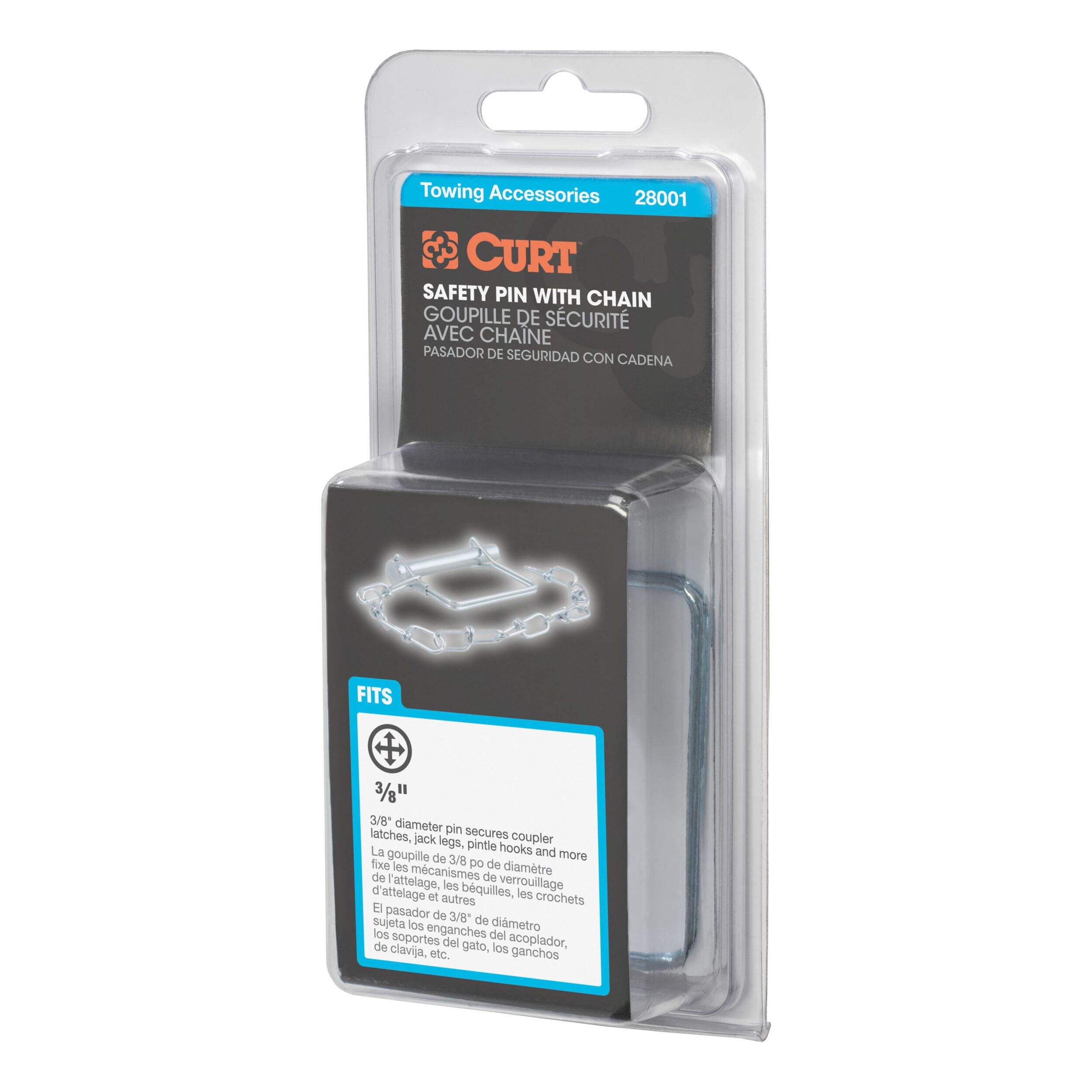 CURT safety pins go beyond the simple function of keeping your coupler latch secure. They are constructed from quality materials and have a universal design that allows them be used for a variety of purposes in your towing setup. CURT safety pins are made from solid steel to provide more than enough strength to keep your trailer coupler latched down tight. The zinc plating that we use to finish our safety pins offers excellent protection against rust and corrosion. This is necessary for any trailer because of its frequent exposure to the elements. The user-friendly design of our safety pins allows them to be easily handled while maintaining effective security. This safety pin has a pin diameter of 3/8" and includes a 12" chain attachment to mount onto your trailer coupler and prevent the safety pin from being misplaced. Use CURT safety pins for securing trailer couplers, jacks, caster wheels and more. When you couple your trailer to your vehicle, nuts and bolts just do not cut it. Secure your towing equipment right with a safety pin from CURT.