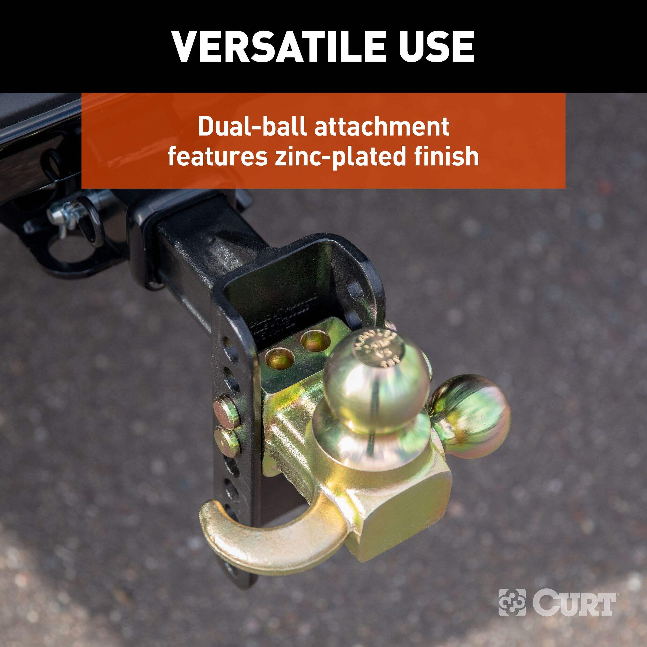 Enhance your towing experience with the versatility of the CURT 45904 Adjustable Trailer Hitch Ball Mount, Tow Hook Step. Designed to cater to different towing needs, the mount features two ball sizes and an integrated tow hook for vehicle recovery and straight-line pulls. Ideal for mounts on trailer hitches with a 2-in x 2-in receiver tube opening, this trailer hitch ball mount with adjustable shank is a great choice for towing.