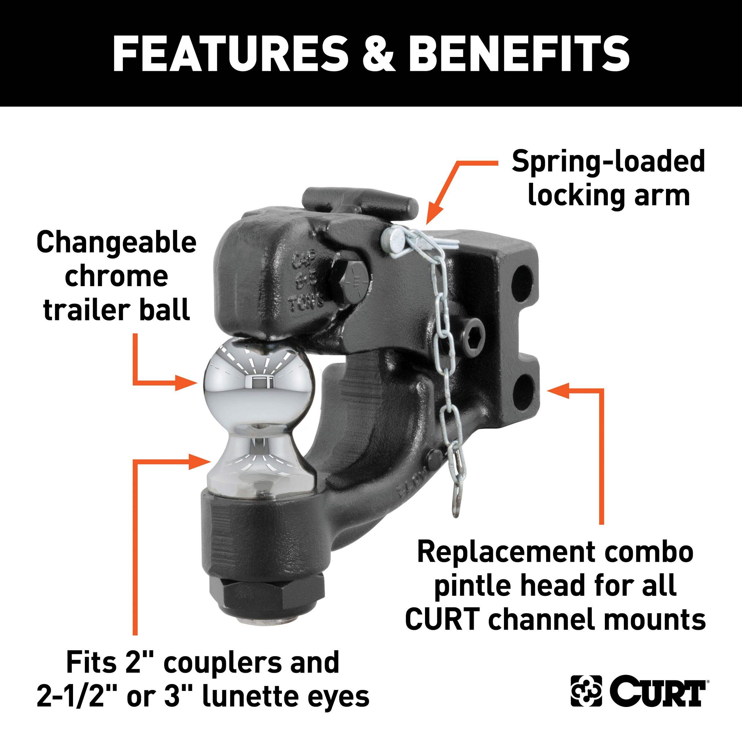 This replacement ball and pintle combination head offers versatile towing options and is designed to fit any CURT adjustable channel mount shank. It features a standard 2-inch diameter trailer ball to fit any 2-inch trailer coupler. With its integrated spring-loaded arm, the ball-pintle combination can also be coupled to a 2-1/2-inch or 3-inch lunette ring (inside diameter). The entire head securely attaches to any CURT adjustable channel mount shank. NOTE: Includes pintle attachment only. Channel mount sold separately.