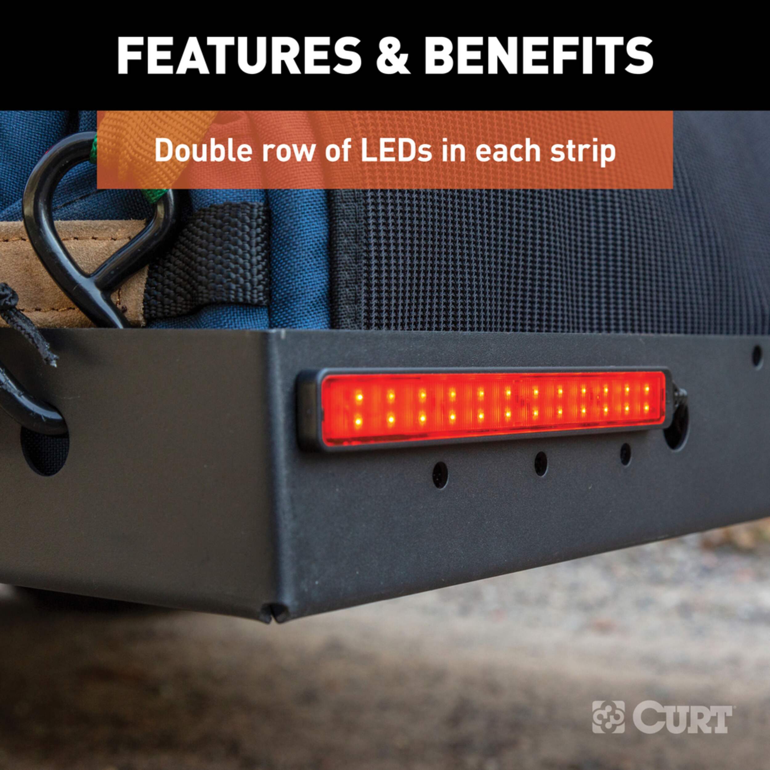 CURT auxiliary LED indictor lights are the perfect way to add visibility and safety to a hitch cargo carrier, bike rack or other towable accessory. They easily plug into your 4-way flat connector and feature a double row of LEDs to correspond to the brake lights, turn signals and running lights. These automotive LED light strips also come with a 3M adhesive backing that allows them to be installed on a variety of surfaces. Simply stick them on! The LED light housings are waterproof and durable to easily resist the weather and outdoor elements.