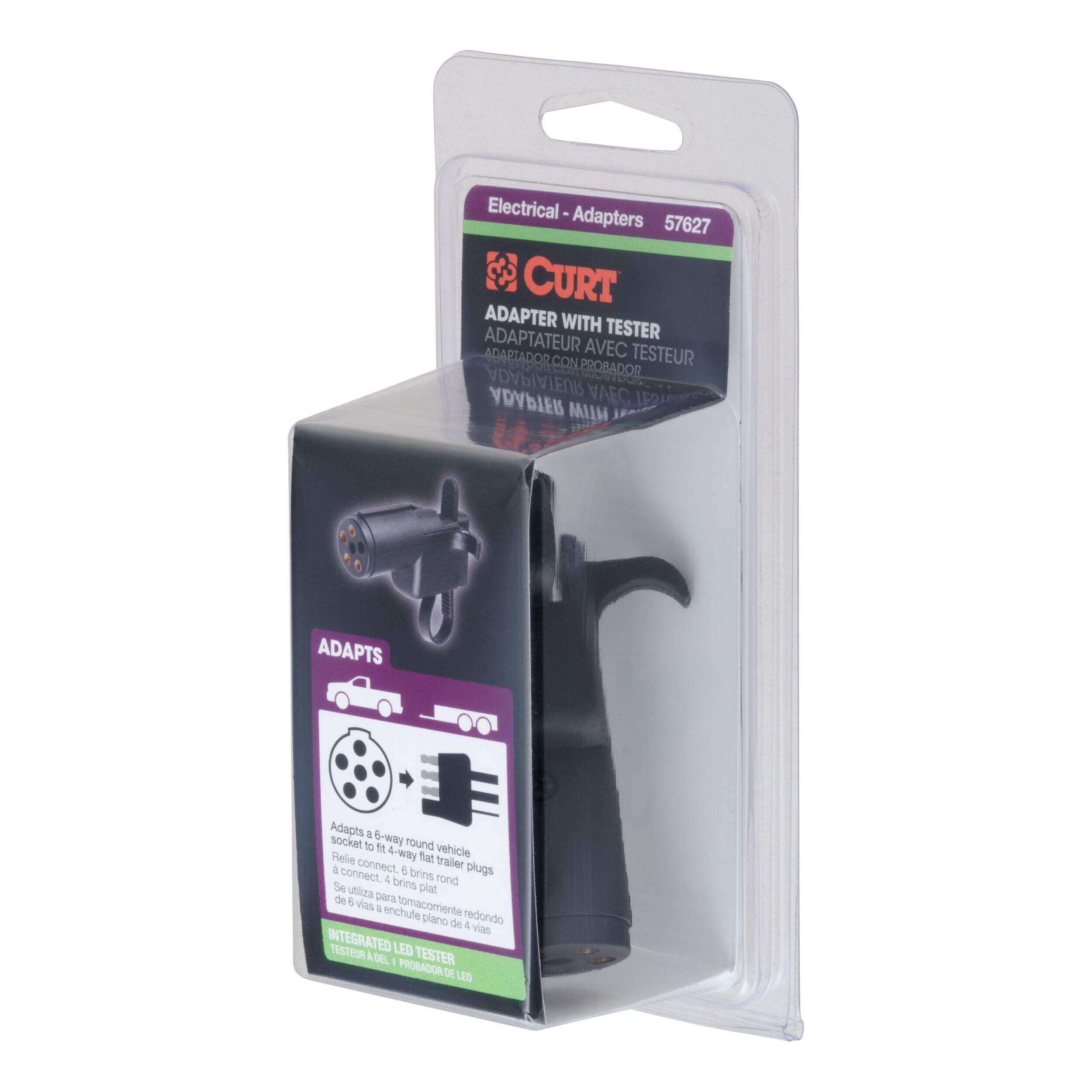 There are several different types of connectors used to supply power from a tow vehicle's electrical system to a trailer's wiring system. Some trailers only need the bare essentials -- running lights, brake lights and turn signals -- while others require a connection for reverse lights, electric brakes and auxiliary power. With connectors ranging from simple to complex, it may be the case that the connection between your vehicle and your trailer is not a perfect match. For example, your truck may be equipped with a 6-way round socket, but your trailer may have a 4-way flat plug. For this very common problem, CURT offers a quick and simple solution in the form of an electrical adapter. An adapter is an electrical device that allows a connection to be made between a mismatched trailer plug and vehicle socket. It easily plugs in your vehicle's electrical socket and usually requires no additional wiring. CURT offers an array of adapters to accommodate most types of plugs and sockets, including 4-way flat, 4-way round, 5-way flat, 6-way round, 7-way RV blades and more. This electrical adapter is designed to adapt a 6-way round vehicle socket to fit a 4-way flat trailer plug. It features quality plastic construction, requires no splicing and comes with an LED connector tester dust cover. Not only does this dust cover protect the socket from dirt, water and road grime, but it also allows you to test your vehicle-side wiring connector to ensure your electrical systems are functioning properly. All CURT wiring and electrical products come with a one-year limited warranty to give you the assurance you need to tow with confidence.