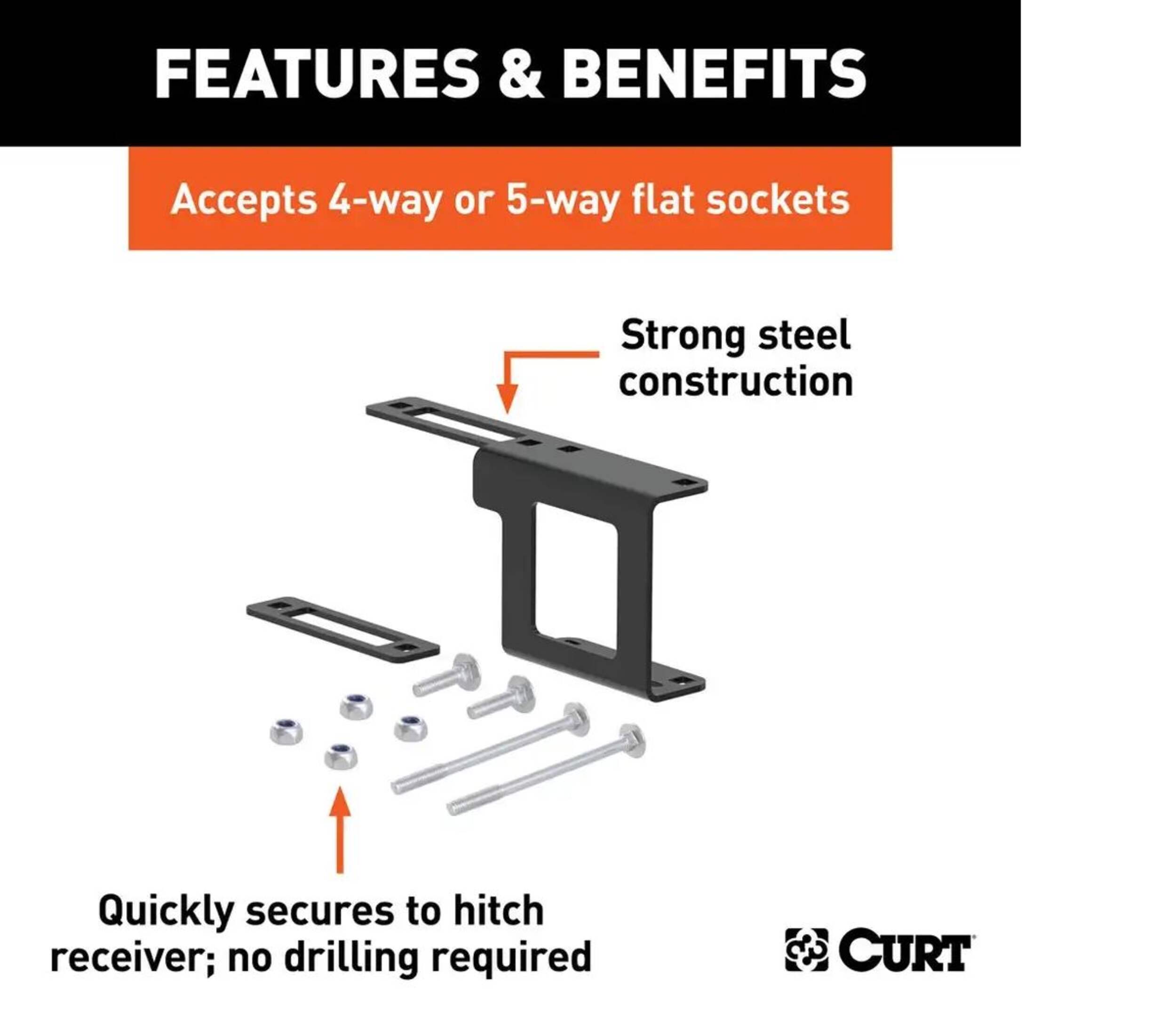 CURT electrical connector brackets provide a simple solution for mounting wiring to your trailer hitch or the rear of your vehicle. Connector wires can be a nuisance when they are just lying around. They can get tangled up with cargo and even damaged. An electrical connector left to hang off the back end of your vehicle is an even greater hazard. Secure, protect and optimize the use of your electrical connector by mounting it with a CURT connector bracket. CURT Easy-Mount™ electrical brackets are an especially convenient option for mounting your connector wiring to your trailer hitch. They mount over the opening of the receiver tube and are held secure using a set of independent screws, meaning there is no drilling or clamping required. Easy-Mount™ brackets feature solid steel construction, so they will not crack or break like competitive products. This particular CURT Easy-Mount™ electrical bracket is designed to fit over a 1-1/4" x 1-1/4" receiver tube opening and provide a sturdy mounting place, right beside your trailer hitch receiver, for a 4-way or 5-way flat electrical connector. When it comes to plugging in your trailer lights, it pays not to skimp out. CURT electrical is the smart way to ensure that your trailer lights and electrical systems are prepared for the road ahead. Keep the power flowing, no matter where your adventures take you, with quality electrical products from CURT.