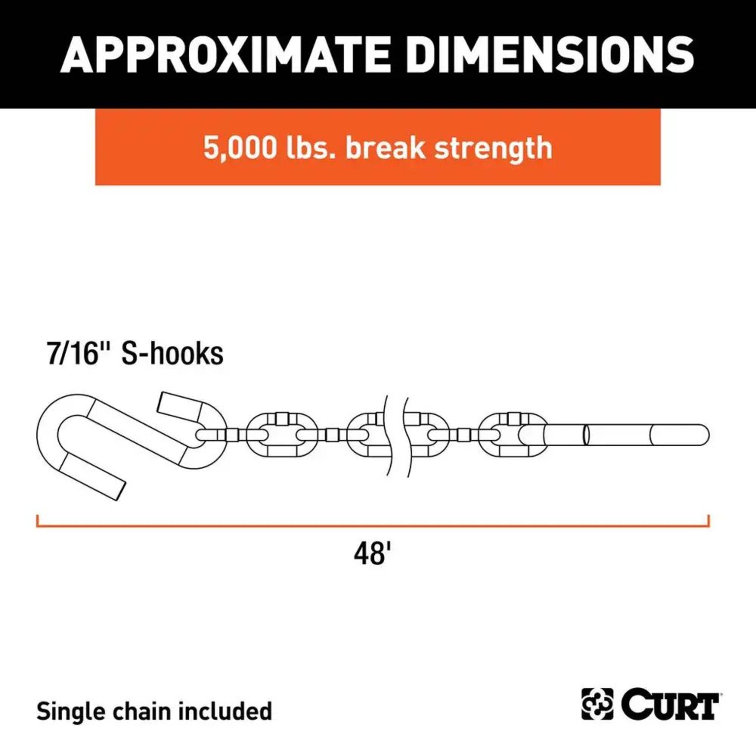 No matter how far you are planning to drive -- down the street or across the state -- using safety chains when you tow is smart, safe and required by law. Without safety chains attached, there is a serious risk of danger if your trailer becomes uncoupled from your trailer hitch. Play it safe with safety chains, and play it even safer with safety chains from CURT. CURT has a few different options when it comes to securing your trailer - This basic safety chain is made from high-quality steel and is grade-30 certified. It is equipped with two sturdy 7/16" S-hooks for reliable coupling to your vehicle and features a minimum break force of 5,000 lbs. Remember, each safety chain assembly connecting your trailer to your vehicle must meet or exceed the gross trailer weight. This CURT safety chain measures a total length of 48" and has chain links with a 1/4" diameter - In our book, making safety a priority when you tow is a must. We offer all the safety equipment needed for successful towing, from our electrical components to our safety chains. The next time you hitch up for an adventure, always Bring It safely with CURT.
