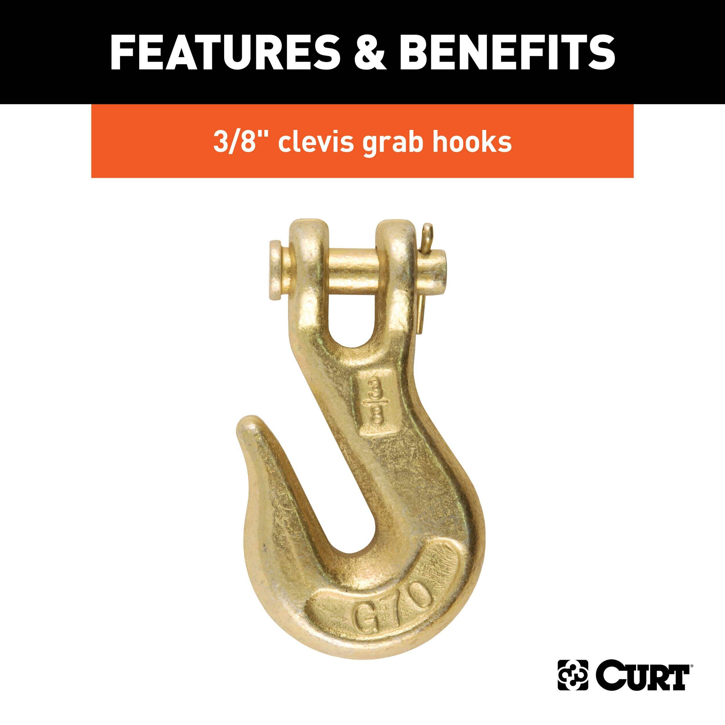 No matter how far you are planning to drive -- down the street or across the state -- using safety chains when you tow is smart, safe and required by law. Without safety chains attached, there is a serious risk of danger if your trailer becomes uncoupled from your trailer hitch. Play it safe with safety chains, and play it even safer with safety chains from CURT. CURT has a few different options when it comes to securing your trailer. In addition to our safety chains and cables, CURT offers heavy-duty chain to accommodate the larger loads of commercial and industrial towing. This transport binder safety chain is constructed from quality steel and is grade-70 certified. It features a minimum break force of 26,400 lbs. and a work load limit of 6,600 lbs. It is also equipped with two clevis grab hooks for a better grip on bulky loads such as construction equipment, building materials and high-powered machinery. This transport binder safety chain has a link diameter of 3/8" and a total length of 14'.In our book, making safety a priority when you tow is a must. We offer all the safety equipment needed for successful towing, from our electrical components to our safety chains. The next time you hitch up for an adventure, always Bring It safely with CURT.