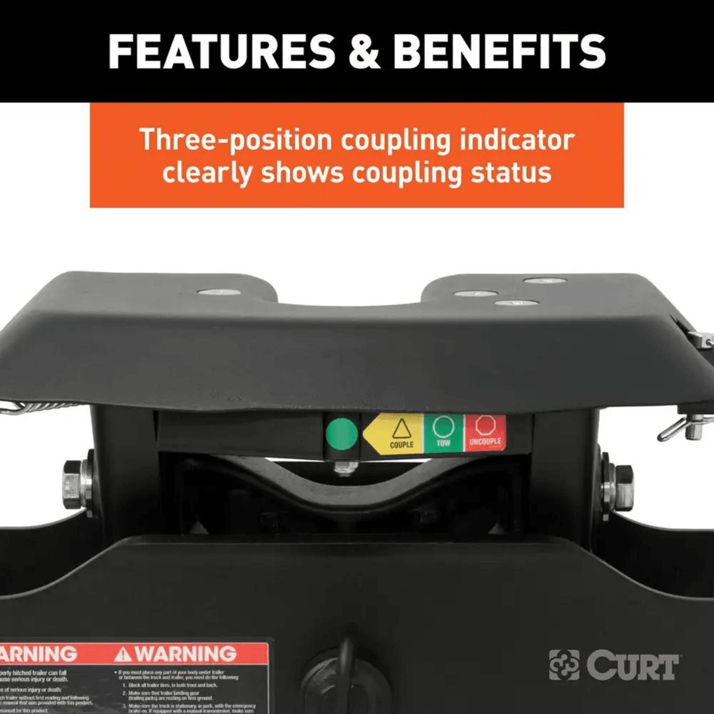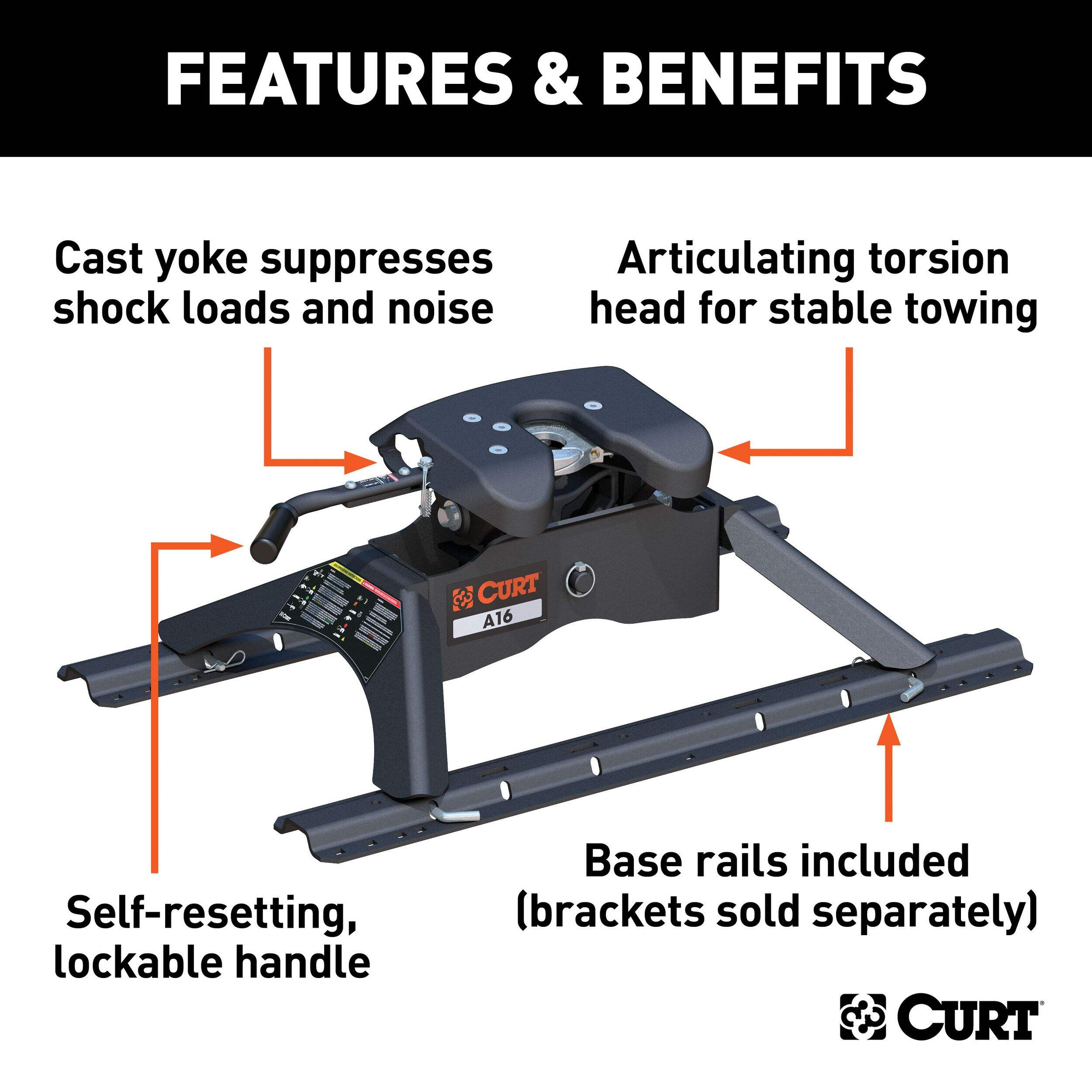 The CURT A16™ is designed to provide a surprisingly quiet ride while maintain superior towing power. It has a gross trailer weight capacity of 16,000 lbs. and can handle a vertical load up to 4,000 lbs. It comes with a three-position coupling indicator visible from your pickup truck cab, an extra wide head for easier coupling and high-strength interlocking die-cast jaws for a secure hold on your 5th wheel trailer. This 16K 5th wheel hitch excels in quiet 5th wheel towing. It uses a fully articulating torsion head, a cast yoke with poly-torsion inserts and interlocking jaws to create stability for your trailer and tow vehicle. These components also allow the A16™ to suppress shock and vibrations and reduce any additional noise coming from your trailer. Like the other CURT A-Series™ hitches, the A16™ is coated with a durable carbide powder coat finish. It is tested in accordance with SAE J2638 for safety and includes a limited lifetime warranty to make this the best hitch ever to be mounted in the back of your pickup. This A16™ 5th wheel hitch comes with a set of industry-standard 5th wheel legs and 5th wheel rails to be mounted in your truck bed with a 5th wheel bracket kit (brackets sold separately).