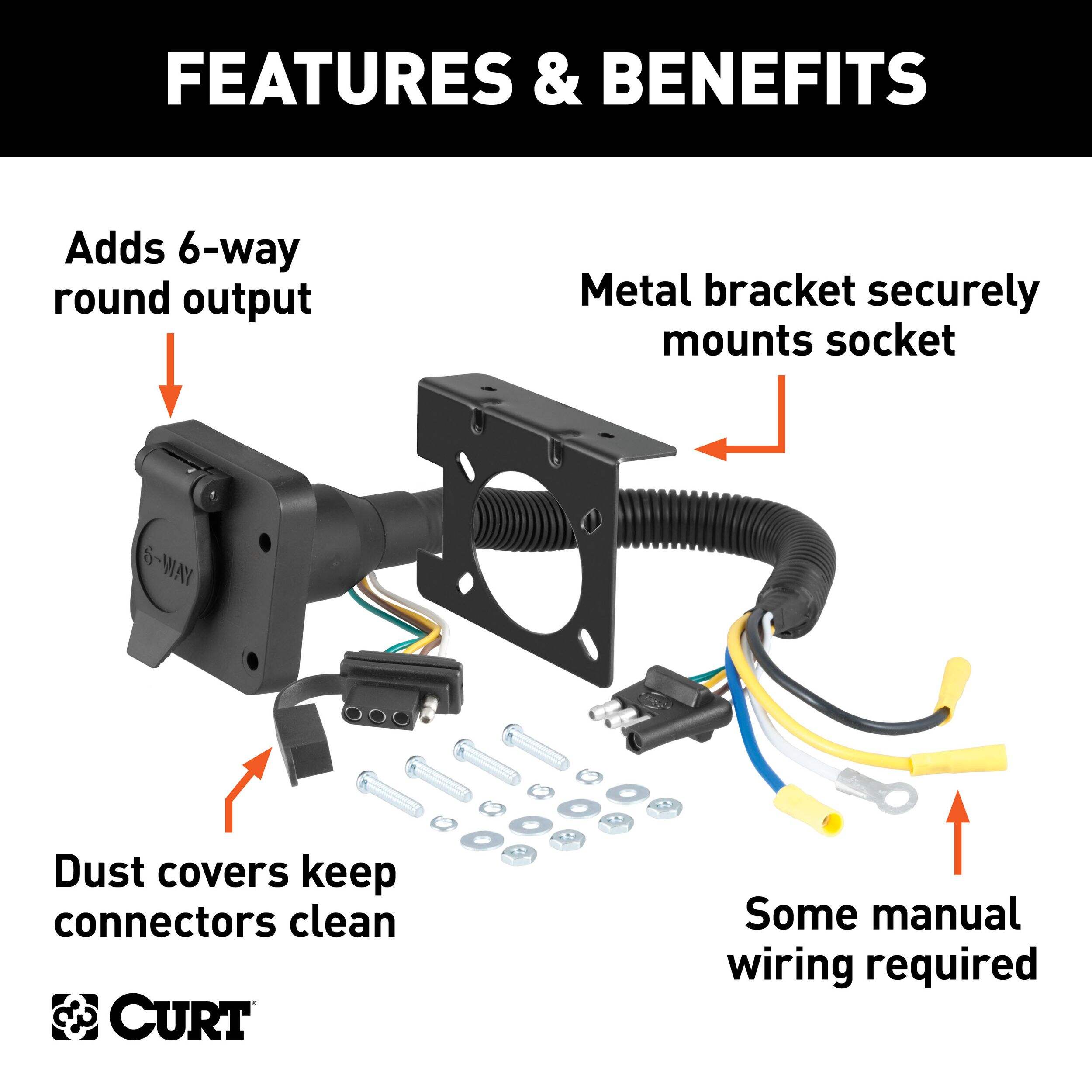 There are several different types of connectors used to supply power from a tow vehicle's electrical system to a trailer's wiring system. Some trailers only need the bare essentials -- running lights, brake lights and turn signals -- while others require a connection for reverse lights, electric brakes and auxiliary power. With connectors ranging from simple to complex, it may be the case that the connection between your vehicle and your trailer is not a perfect match. For example, your truck may be equipped with a 6-way round socket, but your trailer may have a 4-way flat plug. For this very common problem, CURT offers a quick and simple solution in the form of an electrical adapter. An adapter is an electrical device that allows a connection to be made between a mismatched trailer plug and vehicle socket. It easily plugs in your vehicle's electrical socket and usually requires no additional wiring. CURT offers an array of adapters to accommodate most types of plugs and sockets, including 4-way flat, 4-way round, 5-way flat, 6-way round, 7-way RV blades and more. This special dual-output electrical adapter is actually designed to adapt a 4-way flat vehicle socket to fit multiple trailer plugs, including a 4-way flat and a 6-way round connector. Some manual wiring is required. This multipurpose socket also comes with dust covers, a mounting bracket and all necessary mounting hardware for a complete installation. All CURT wiring and electrical products come with a one-year limited warranty to give you the assurance you need to tow with confidence.
