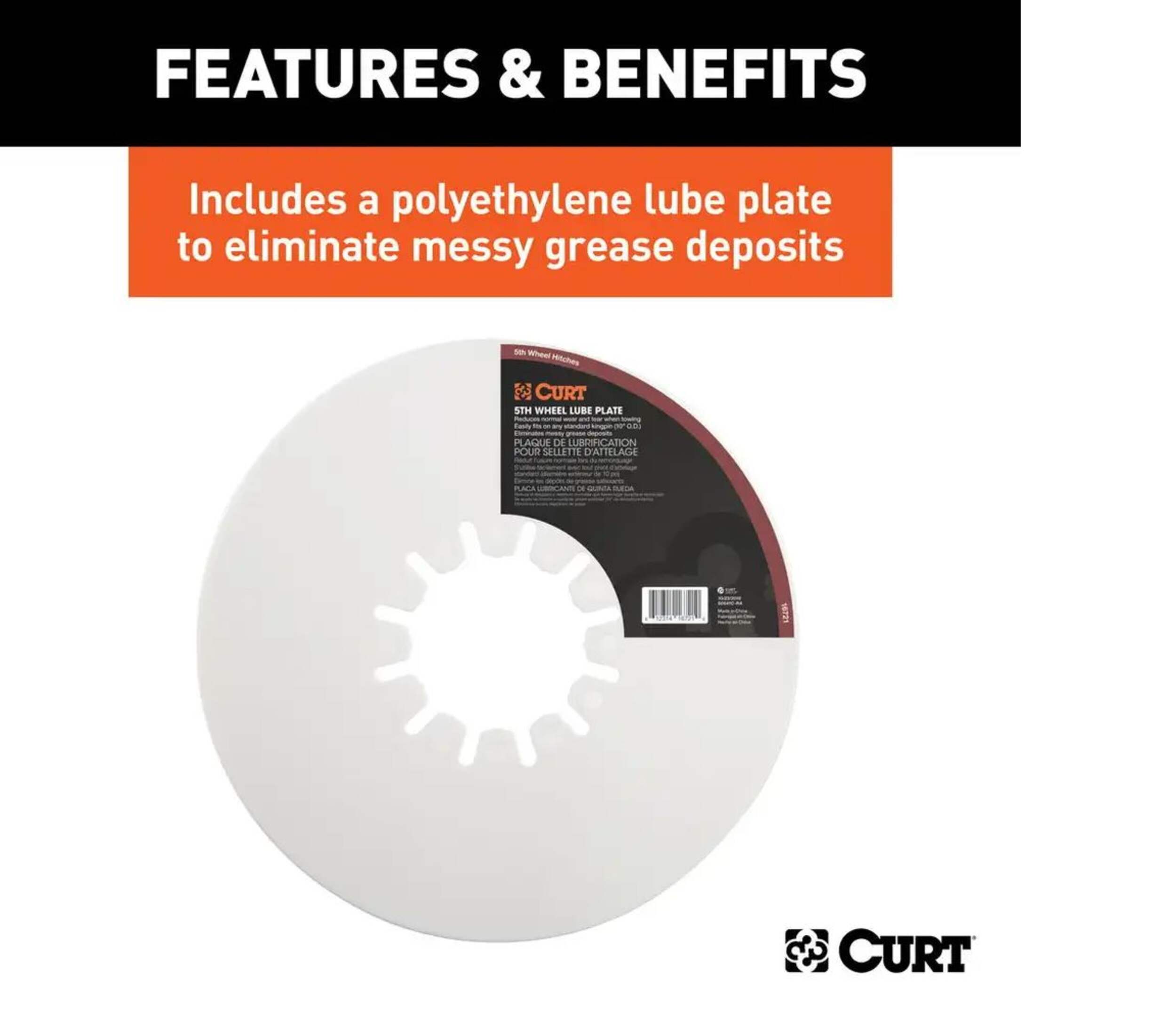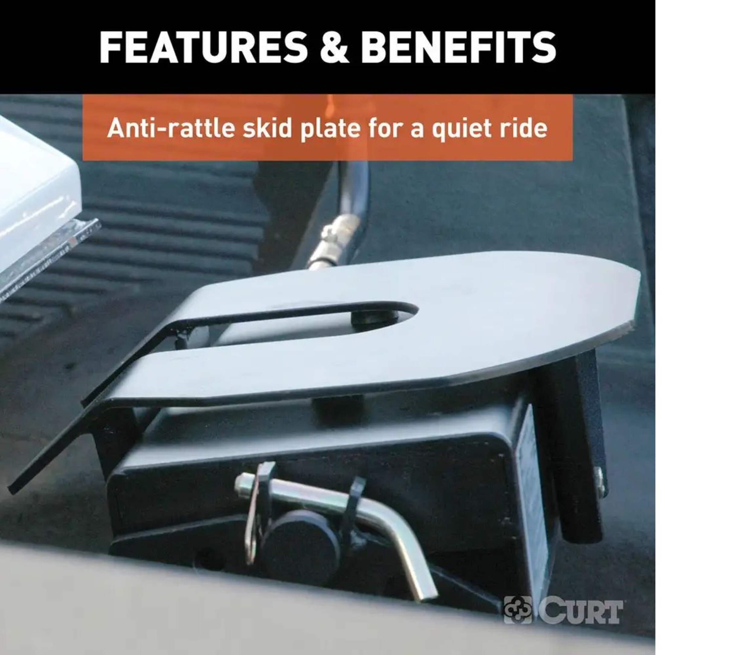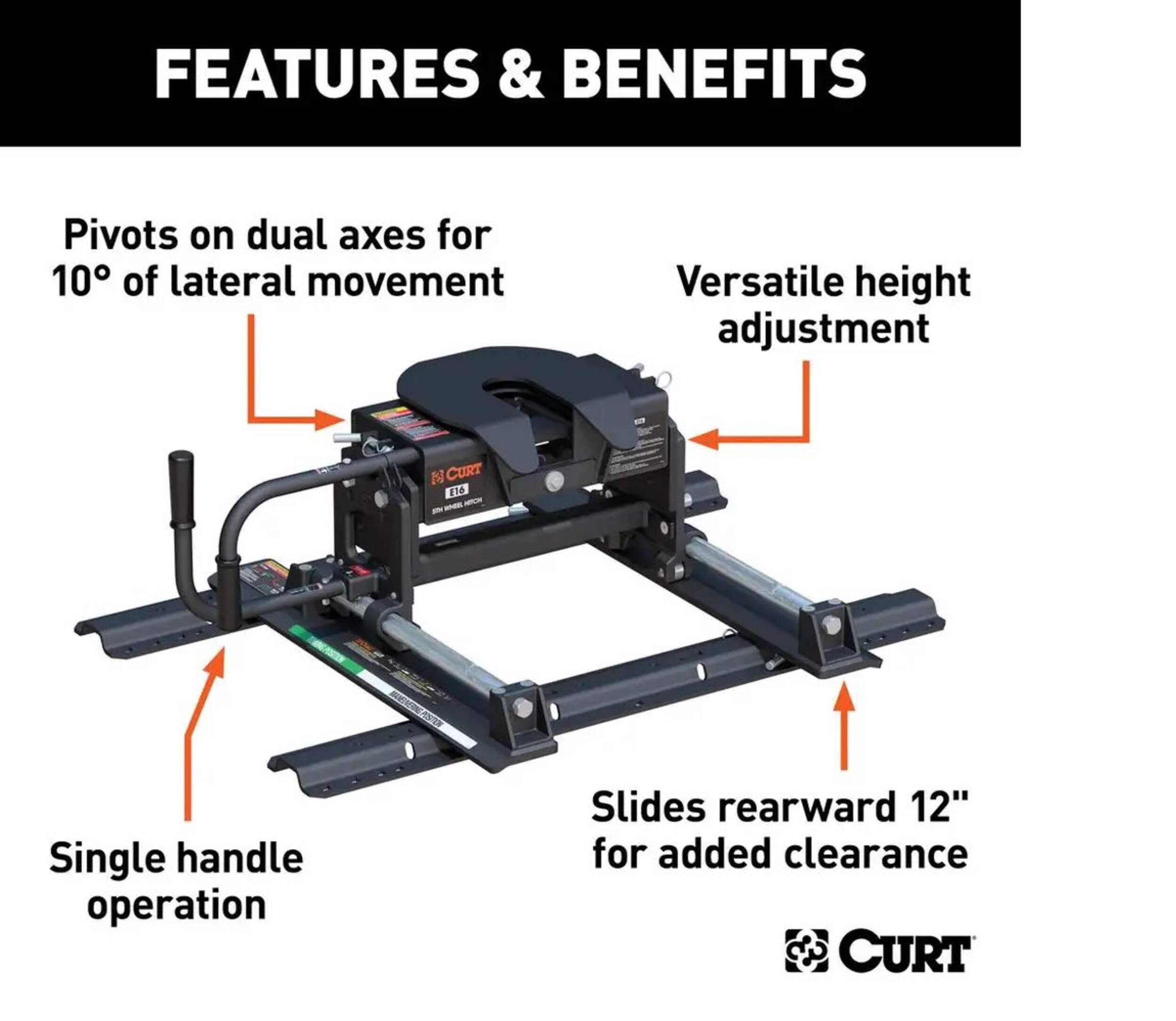 The CURT E16™ 5th wheel trailer hitch is an economical choice that offers many of the same features found in our Q-Series 5th wheel hitches. The E16™ has a gross trailer weight rating of 16,000 lbs. and can withstand a vertical load up to 4,000 lbs. It comes with a dual-pivoting head, 10 degrees of lateral movement and an anti-rattle skid plate to provide a smoother, quieter ride. The E16™ also comes with easy, single-handle operation and a durable carbide powder coat for long-lasting protection against the elements. With four height adjustment settings, the E16™ is quick and simple to install, and it is backed by a limited lifetime warranty. This 16K 5th wheel hitch head comes attached to the CURT R16™ slider and a set of 5th wheel rails to be mounted in your truck bed using a 5th wheel bracket kit (brackets sold separately). CURT 5th wheel sliders feature solid construction and offer a sturdy mounting place for your 5th wheel hitch, ensuring that none of its towing strength is lost. CURT 5th wheel sliders are also true rolling units, meaning they actually roll on wheels that bear the weight of the trailer rather than simply sliding on hollow rods as seen in competitive models. With a thick operating handle, the roller smoothly rolls the 5th wheel head forward and back, locking securely into each position as desired. CURT sliders also provide up to 12" of displacement as well, unlike the more common 10", to give you a wide range of motion and plenty of space to get your RV or other 5th wheel trailer around any turn.