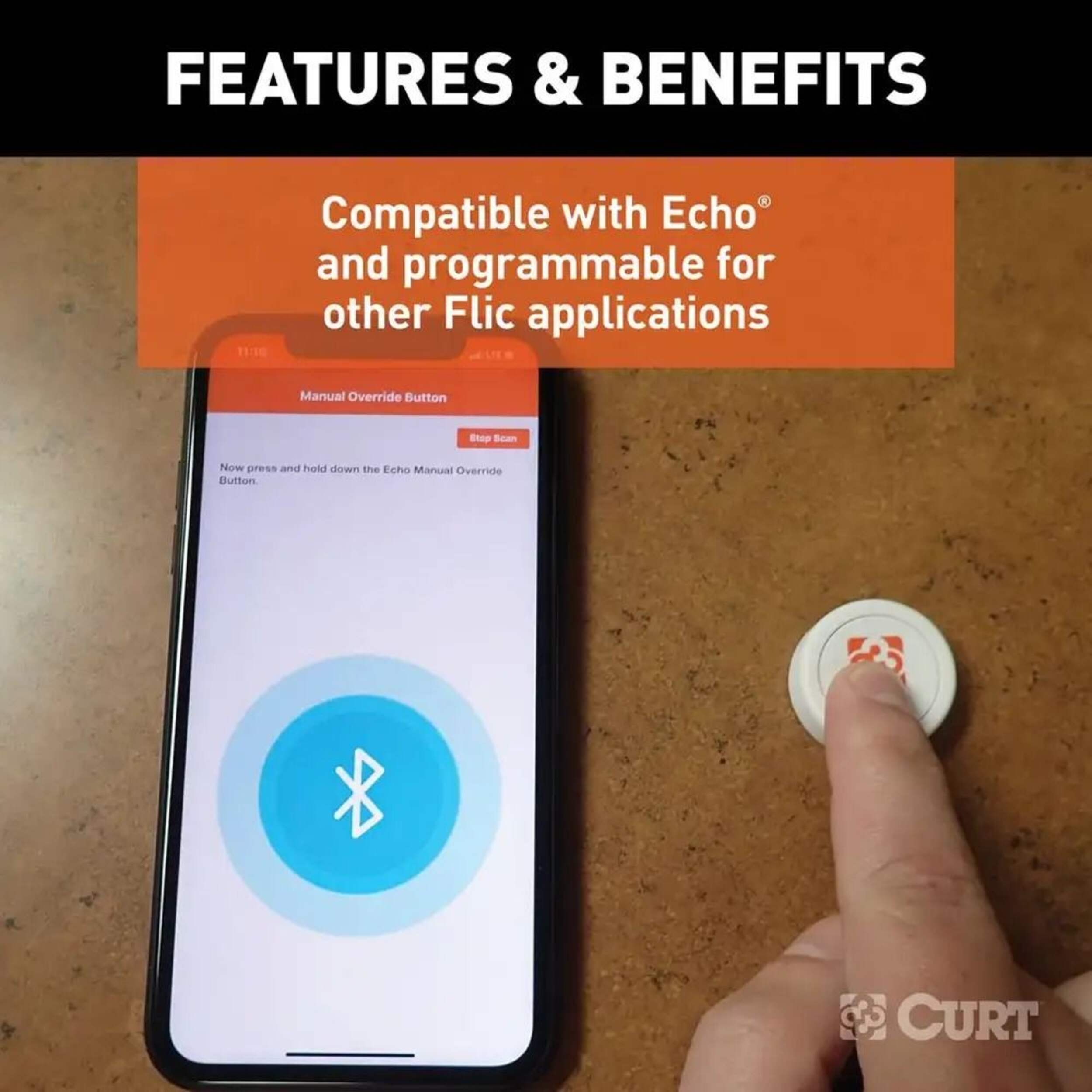 This Bluetooth button for the Echo® brake controller is designed to enable hands-free driving. Whether local laws prevent you from using the Echo® phone app or you simply prefer a manual touch, this button allows you to activate the trailer brakes with the press of a button whenever necessary.This manual override button functions in tandem with any Echo® brake controller and your smartphone. With the button synced using Bluetooth, the Echo® continues to operate the trailer brakes normally, as it does with the Smart Control app. However, instead of using the app interface to manually active the trailer brakes for whatever purpose, this button provides a phone-free experience (Echo® still uses your phone and the app to operate; app must be running for button to operate).The Echo® manual override button is compatible with all Echo® brake controllers and other Flic applications (powered by Flic programmable Bluetooth button). It provides a long-range Bluetooth connection, while maintaining a very low profile on your dash. The overall diameter is only 1-1/8". It comes with a double-sided adhesive pad for a stick-on installation, and a replaceable CR2016 battery.