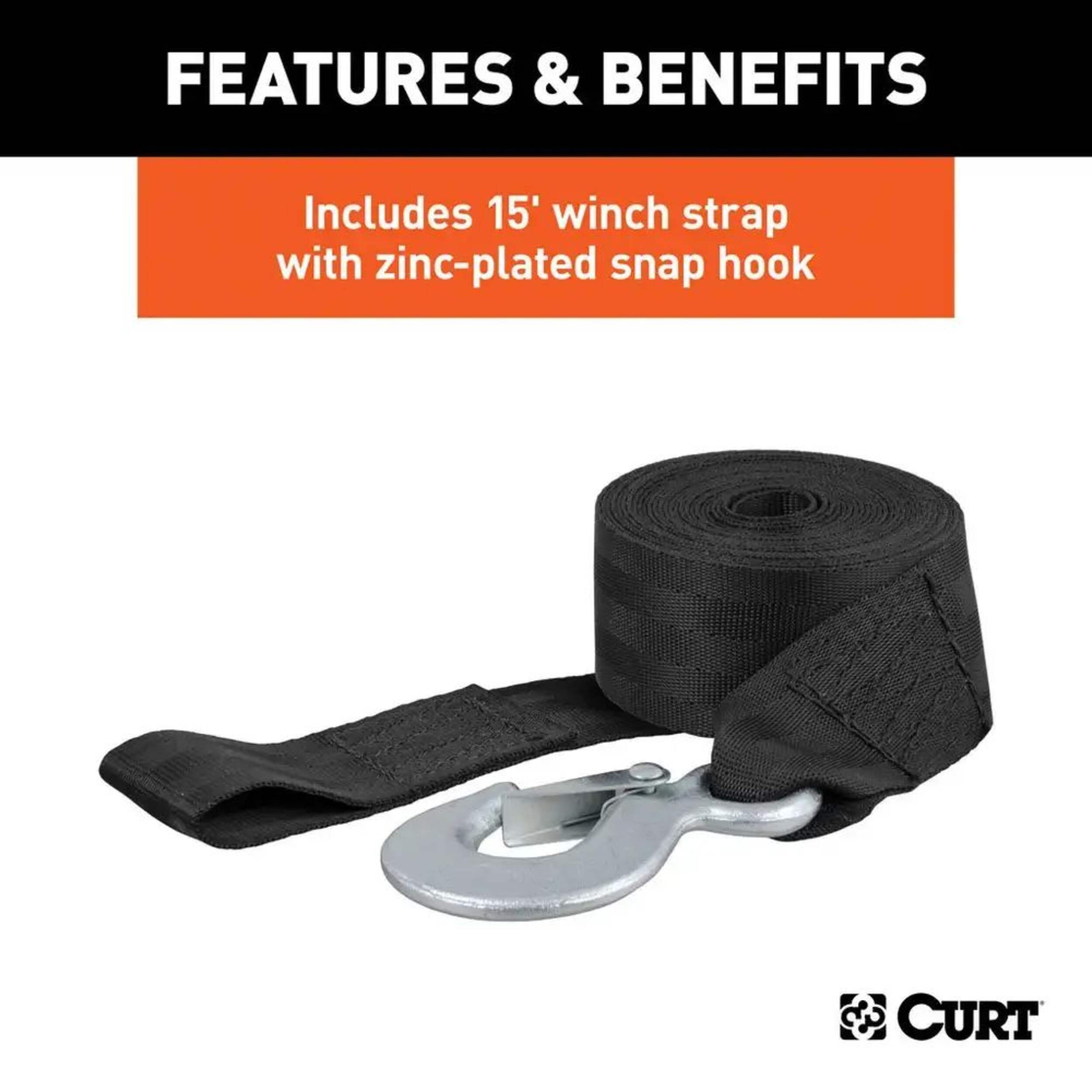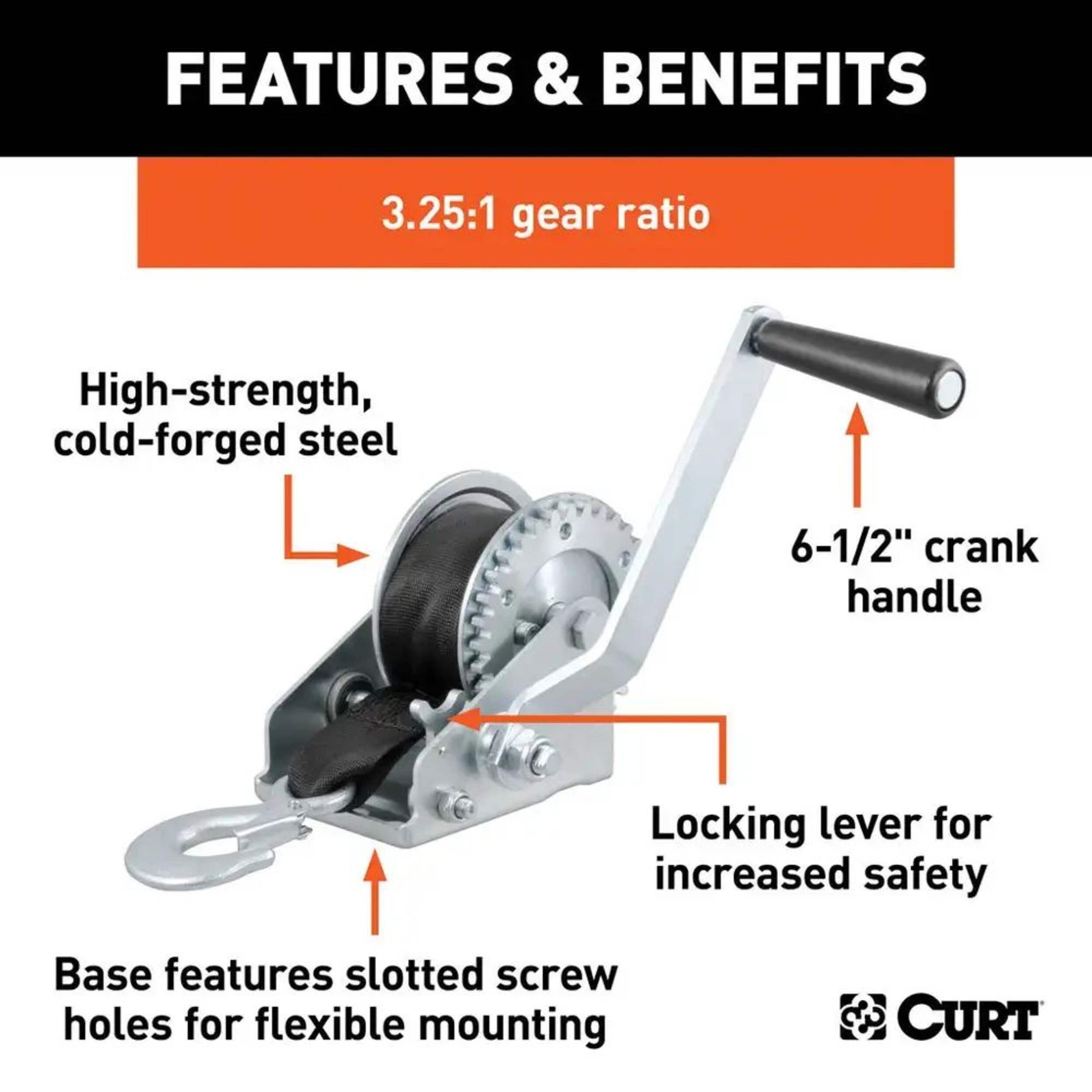 After a full day on the water, you and your crew are tired. It doesn't matter if you were swimming off the back of the pontoon boat, racing around the lake in your speed boat or just casting a line off the side of your fishing boat -- when you get to shore, the last thing you want to deal with is a faulty hand crank on your boat trailer. You want a winch that makes your job easy and that lets you get out of the marina and back home sooner - CURT hand winches are constructed from cold-forged steel to provide structurally superior pinions and eliminate gear-to-shaft bonding failures. They are designed to be mounted on a variety of trailers and are especially useful for boat trailers. CURT boat winches can also serve a number other winch applications, though they are not designed for vehicle towing. This CURT hand winch or boat winch features a capacity of 900 lbs. with a gear ratio of 3.25:1. It has a hub diameter of 3/4" and a handle length of 6-1/2". It also comes with a 15' winch strap and zinc-plated snap hook.