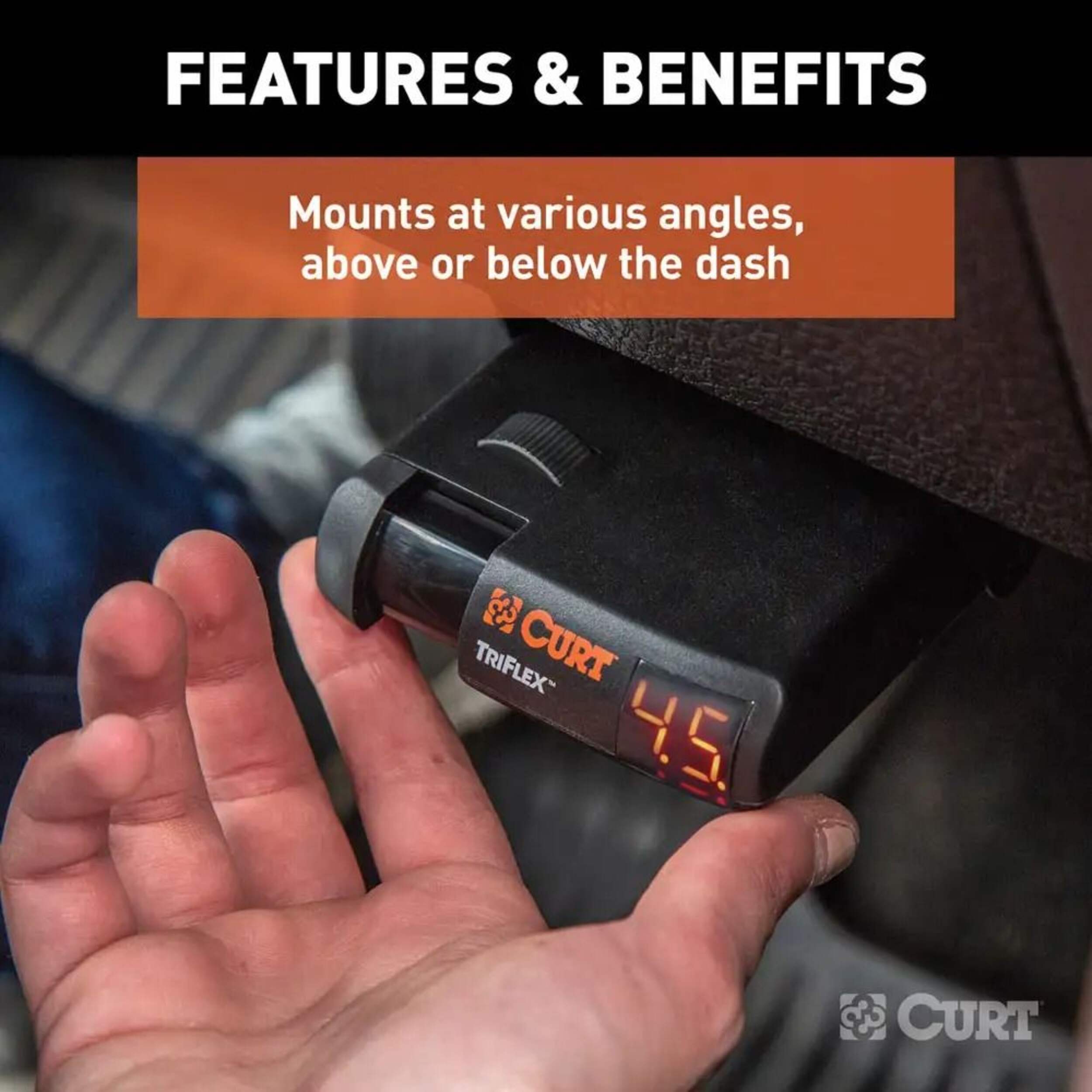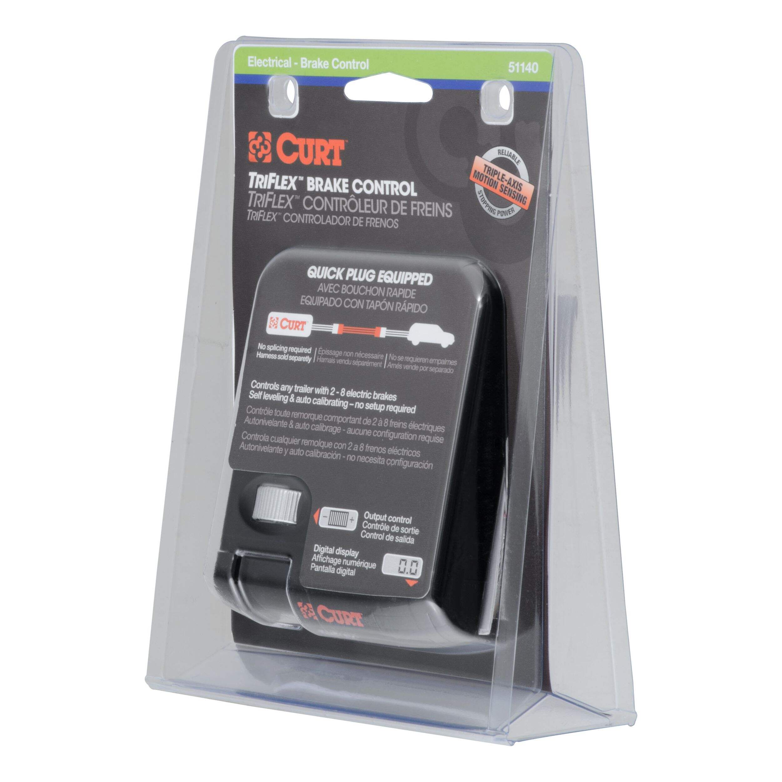 The TriFlex™ proportion-based brake controller features a compact size, a digital display and the ability to manage up to eight brakes at a time. The feature that sets the TriFlex™ apart from many others is its triple-axis motion-sensing accelerometer. This integrated circuit component allows the TriFlex™ to detect every motion of your vehicle and trailer with exact precision and to then apply the perfect amount of braking power for every situation. The TriFlex™ also automatically adjusts brake output when going up or down a hill and is compatible with anti-lock brakes and cruise control. It comes with a mounting bracket and hardware and can be mounted at various angles on your vehicle's dash. Best of all, like other CURT brake controls, the TriFlex™ is protected by a limited lifetime warranty.This CURT trailer brake controller is designed to work with quick plugs so it can readily plug into your vehicle's original equipment socket. It also includes a mounting bracket and hardware for easy installation. A brake controller should be mounted somewhere on the dash of your vehicle, and we recommend putting it below the steering wheel, either on the right or left side of the steering column. This way the control will not block your view when driving, but it will remain accessible and visible when adjustment is needed