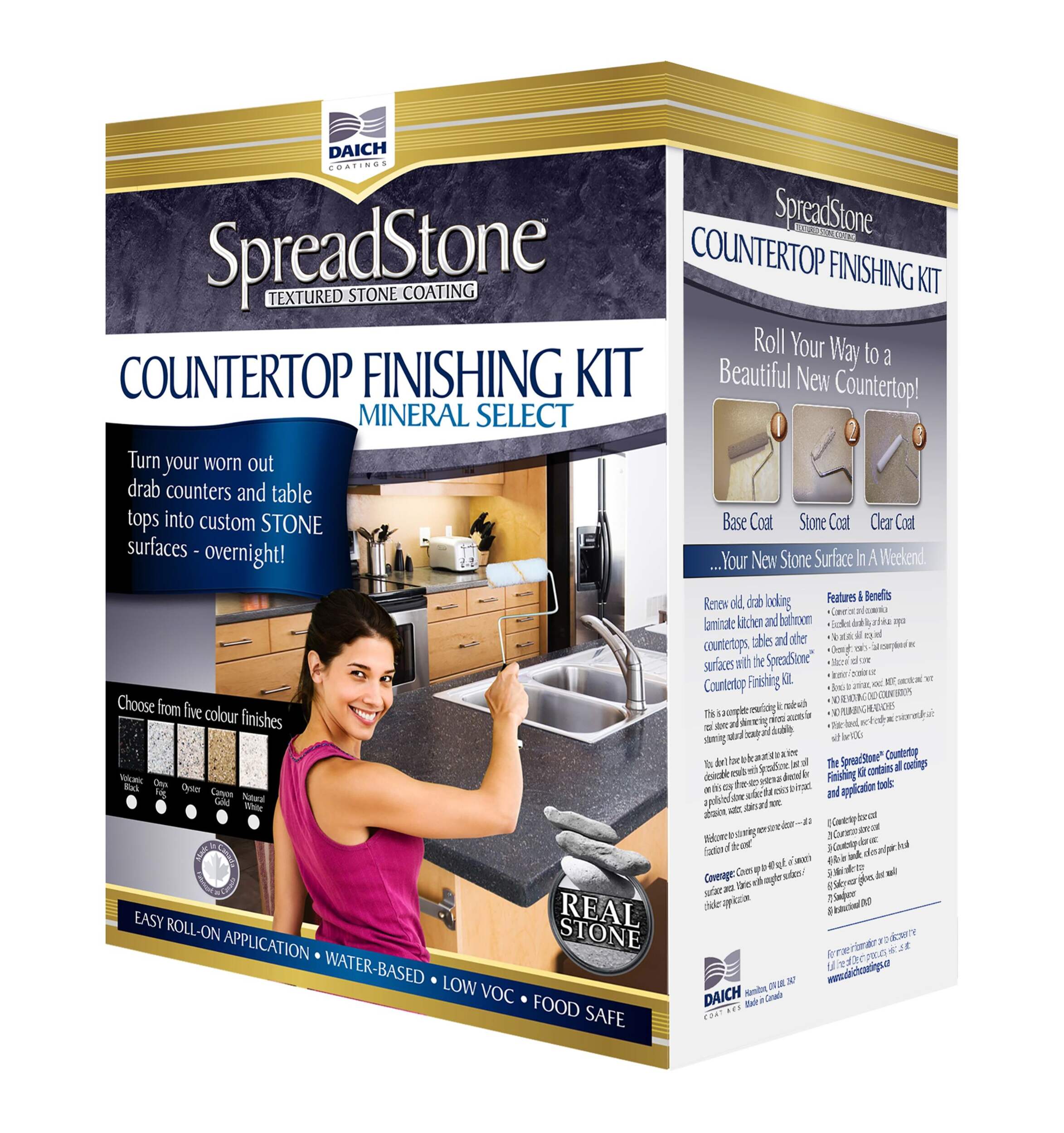 The SpreadStone™ Countertop Kit offers shimmering mineral accents and color highlights found in natural mined rock — and all you do is roll it on! Never before has it been this easy or economical to add the functionality and visual appeal of real premium stone to all kinds of surfaces, without the need for careful artistic skill. Average coverage area for the SpreadStone™ Mineral Select Kit is between 30 sq ft and 40 sq ft (may vary with surface irregularity or application thickness) SpreadStone™ Mineral Select Countertop Finishing Kit is real stone in a unique three-step system that adds an elegant new surface to existing laminate kitchen and bath countertops -as well as old kitchen tabletops, bar tops, coffee tables and other surfaces. The complete process is fast and simple, requiring no special tools or time-consuming creative skills to achieve outstanding results. Simply roll on each layer as directed to achieve decorative and lasting functional surfaces fast. Suitable for direct application to laminates and wood, including plywood, MDF and particle board.