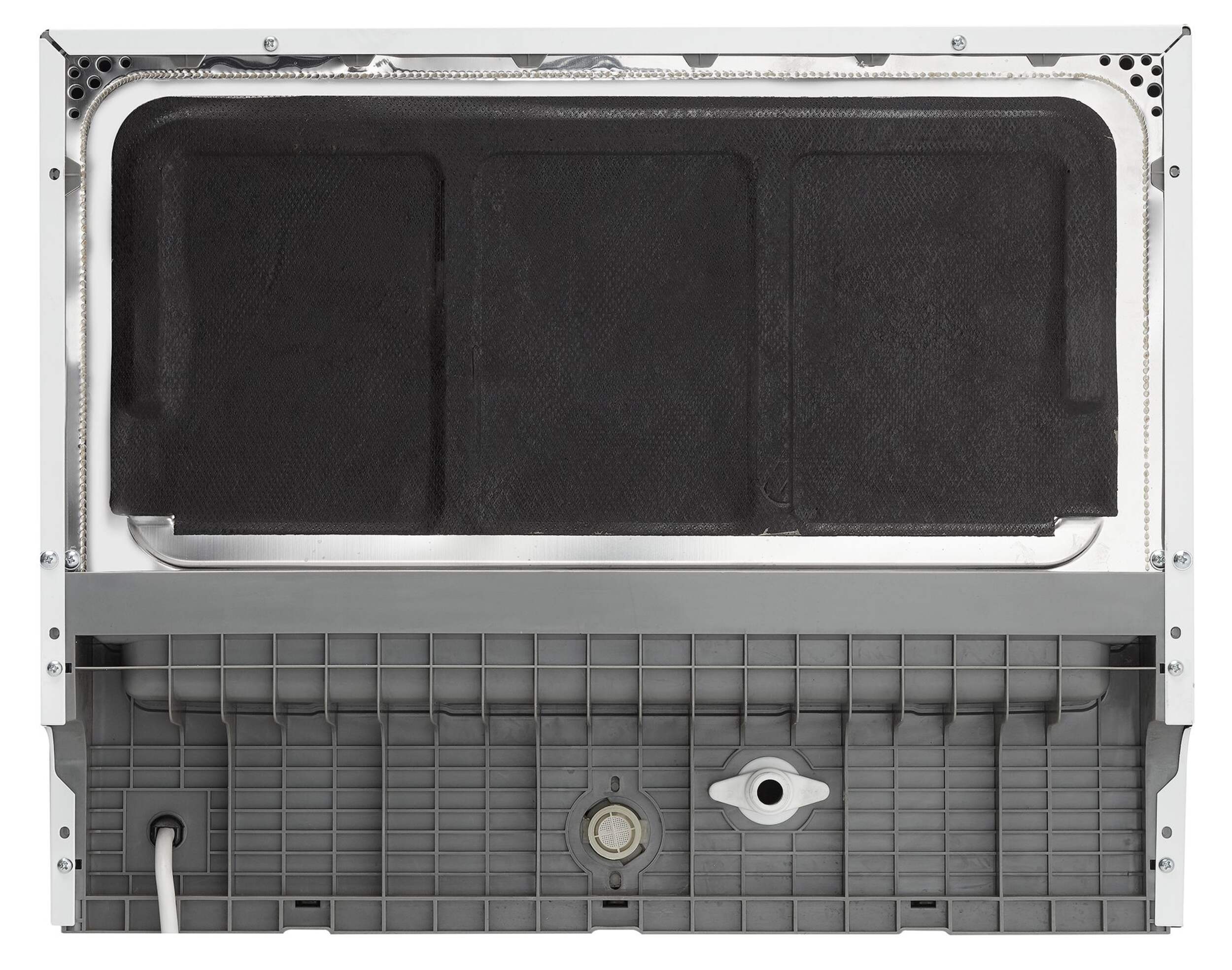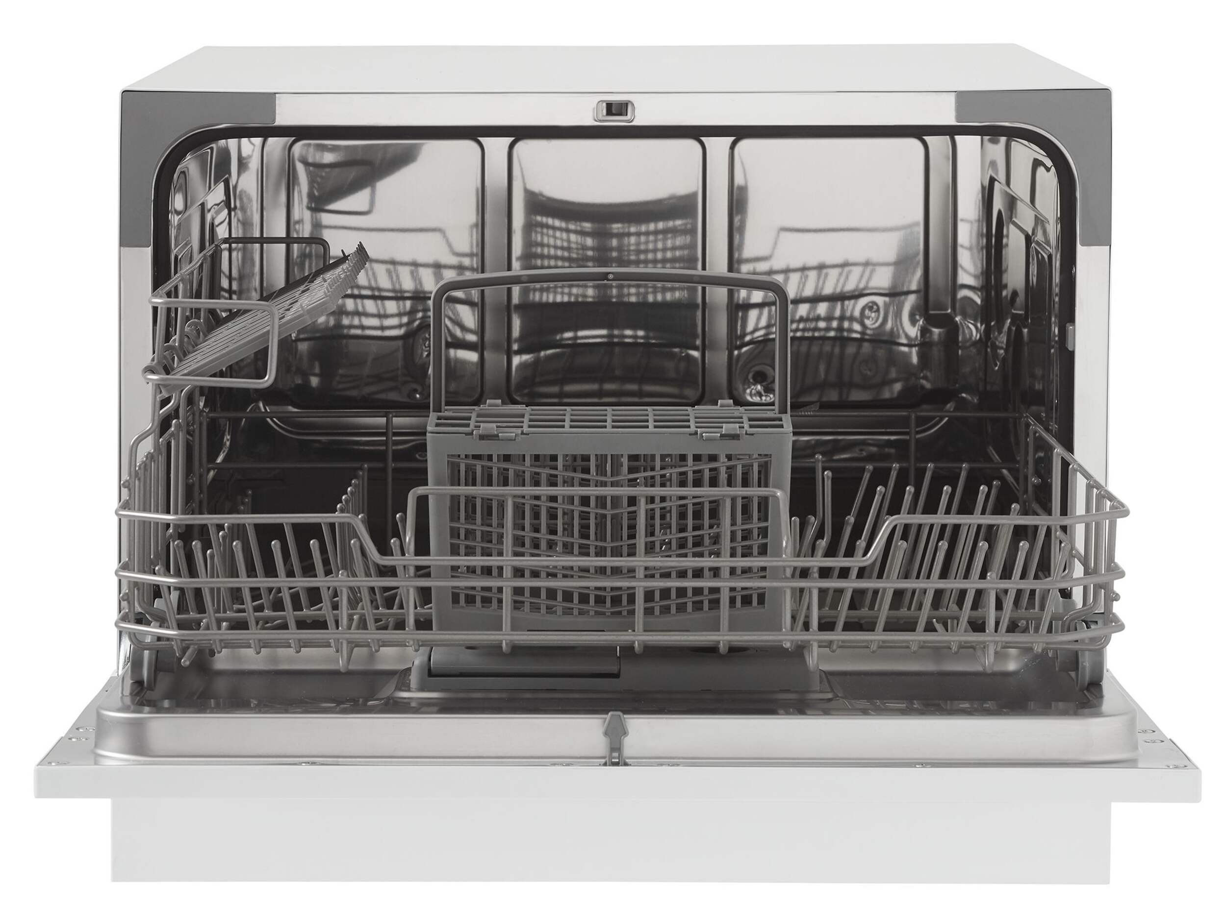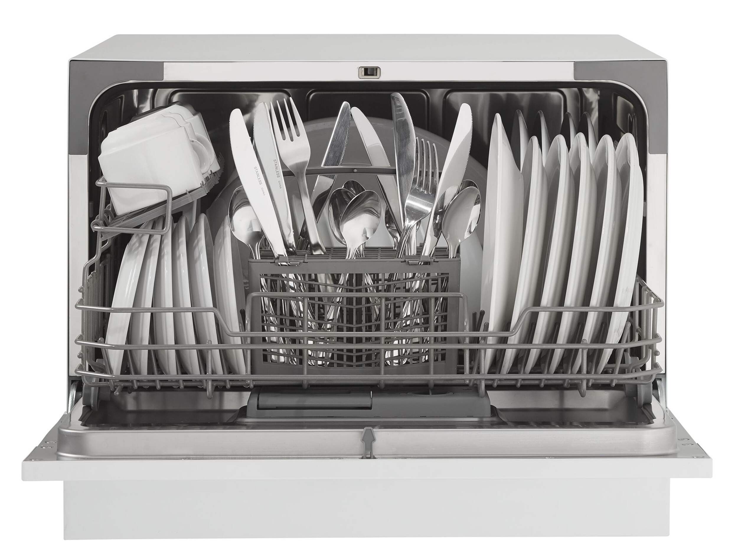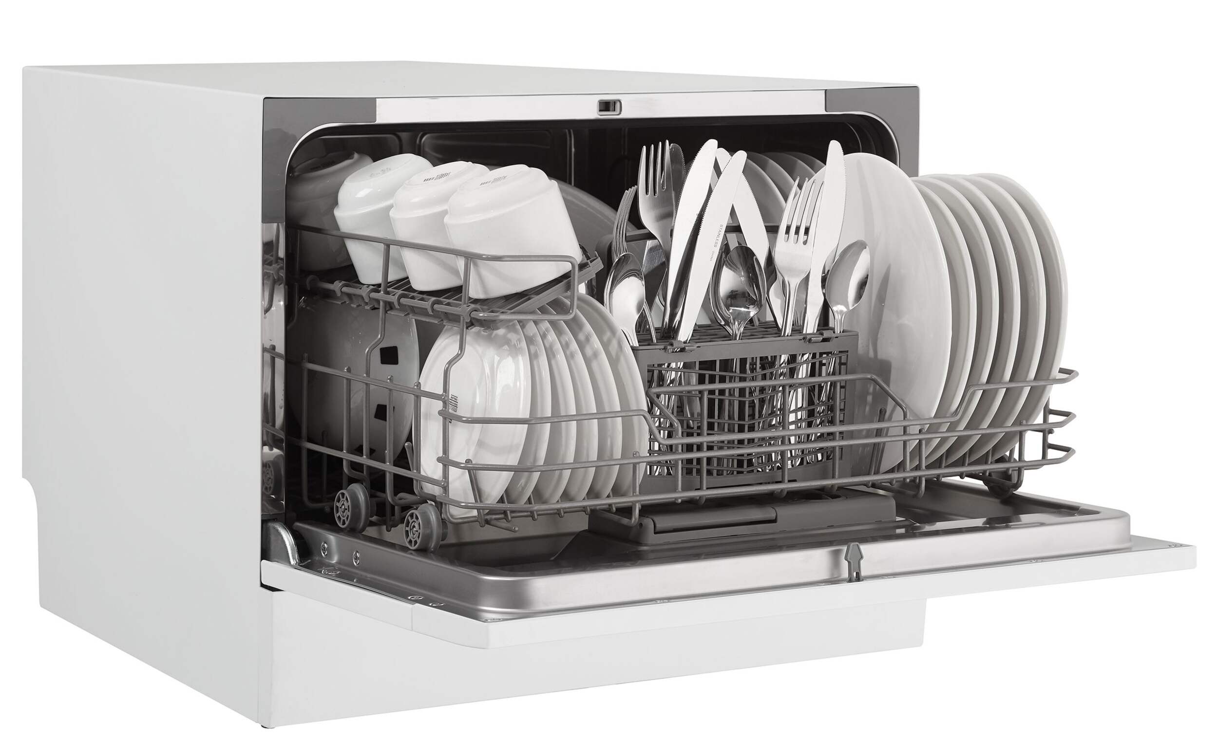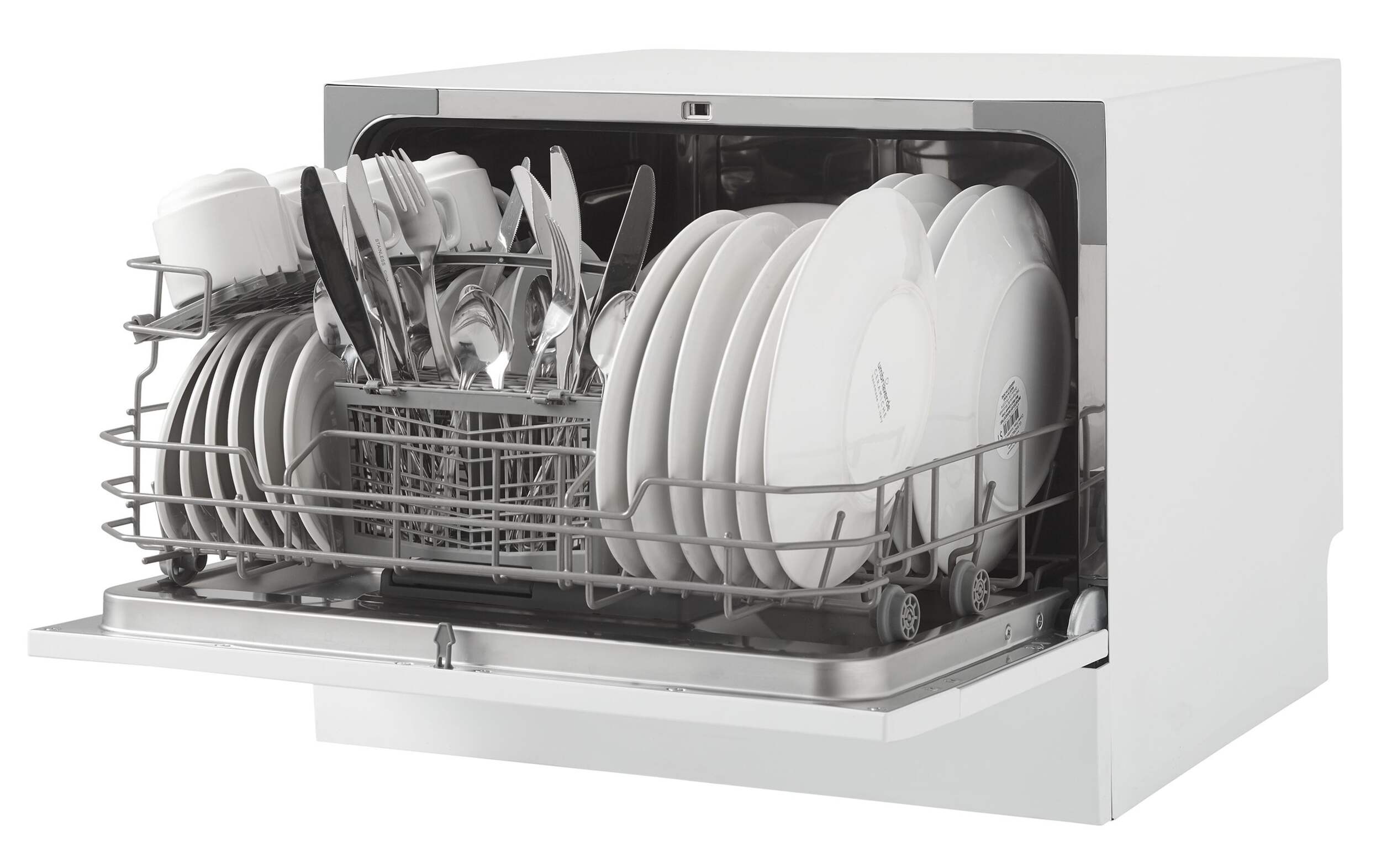 Holds up to 6 place settings and includes a silverware basket
