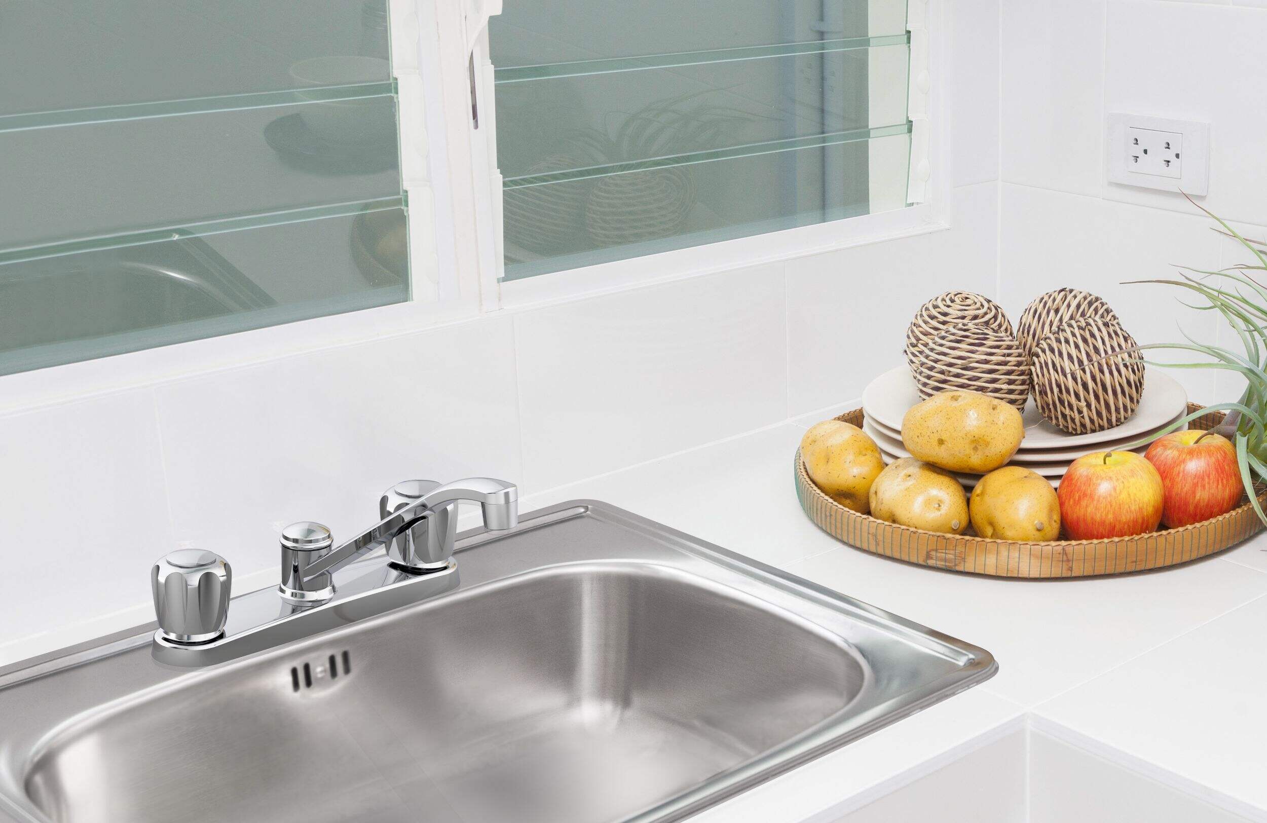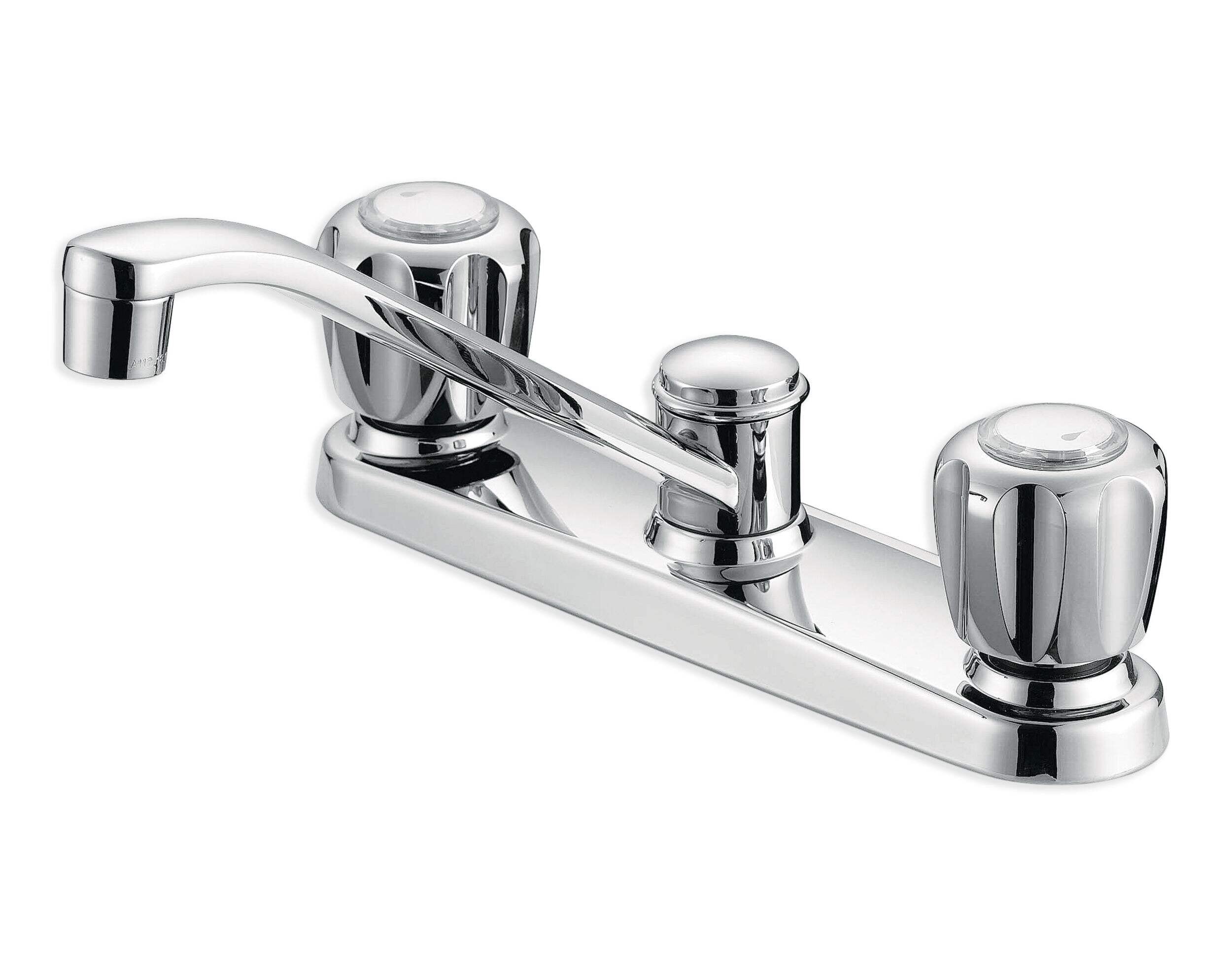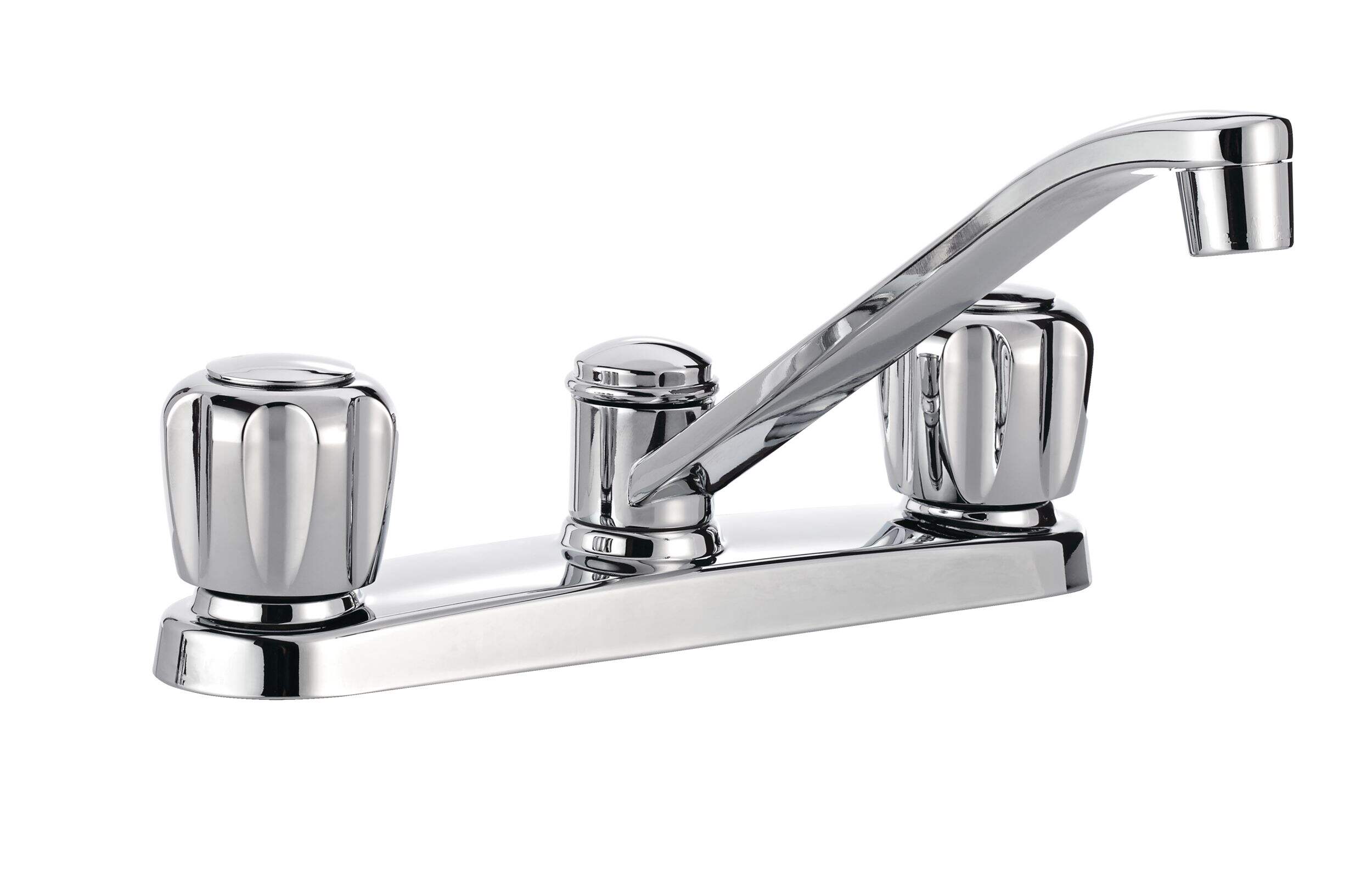 Give your kitchen sink a classic finishing touch with the Danze Double Handle Metal Kitchen Faucet. Featuring a dual handle design and a chrome finish, this kitchen faucet complements different decor styles and blends in seamlessly with your other hardware for a cohesive look. This double handle kitchen faucet has an 8-in spout to easily fill pots or rinse dishes while the drip-free cartridge offers water control and leak-free performance.