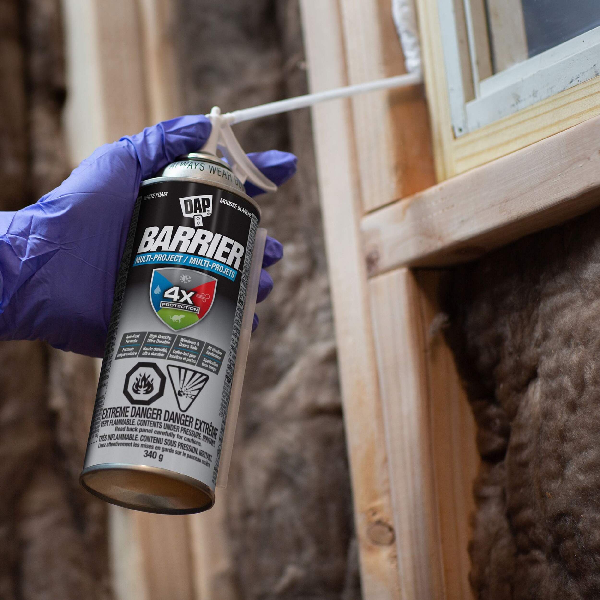 Achieve total protection with DAP Barrier Multi-Project Foam Sealant, providing 4X defense against air, water, fire and pests. This high-density, all-season formula effectively seals small and large gaps and penetrations, including around windows and doors, to keep your home dry and comfortable. It can be applied year-round in temperatures from -6.6°C to 48.9°C. Barrier Foam contains a specialized deterrent to discourage mice and pests from chewing through the barrier. The ultra-durable, bright white material offers exceptional protection. With a reusable adapter and bonus straws, use a single can for multiple projects, reducing waste.