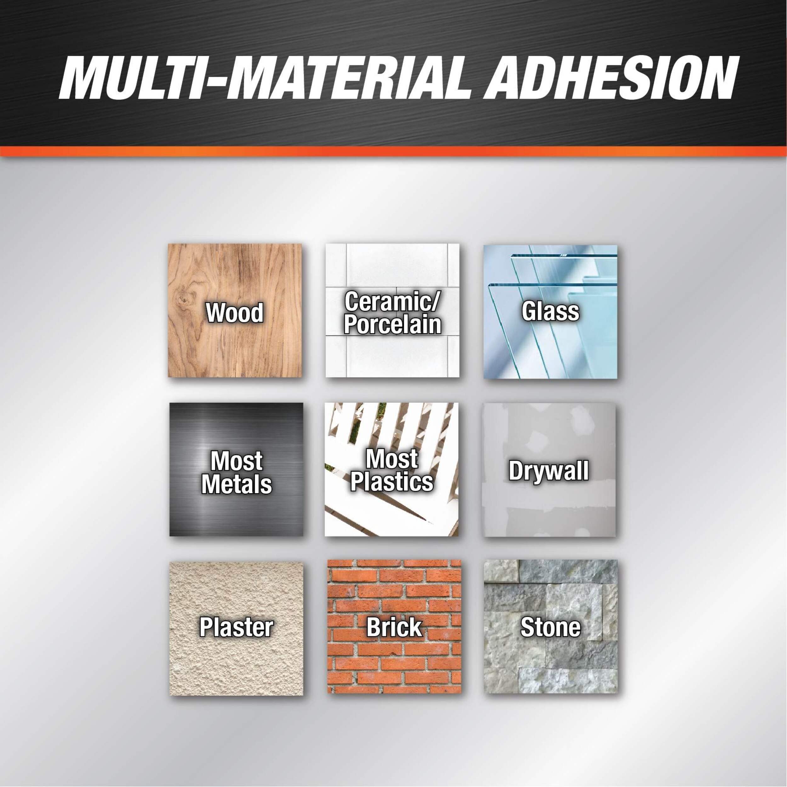 Adheres to wood, ceramic, porcelain, glass, most metals, most plastics, drywall, plaster, brick, and stone