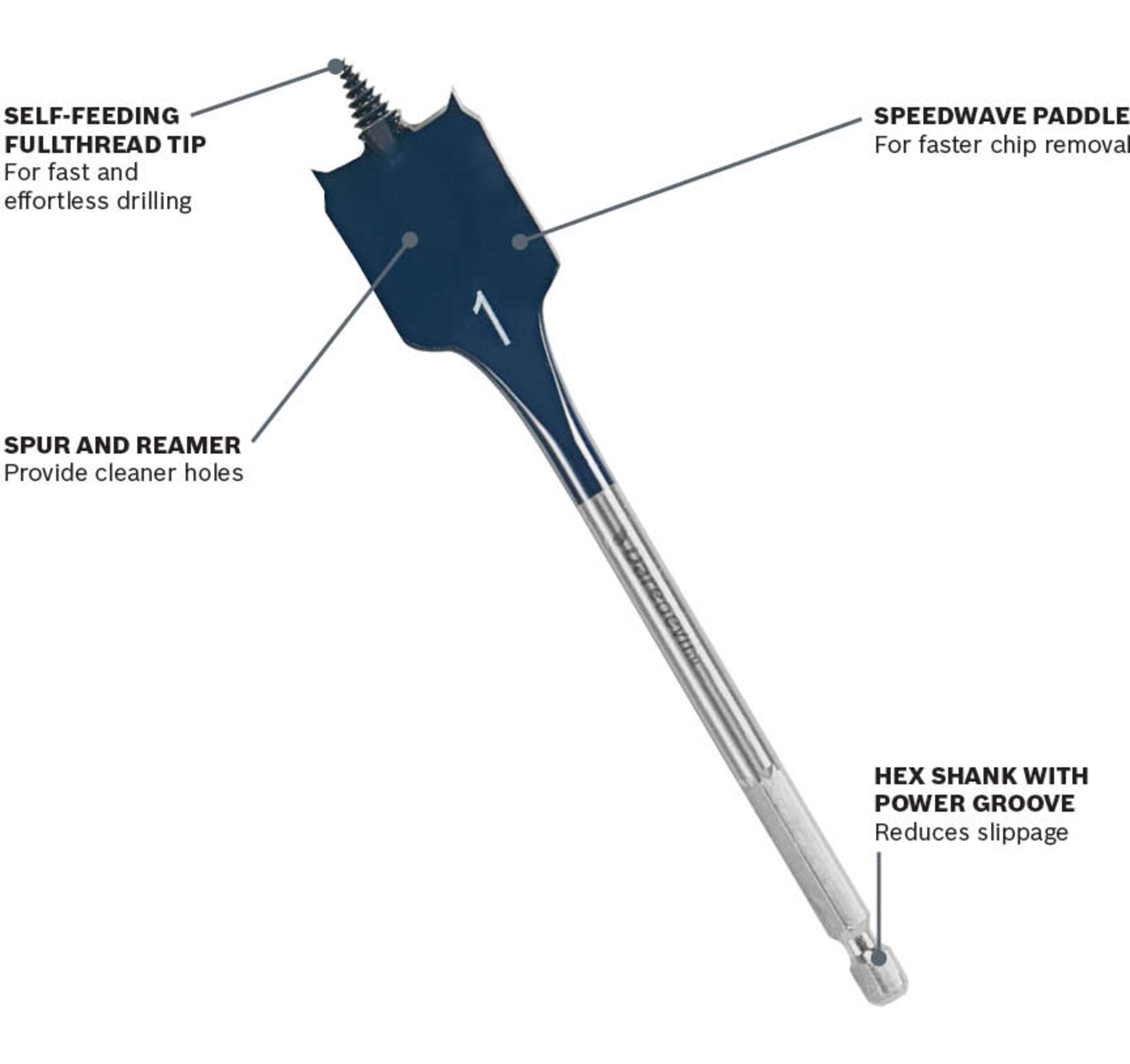 Daredevil Spade Bit features a full-cone threaded tip for fast and effortless drilling