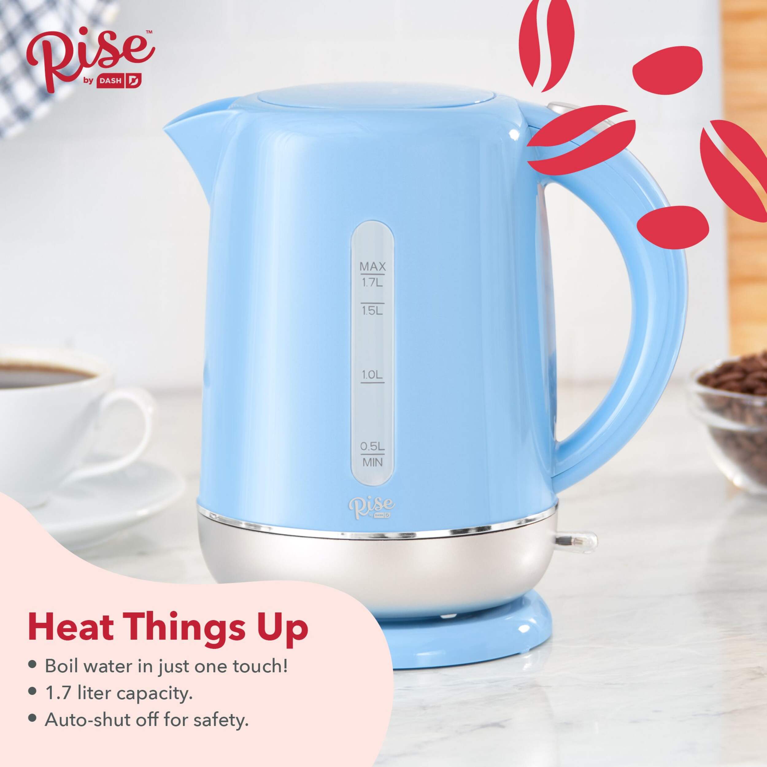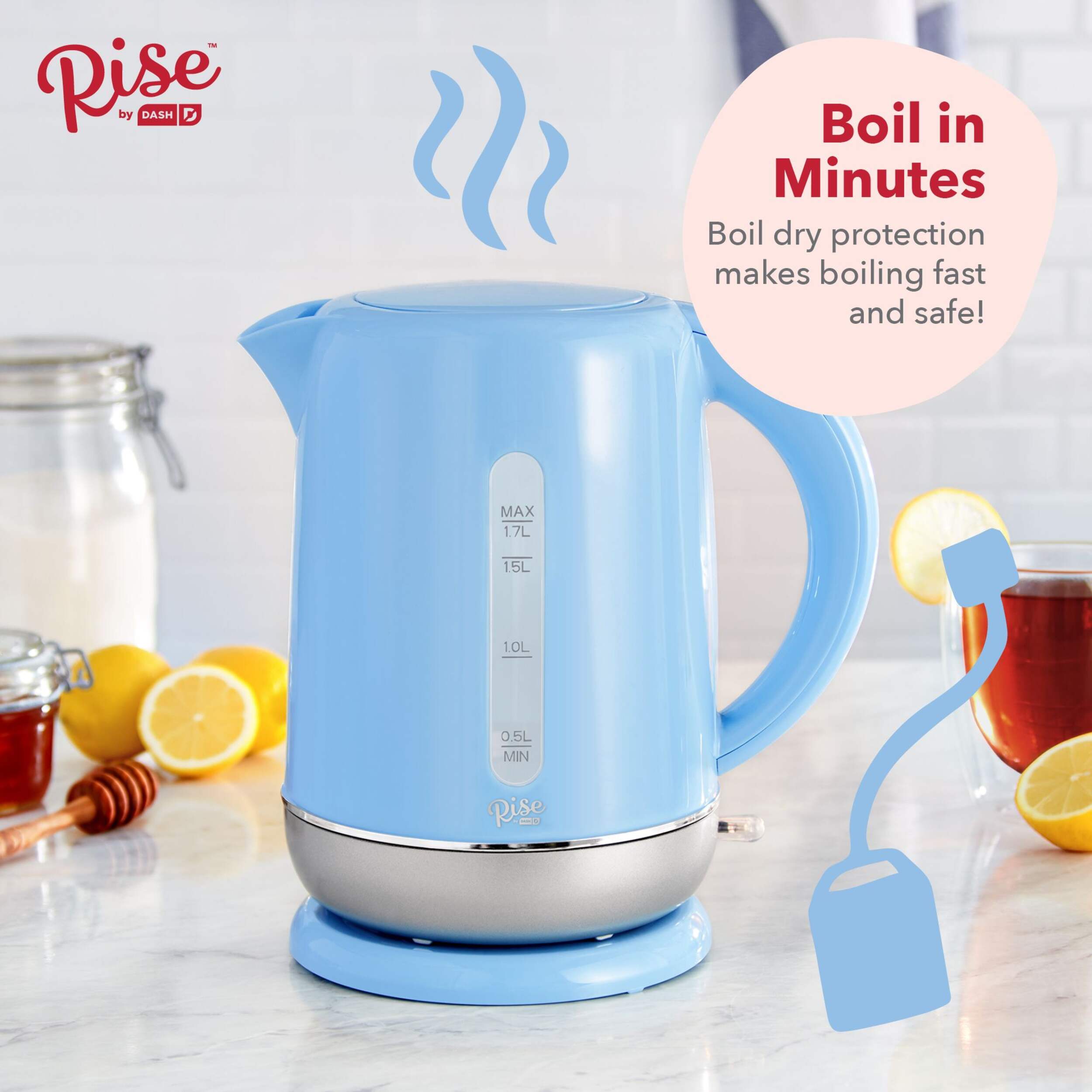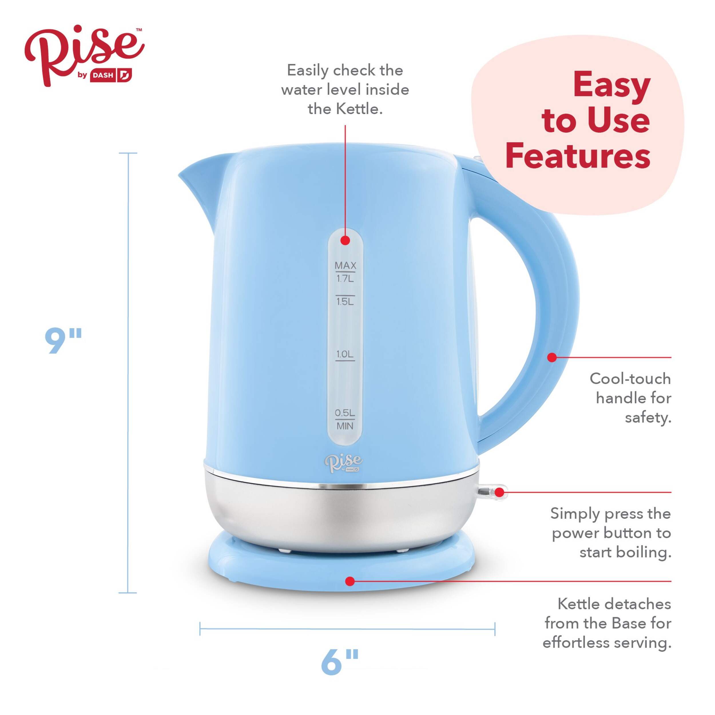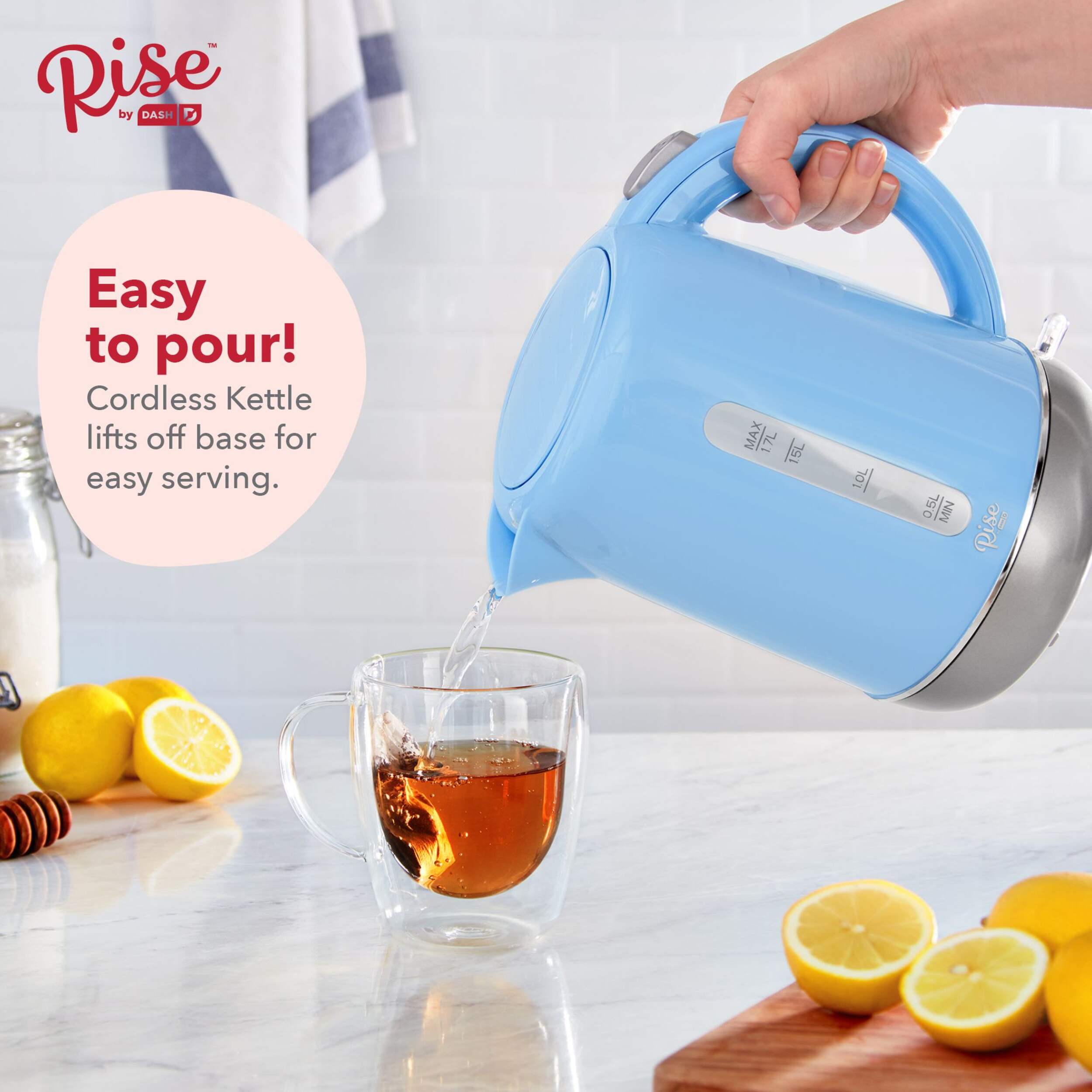 Make morning tea in a flash with the Dash Cordless Electric Kettle. Its rapid-boil technology brings water to a boil in minutes, while the cool-touch handle ensures safe pouring. The cordless electric kettle comes with a handy viewing window which allows you to monitor fill levels. An LED indicator light signals when your water is ready, then the push-button lid makes for easy access. Whether you're brewing a morning coffee or evening tea, this electric kettle quickly prepares hot water right when you need it. The generous capacity provides enough hot water for the whole family. With convenient cordless operation, this kettle looks sleek on any countertop.