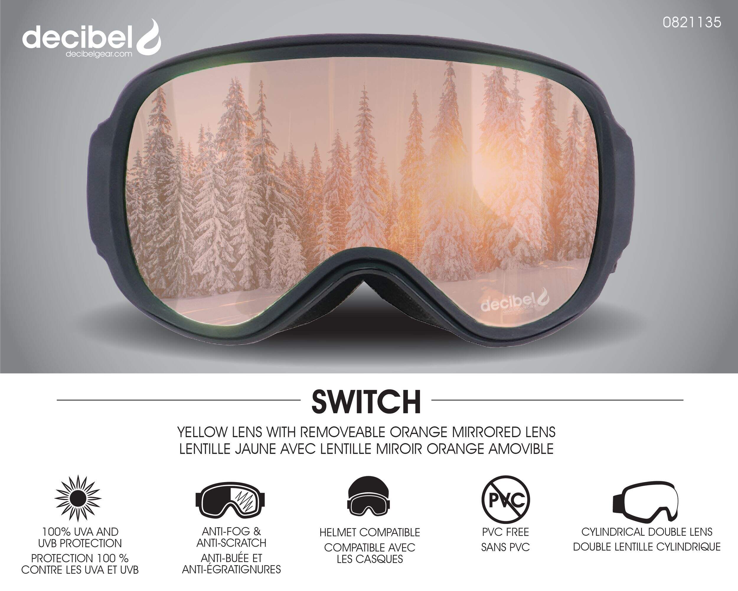 The Decibel Switch Ski/Snowboard Goggles offer adult sizing with a TPU magnetic double cylindrical lens design. The night lens base interior pairs with a revo finished day lens exterior, providing 100% UVA and UVB protection. The anti-fog, anti-scratch lenses feature a printed strap with silicone grippers for a secure fit.