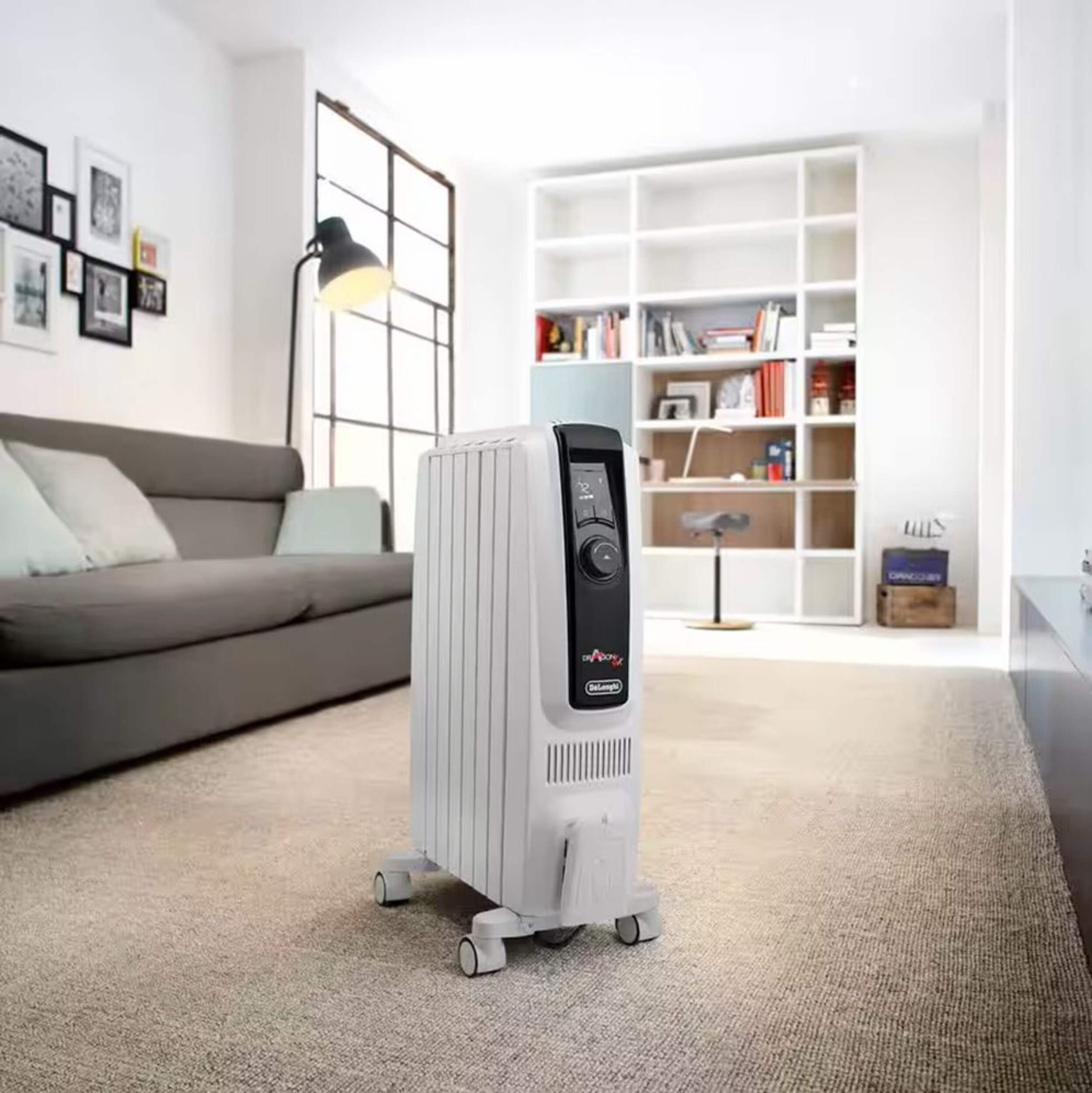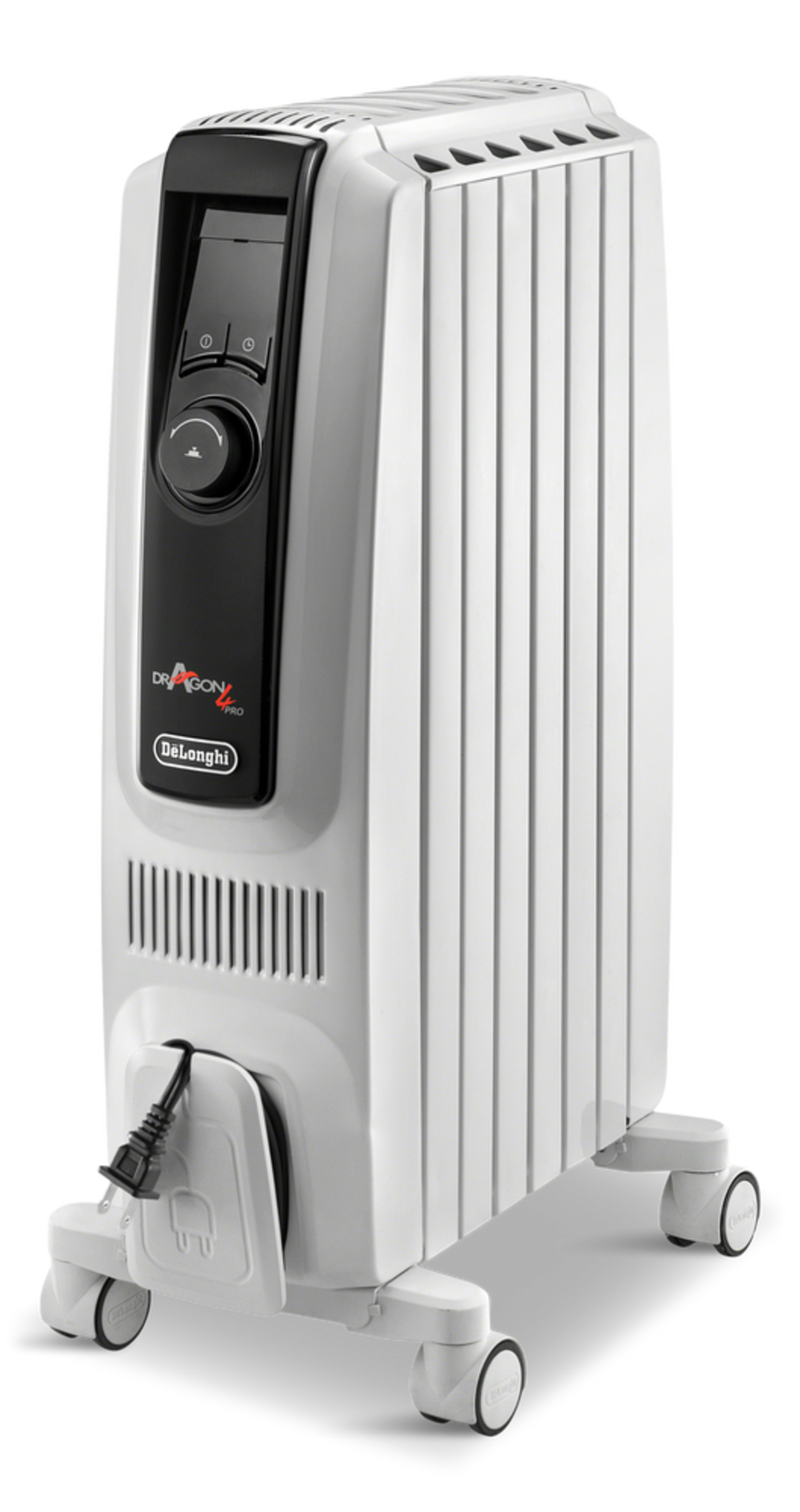 The DeLonghi TRD50615ECA Dragon Full Room Radiant Heater brings efficient heat to any room in your home. This handy portable heater delivers 1500W of heat, with three heat settings and thermostat that makes finding the right temperature simple. With a 24-hour timer and 96 on/off intervals, this room heater comes with a host of safety features like thermal shut-off and an anti-tip design to put your mind at ease.