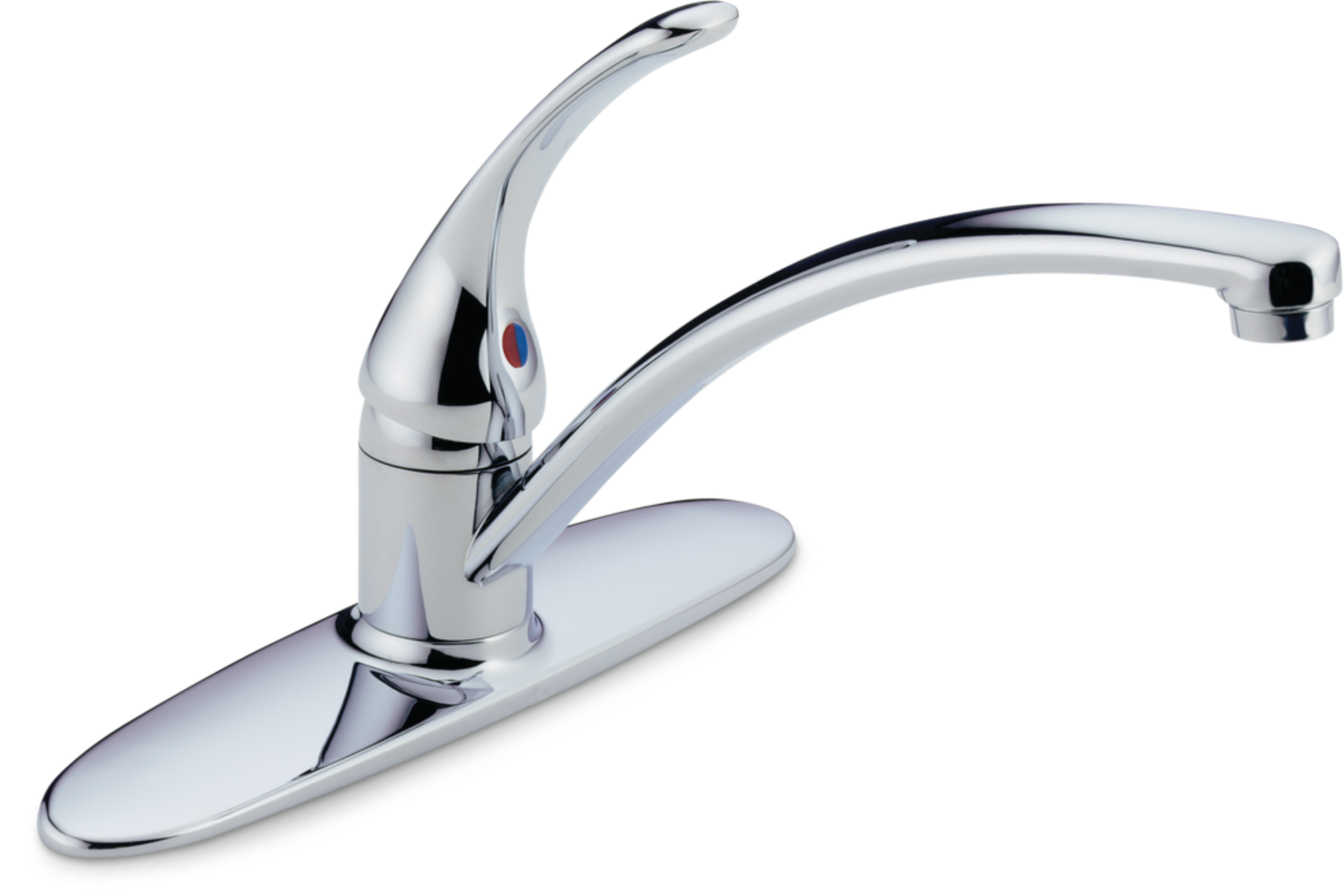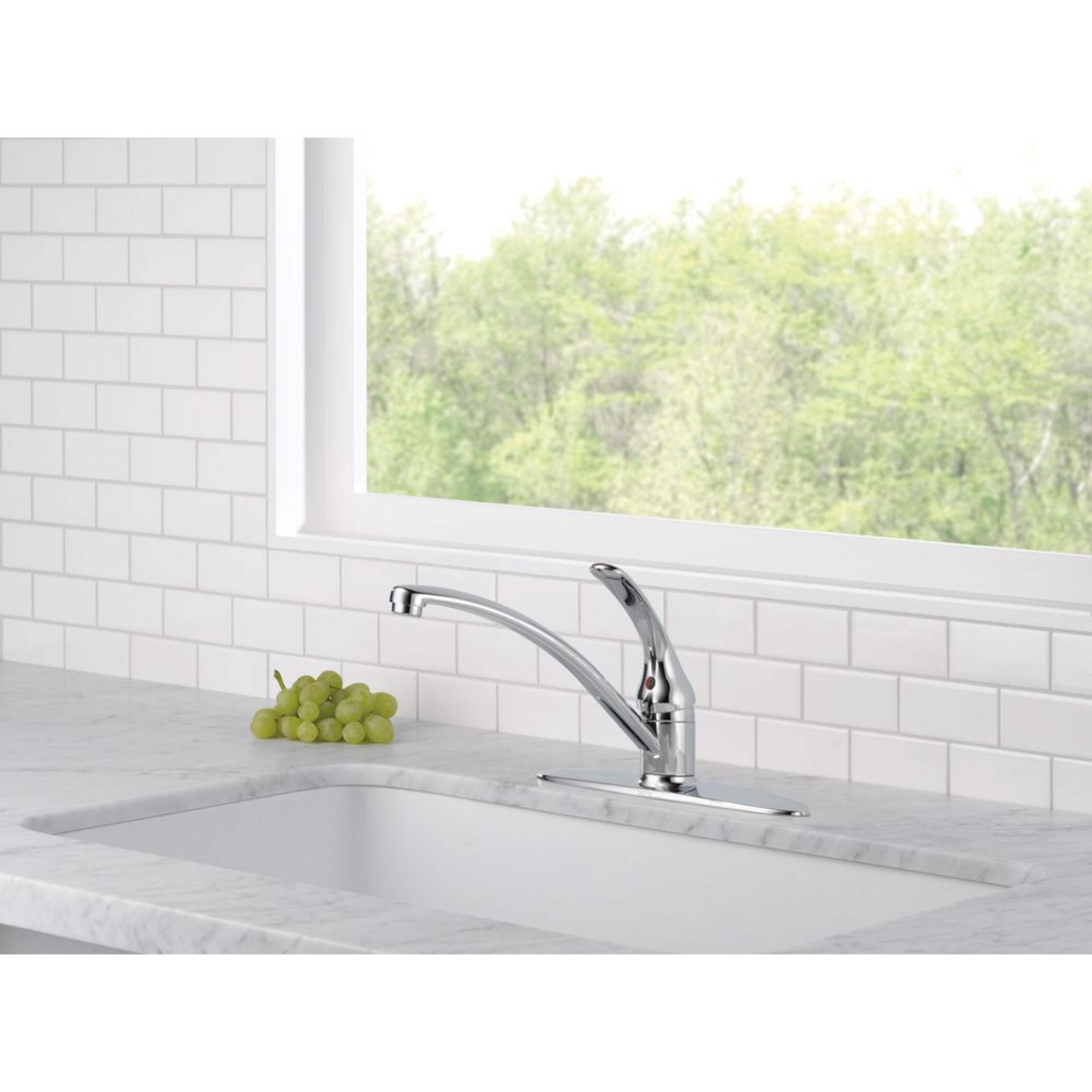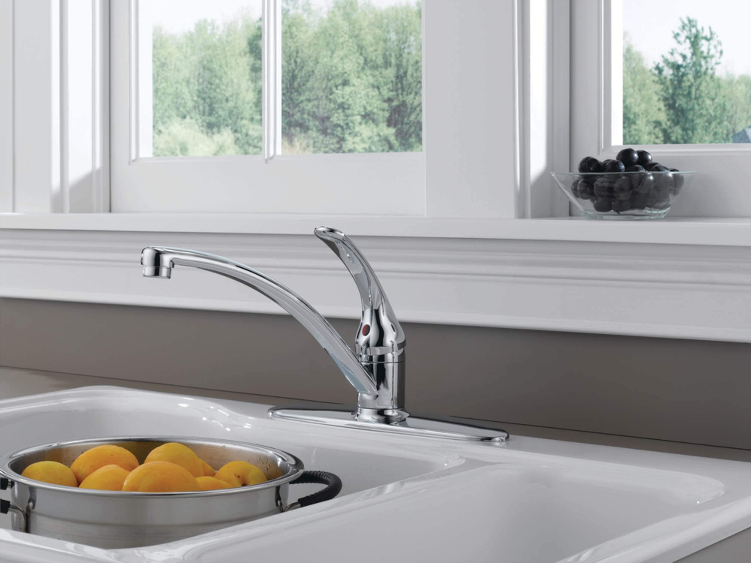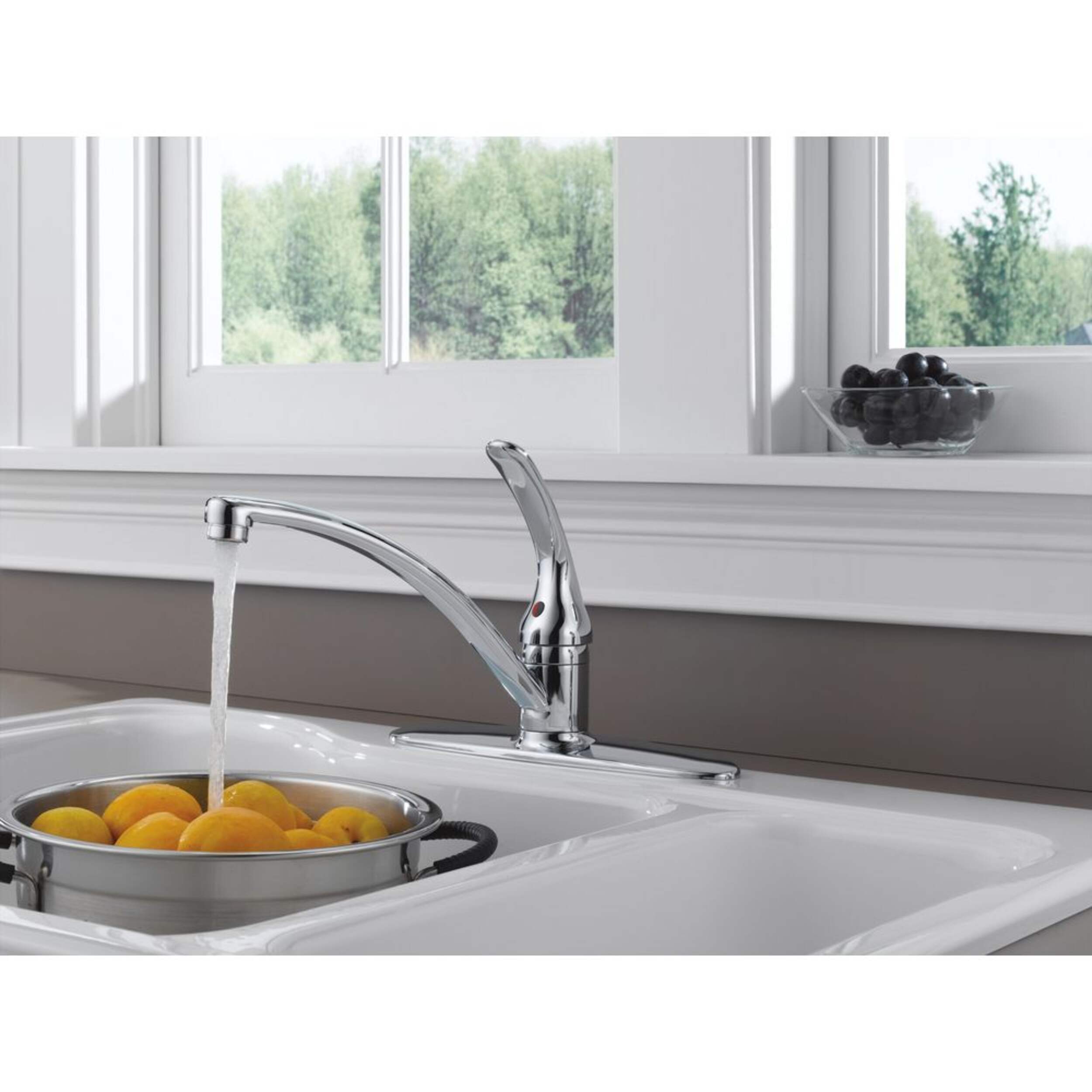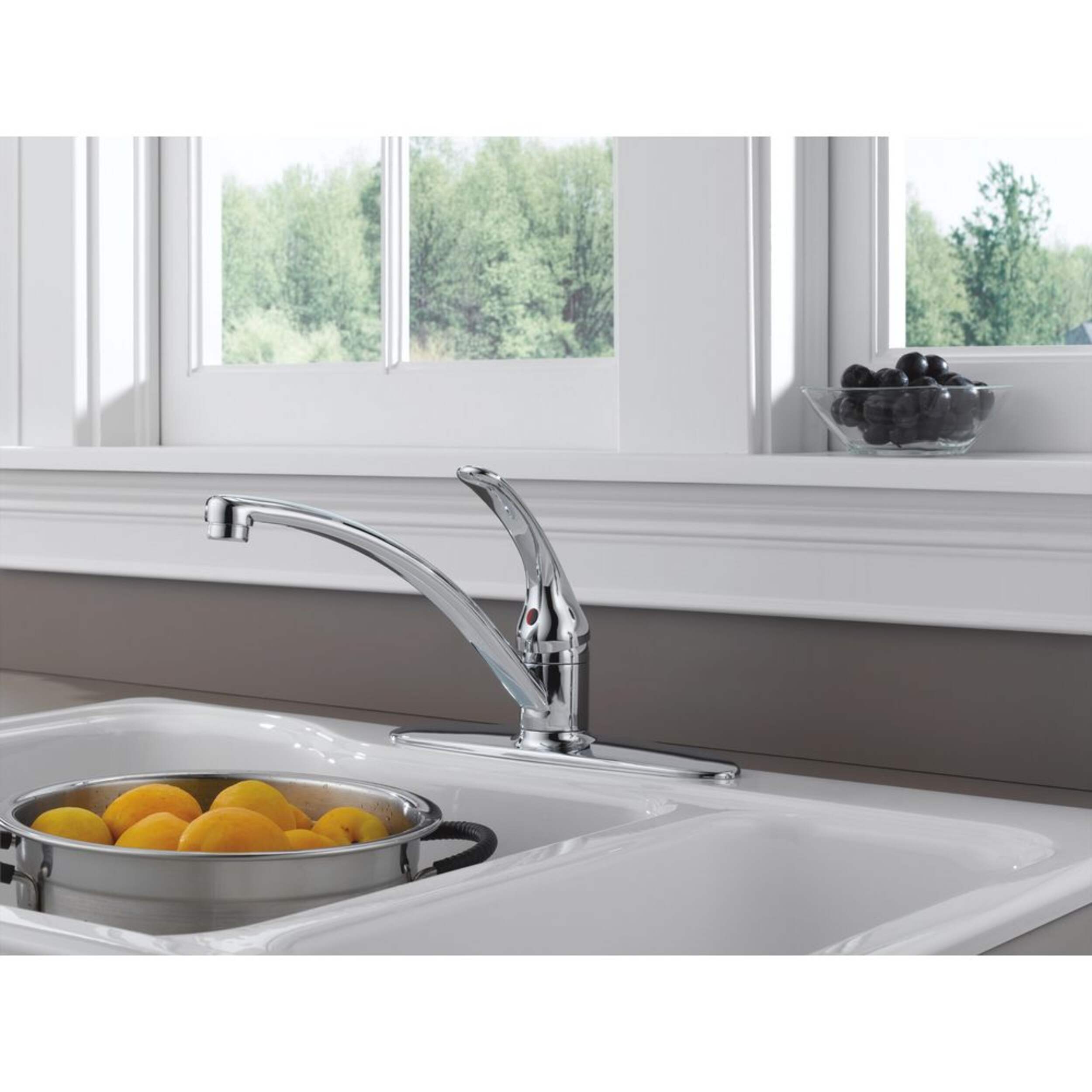 The Delta Principals Single Handle Kitchen Faucet provides a practical, hardworking solution that will stand the test of time, every time. With the single-control lever, you can easily adjust both the water flow and temperature. Thanks to an elegant, high arc spout that swivels 360 degrees, you have flexibility and greater reach in rinsing food, dishes and the sink. The beautiful chrome finish adds a touch of style to your kitchen decor.