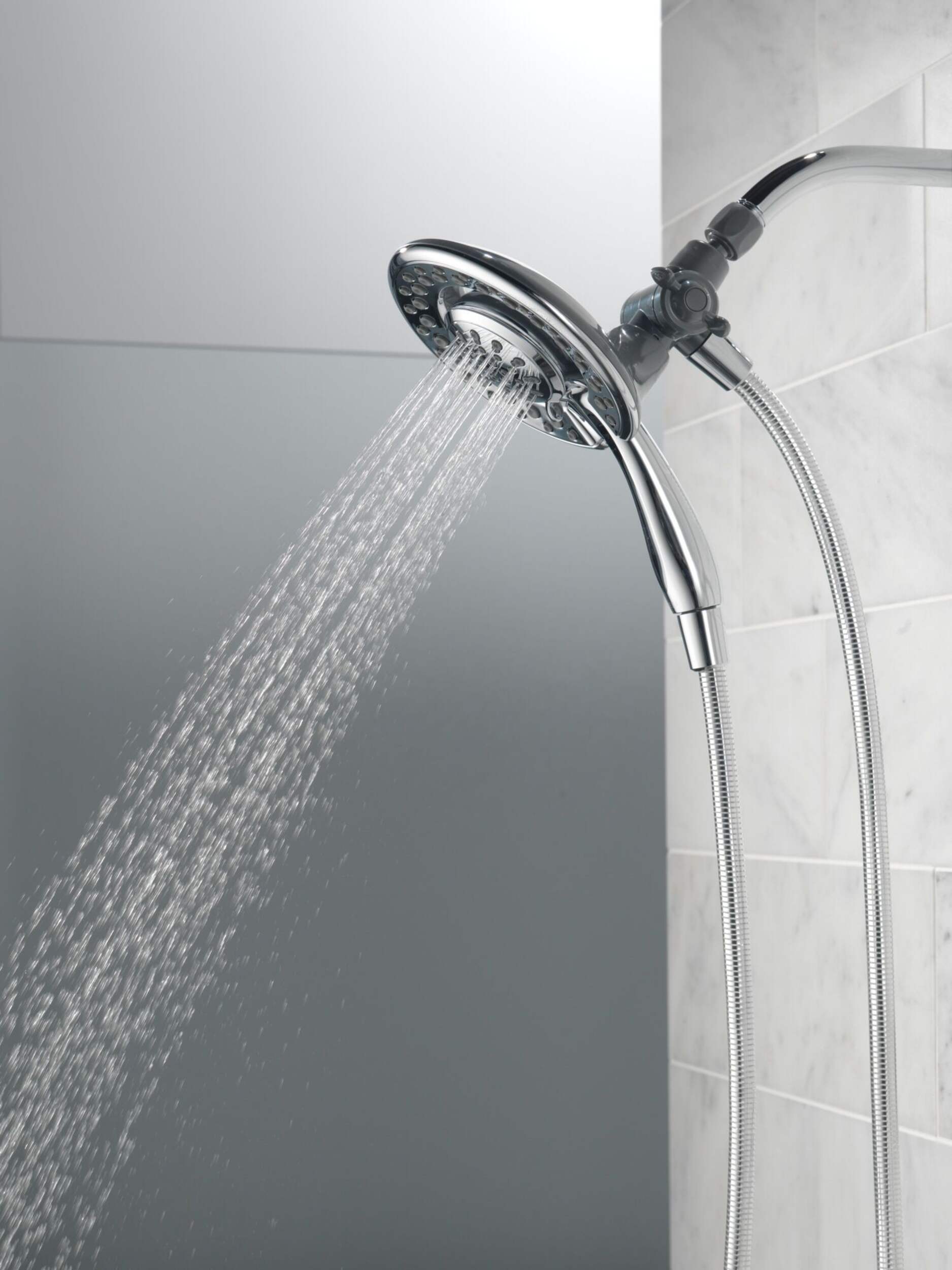 Delta In2ition® 2-in-1 4-Setting Handheld Shower Head revolutionizes your shower experience by combining the benefits of a traditional showerhead with a versatile handheld option. The innovative H2Okinetic technology shapes water into a unique wave pattern, providing the sensation of more water while conserving resources. You can easily conserve water during your shower routine without losing temperature settings.