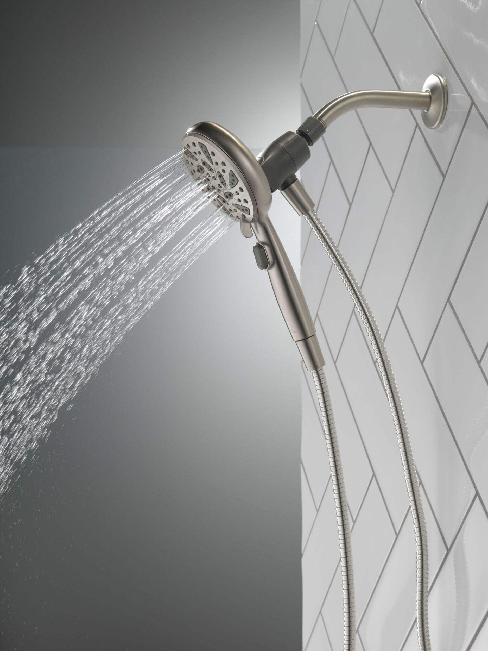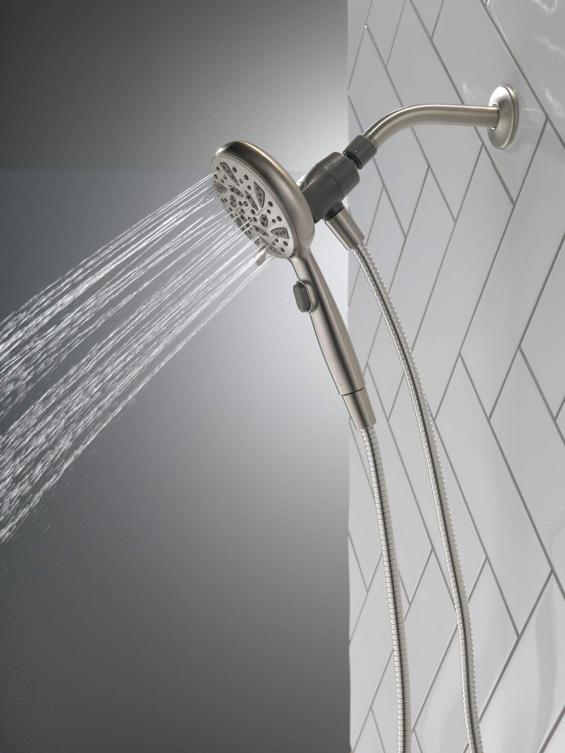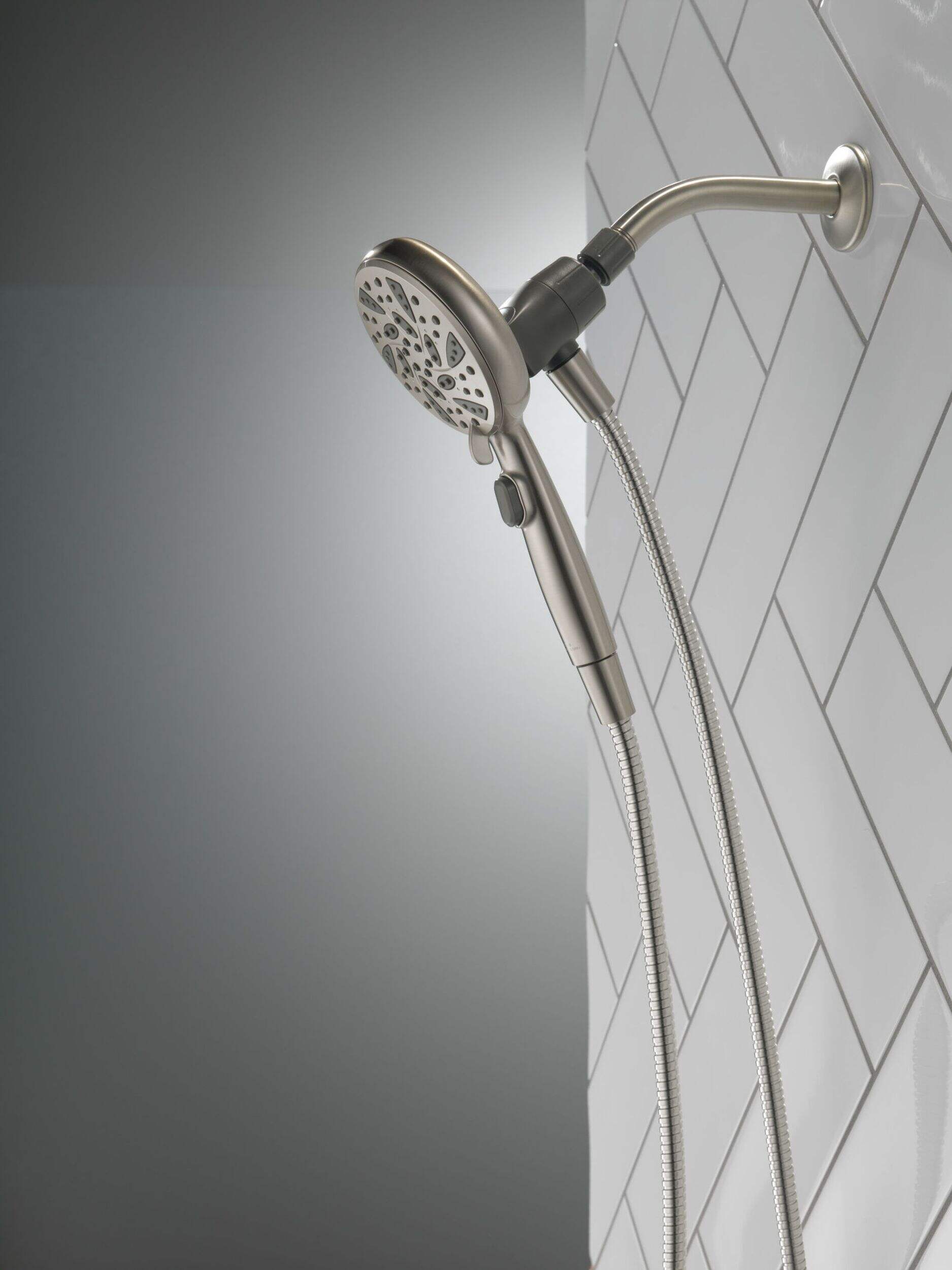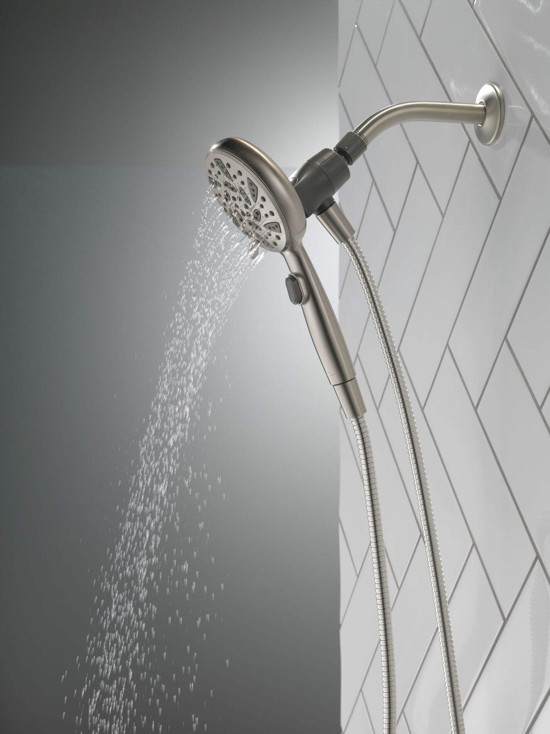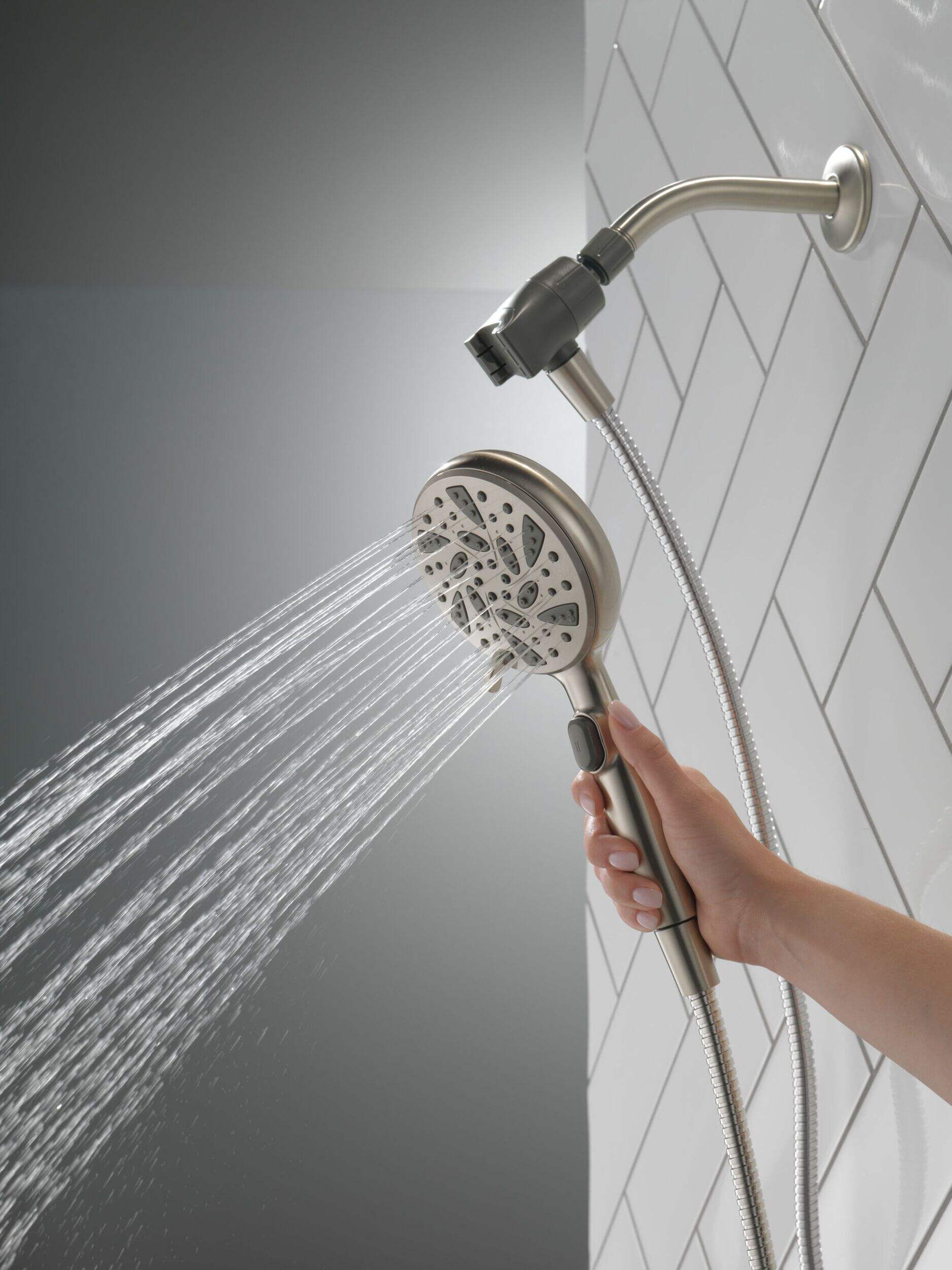The Delta® SureDock® Magnetic Hand Shower improves your shower experience while reducing maintenance and water consumption. The dual purpose design features a magnetized shower head that works in either the fixed position or when detached for extra reach. The 5-function dial rotates for easy selection so you can choose exactly the spray you need to rinse away grime or relieve aching muscles. The eco-friendly pause function slows the flow rate while you lather up or reach for shampoo.