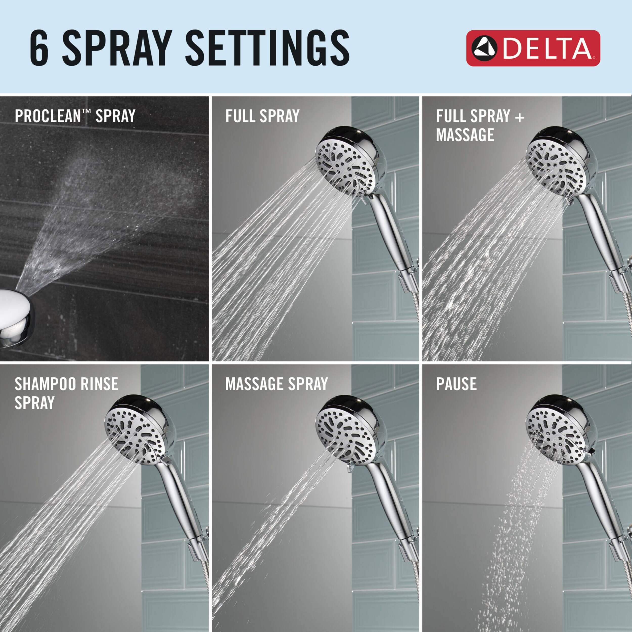 The Delta ProClean™ Hand Shower with 6 Settings offers a powerful cleaning solution, using ProClean™ spray to remove soap scum and grime at least two times faster than standard sprays. The high-pressure spray and pause feature make it versatile for any shower task and it is WaterSense® labeled, using 20% less water without compromising performance. This is a reliable, easy-to-install upgrade for any bathroom.