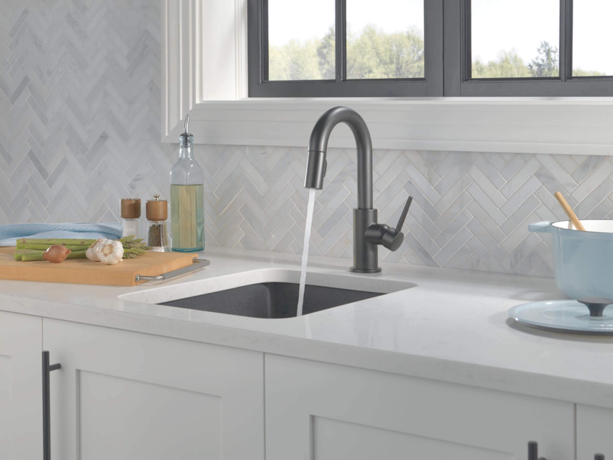 Delta Trinsic 1-Handle Pull-Down Bar/Prep Faucet with MagnaTite Docking uses a powerful integrated magnet to snap your faucet spray wand precisely into place and hold it there so it stays docked when not in use and doesn't droop over time