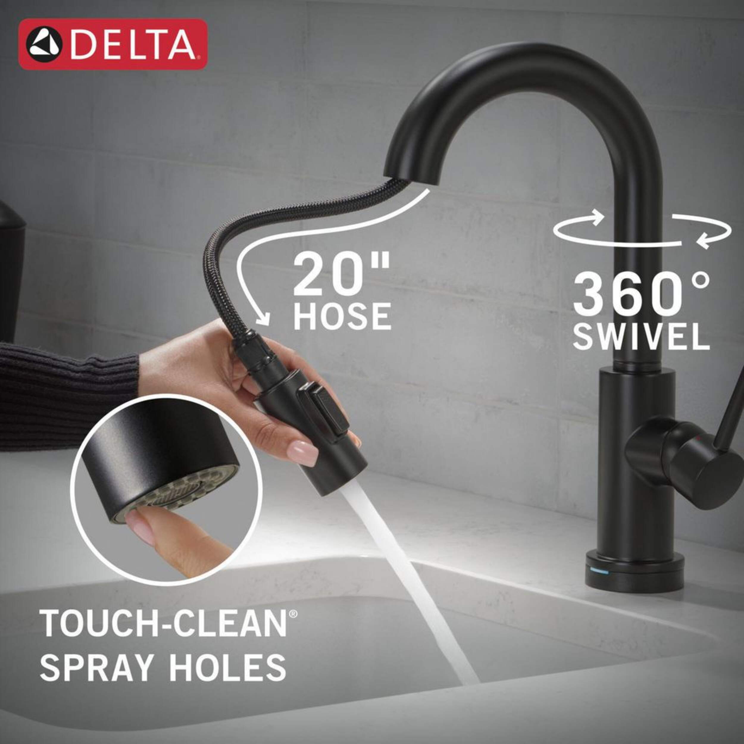 Soft, rubber Touch-Clean spray holes allow you to easily wipe away calcium and lime build-up with the touch of a finger