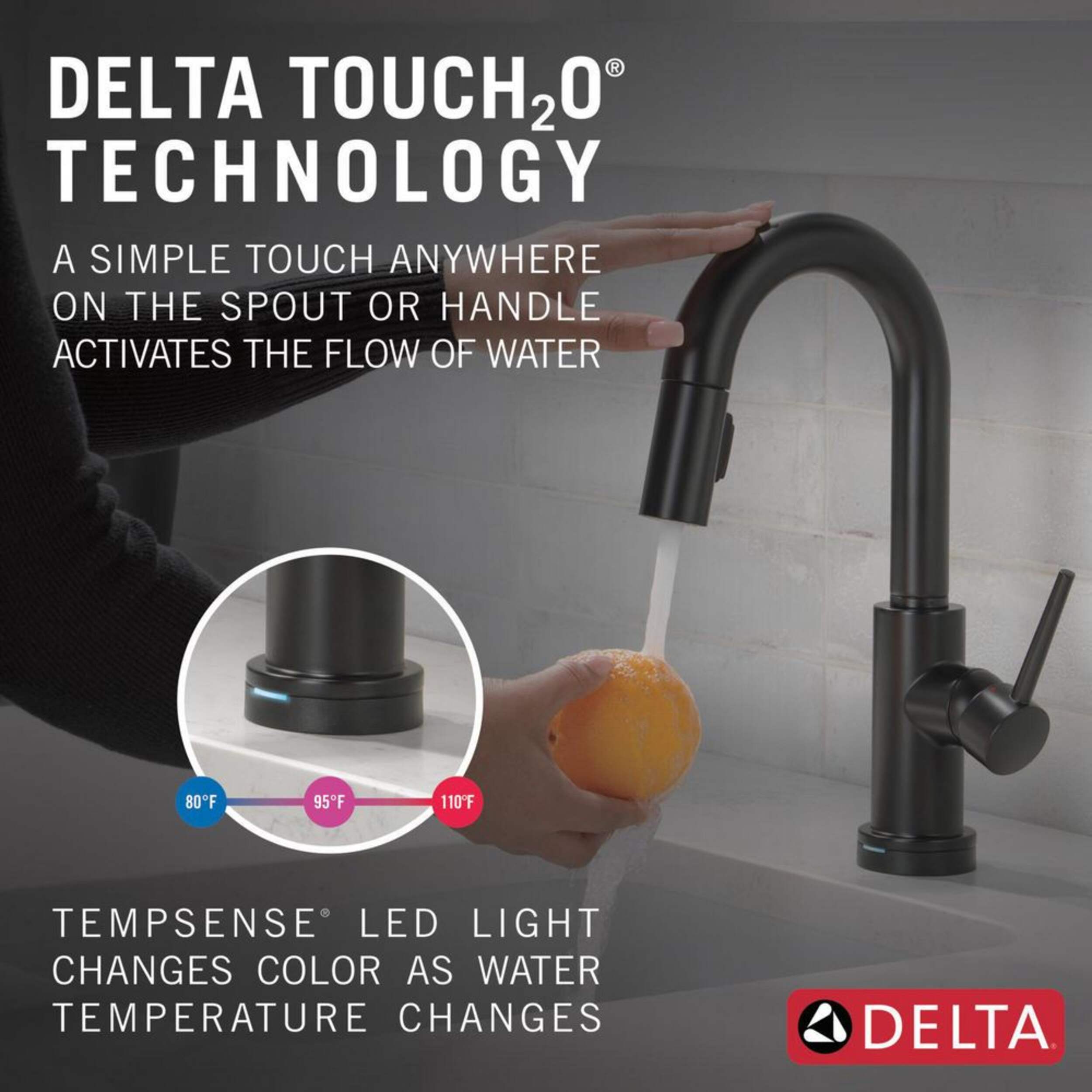 Touch it on. Touch it off. Whether you have two full hands or 10 messy fingers, Delta® Touch2O® Technology helps keep your faucet clean, even when your hands aren’t. A simple touch anywhere on the spout or handle with your wrist or forearm activates the flow of water at the temperature where your handle is set. The Delta TempSense™ LED light changes color to alert you to the water’s temperature and eliminate any possible surprises or discomfort. Delta® MagnaTite® Docking uses a powerful integrated magnet to pull your faucet spray wand precisely into place and hold it there so it stays docked when not in use. Delta® faucets with DIAMOND™ Seal Technology perform like new for life with a patented design which reduces leak points, is less hassle to install and lasts twice as long as the industry standard*. Kitchen faucets with Touch-Clean® Spray Holes allow you to easily wipe away calcium and lime build-up with the touch of a finger. You can install with confidence, knowing that Delta faucets are backed by our Lifetime Limited Warranty. Electronic parts are backed by our 5-year electronic parts warranty. *Industry standard is based on ASME A112.18.1 of 500,000 cycles.