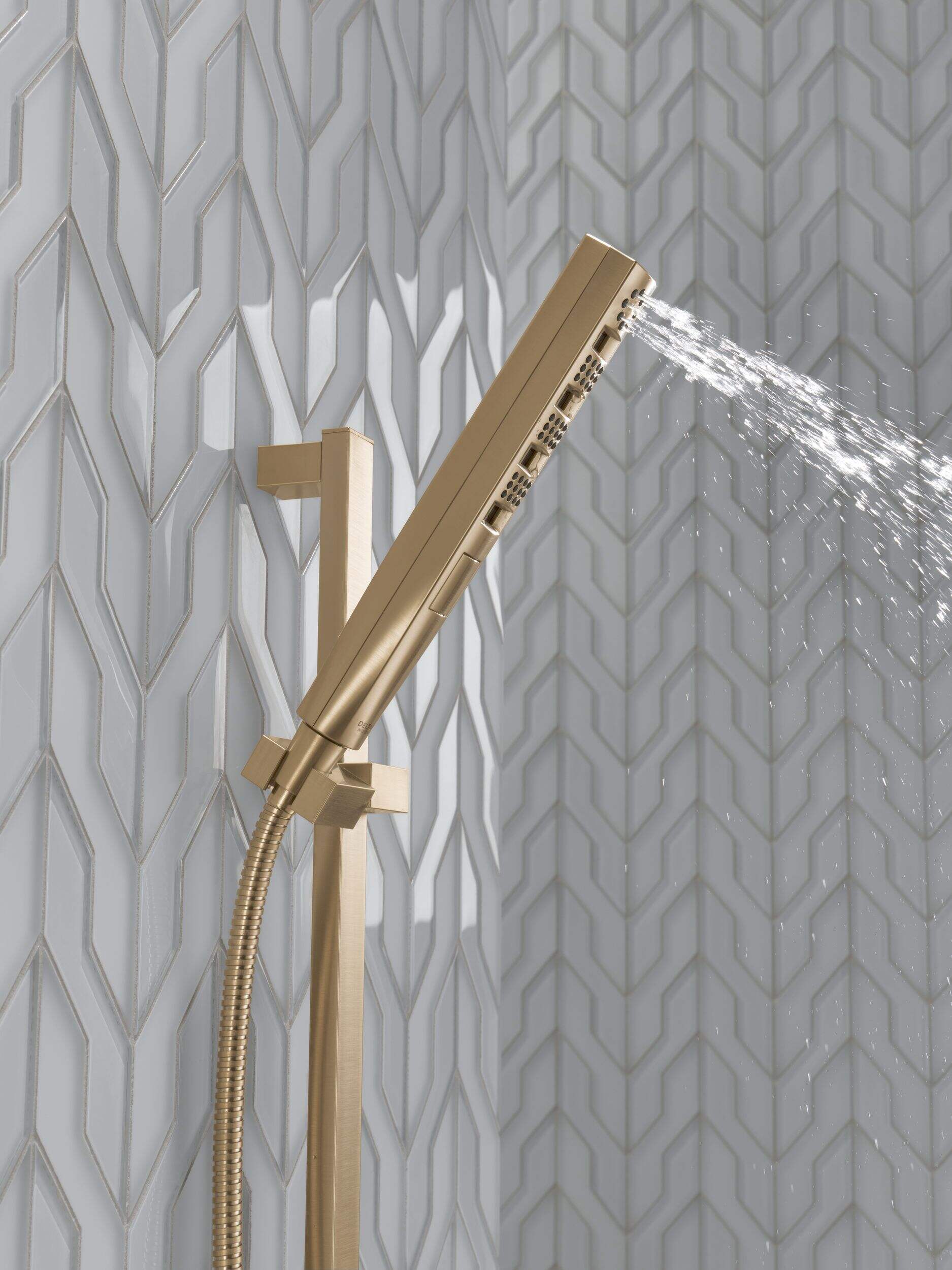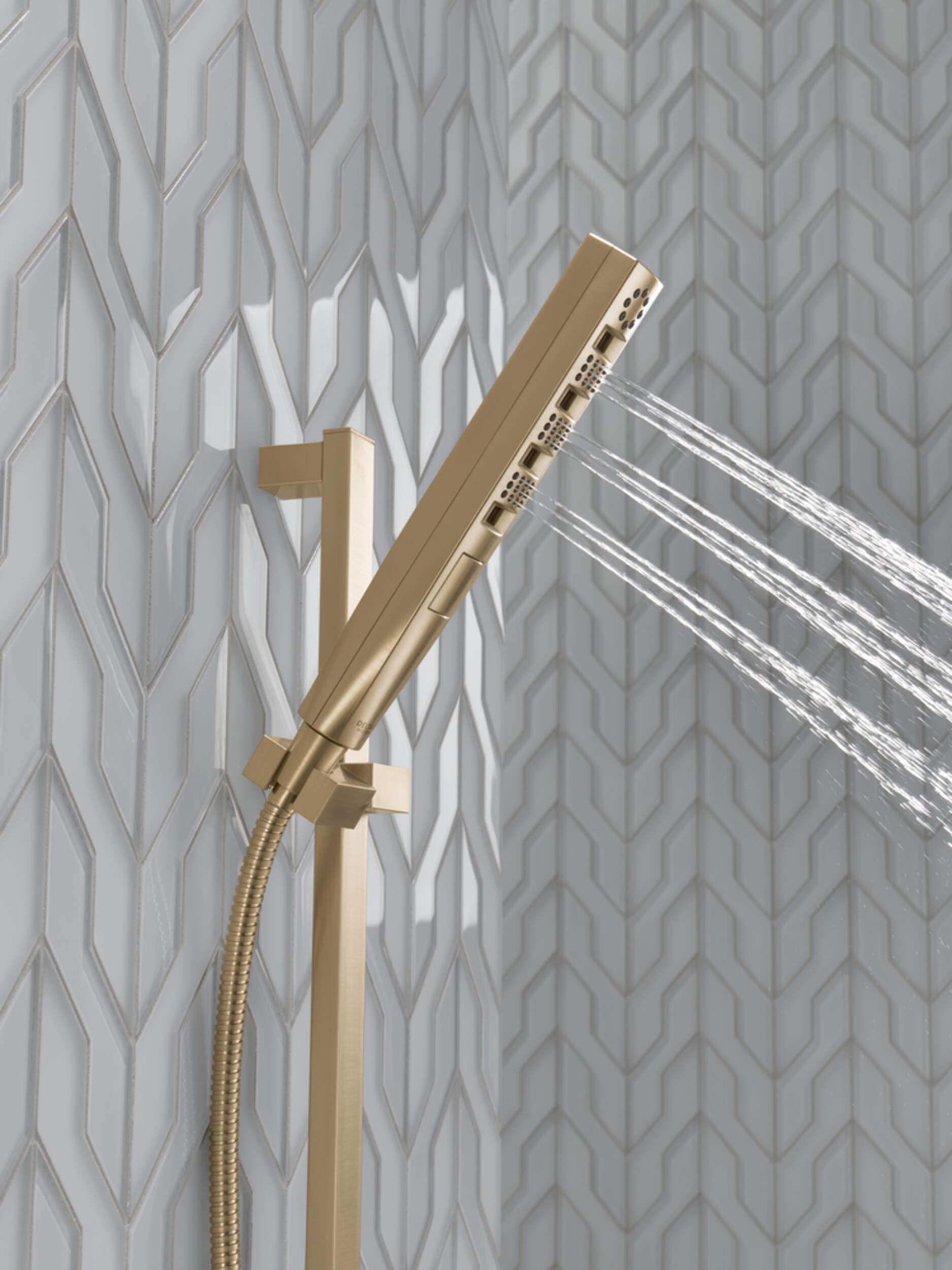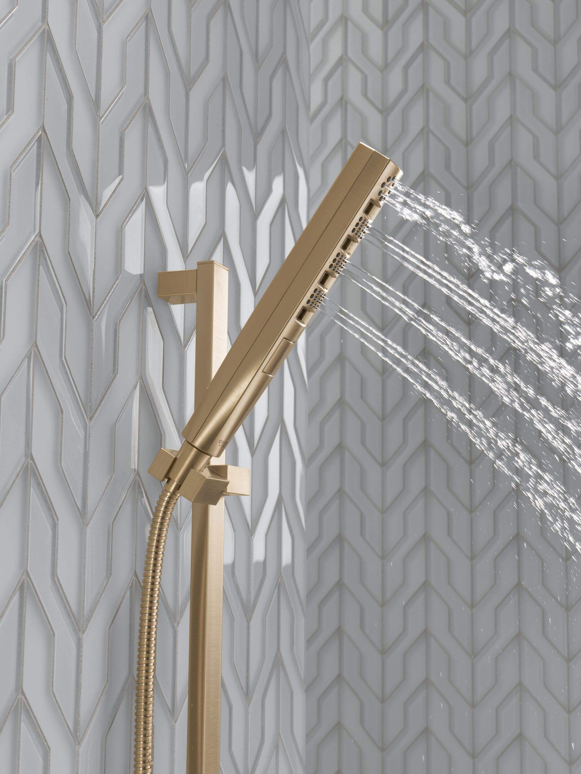 Delta Zura H2Okinetic SlideBar Hand Shower sculpts water into a unique wave pattern, forming a powerful drench spray