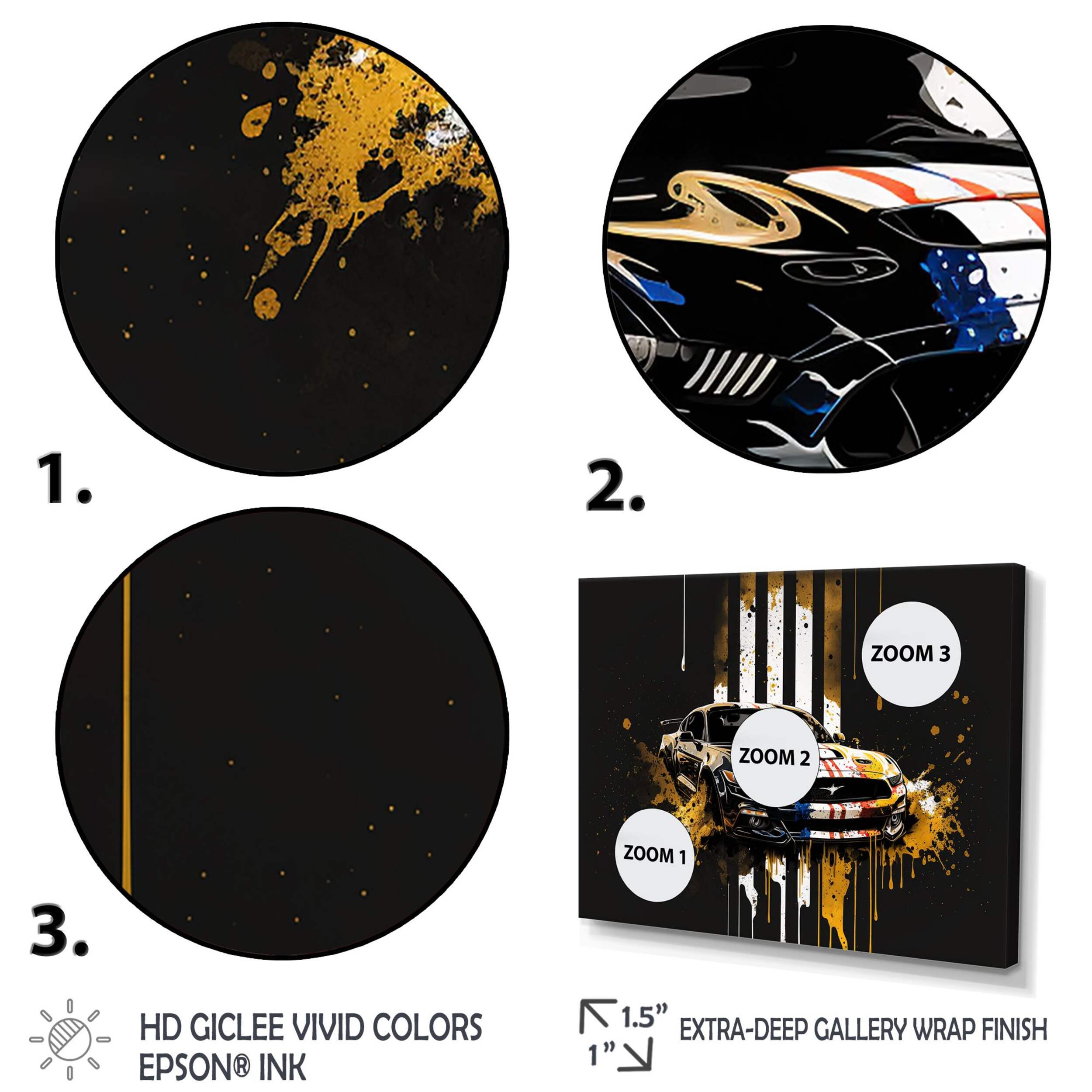 This Designart Black And Gold American Muscle I Canvas Wall Art is gallery-wrapped (the design continues on the sides), giving it a real art gallery feel