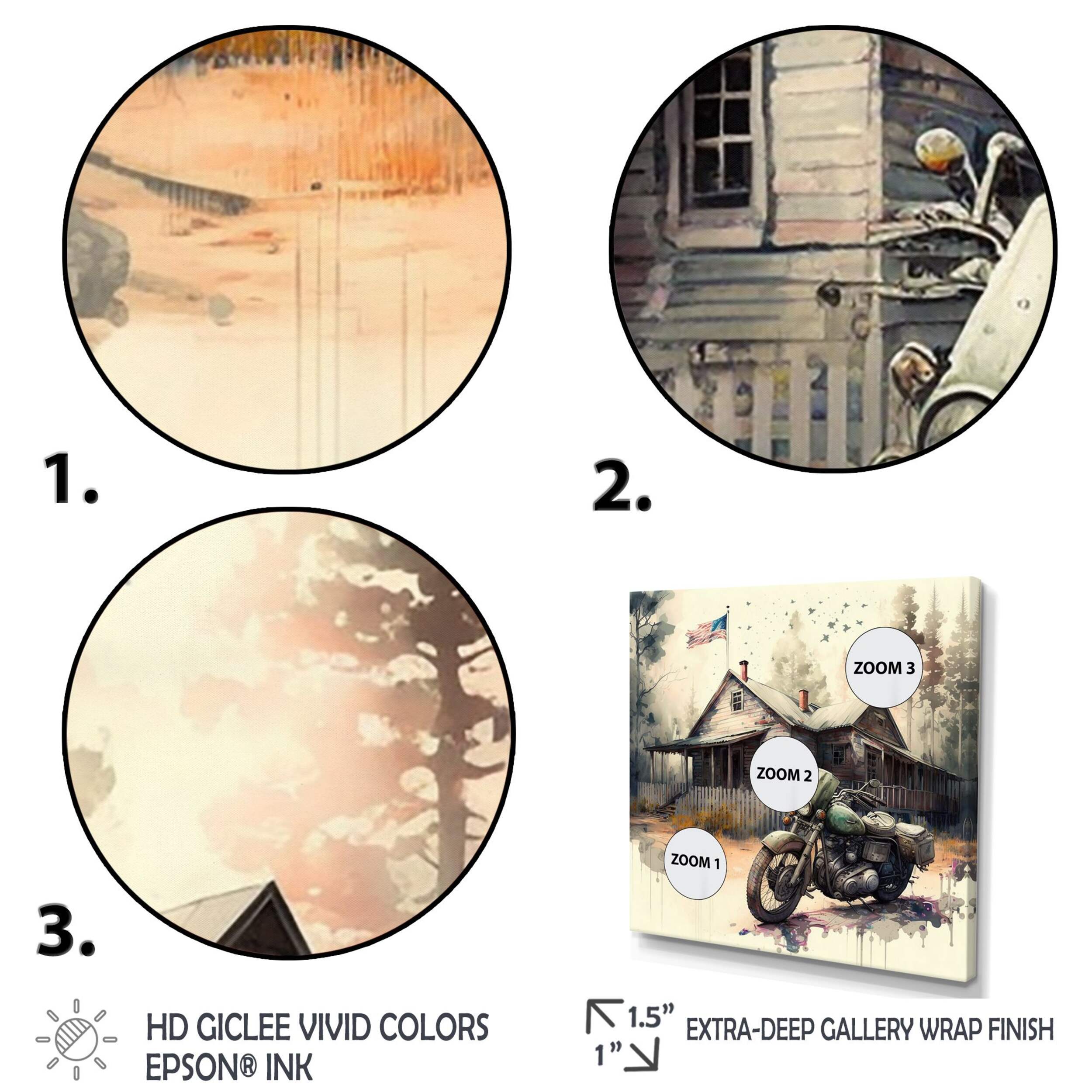 Bring the open road home with the Designart 36 x 36” Motorcycle Parked At The Cabin IV Canvas Wall Art. This gallery-wrapped canvas features a vintage motorcycle parked outside a cozy cabin, capturing the spirit of adventure. Made with premium-quality canvas and vivid giclee printing, this piece arrives ready to hang. Made in Canada, this wall art offers a convenient way to add rustic character to your living room, bedroom, or home office.