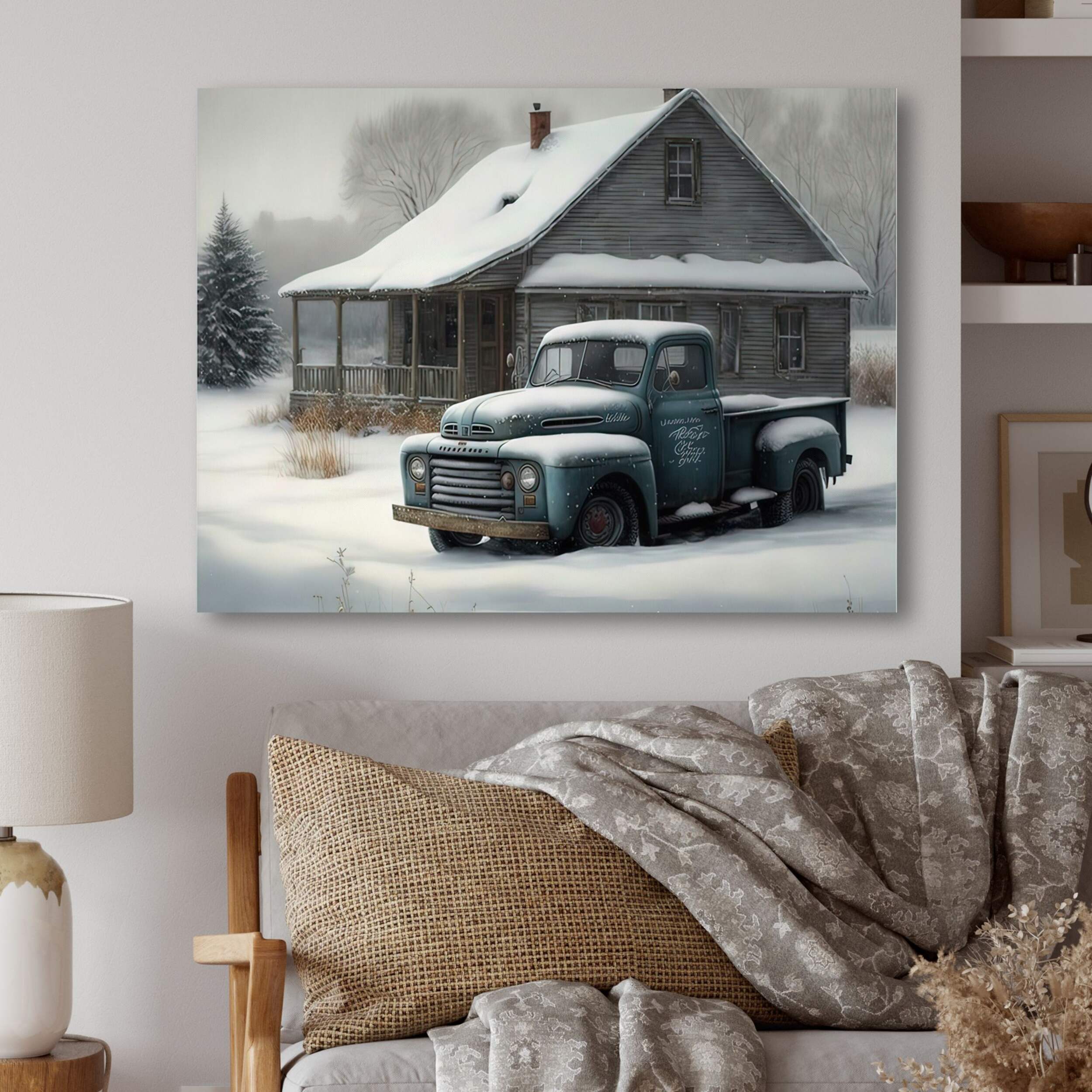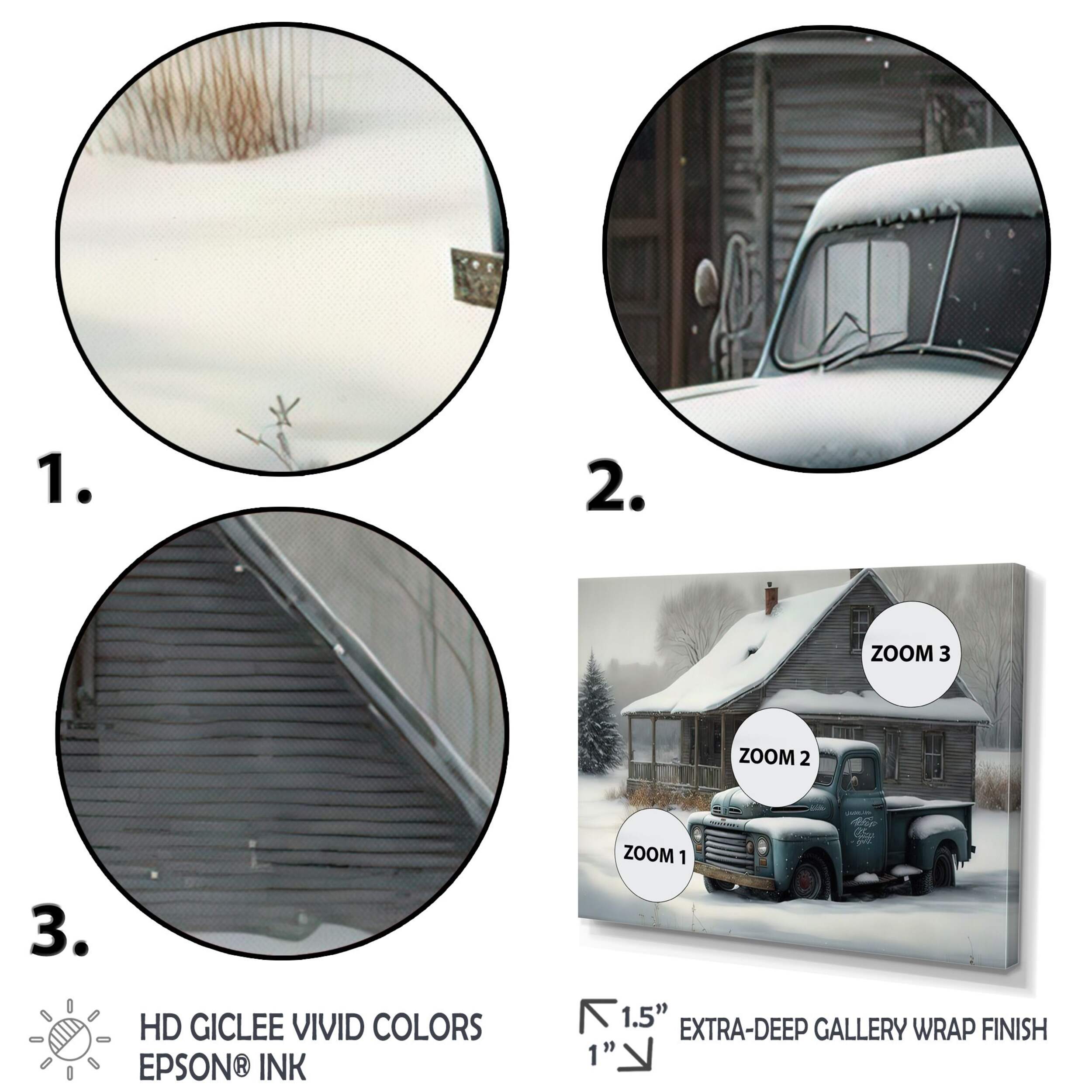 This Designart Old Truck At The Barn In Winter IV Canvas Wall Art comes in a giclee print and is gallery-wrapped (the design continues on the sides), giving it a real art gallery feel