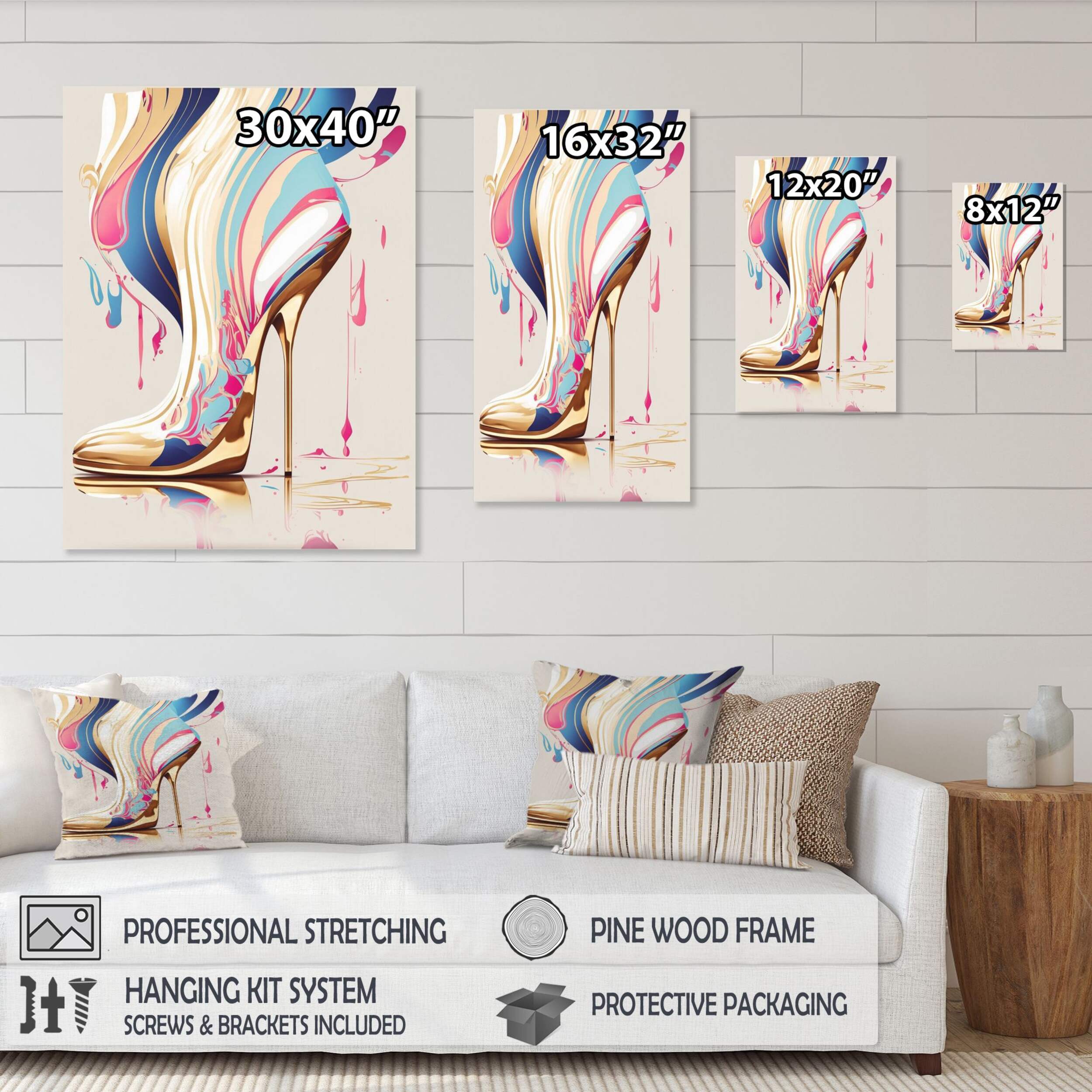 The stylish and colourful Designart 12 x 20" Pink & Blue Art Deco High Heel Boots I Canvas Wall Art adds a pop of colour and contemporary flair to any room you hang it in. The print’s gallery-wrapped design depicts a pair of pink and blue high heel shoes in an art deco style, continuing the pattern onto the sides for a gallery-inspired look. Printed with fade-resistant ink on premium cotton canvas and made in Canada, this wall art arrives ready to hang and brighten your space with its bold, playful style.