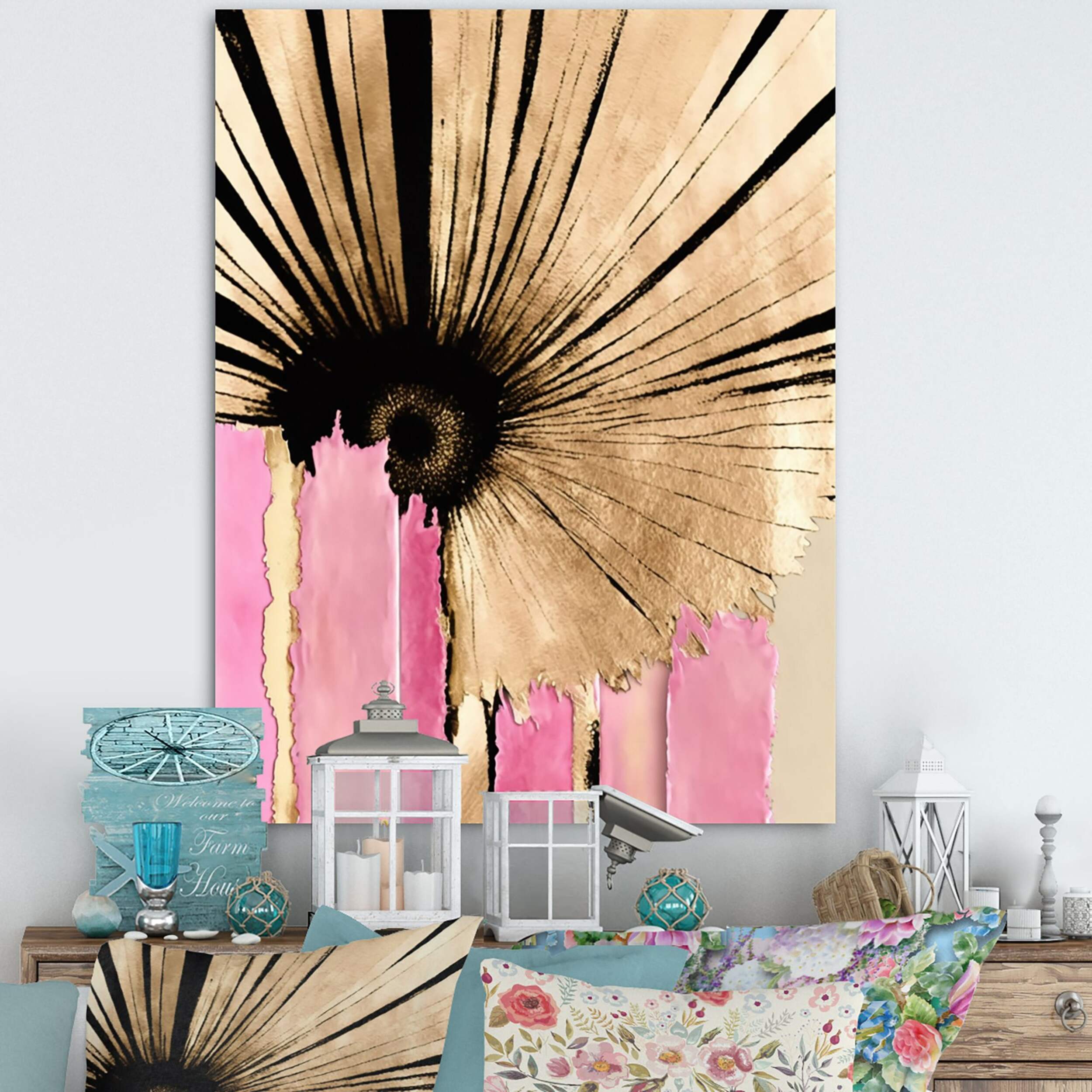 The Designart Pink Gerbera Flower On Abstract Fusion I Canvas Wall Art adds a pop of colour to any room