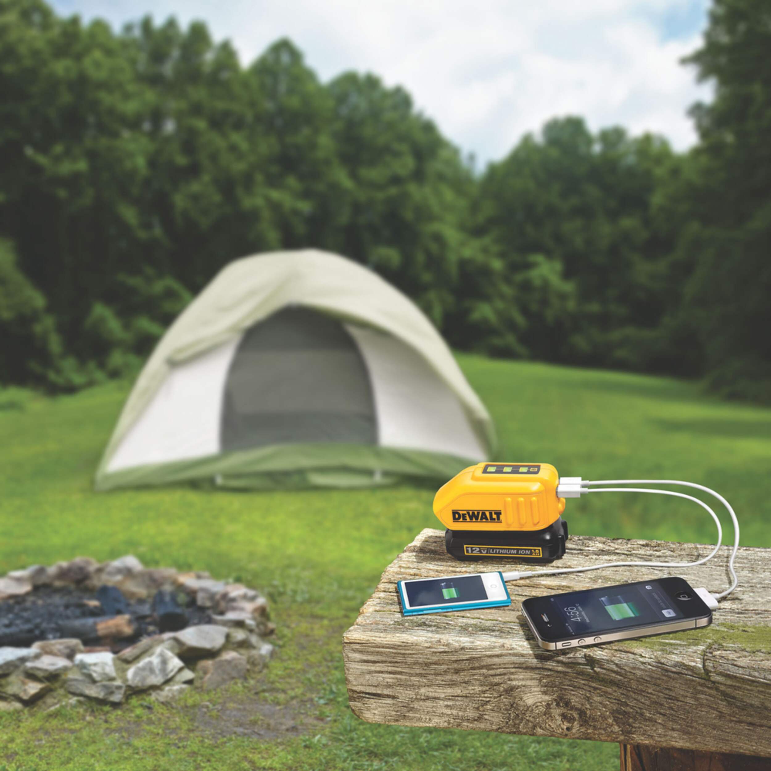 The DEWALT 12V/20V Max Li-Ion Cordless USB Power Source features two USB ports to charge electronic devices when AC power is not available