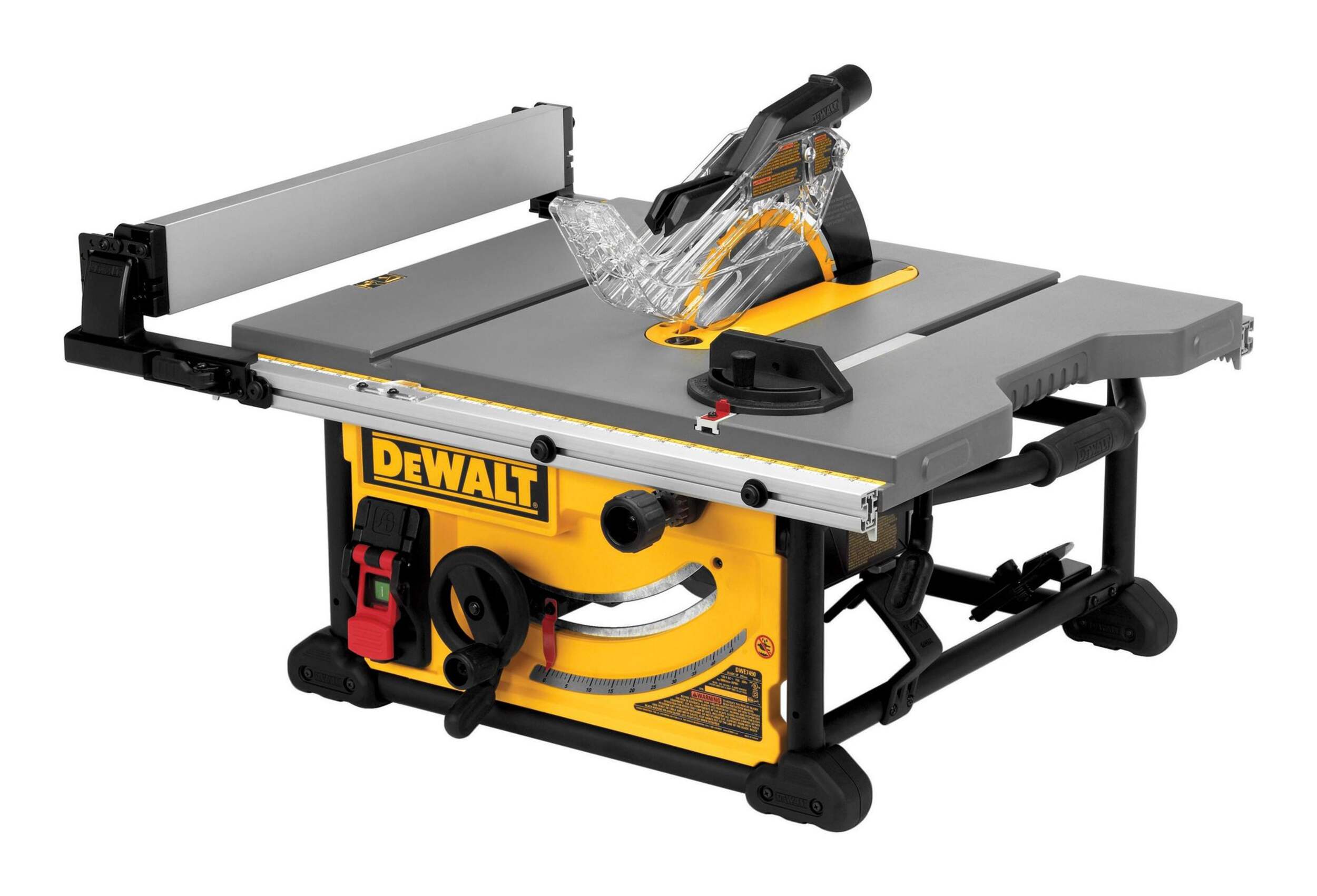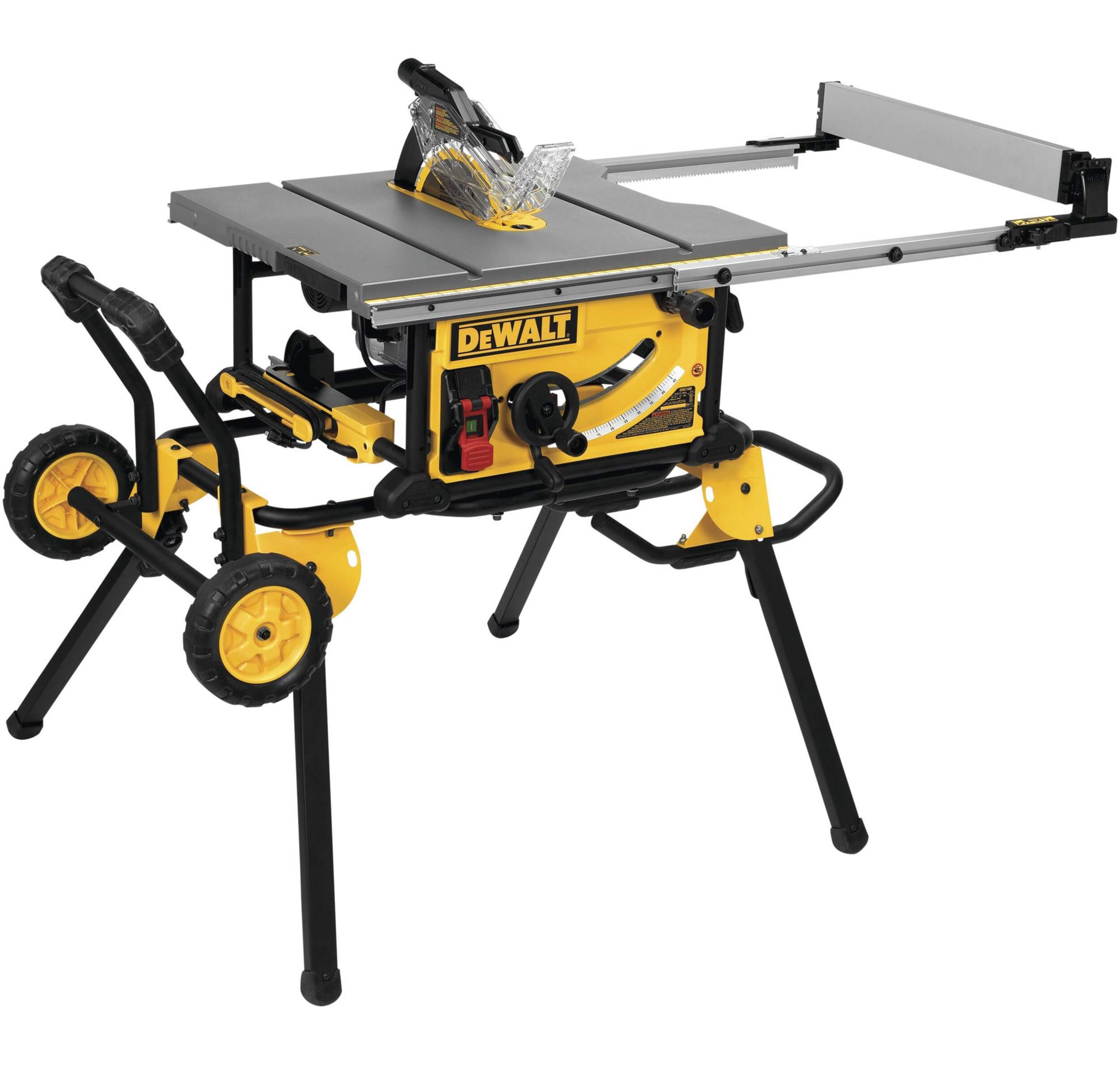DEWALT 15A Jobsite Table Saw with Stand features an onboard storage system provides easy access to the blade guard assembly, fence, riving knife, miter gage, wrenches, push stick, and cord wrap when not in use