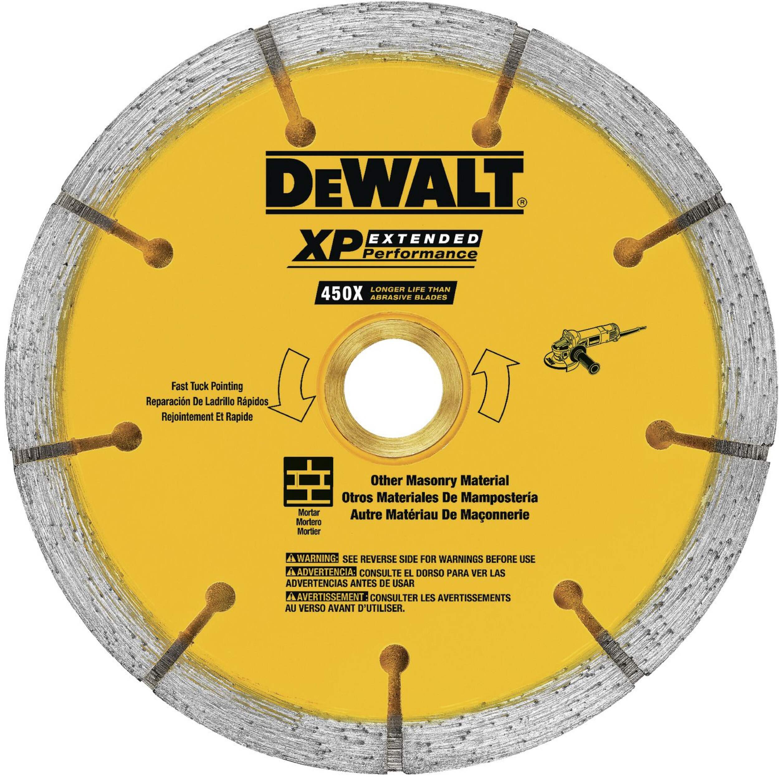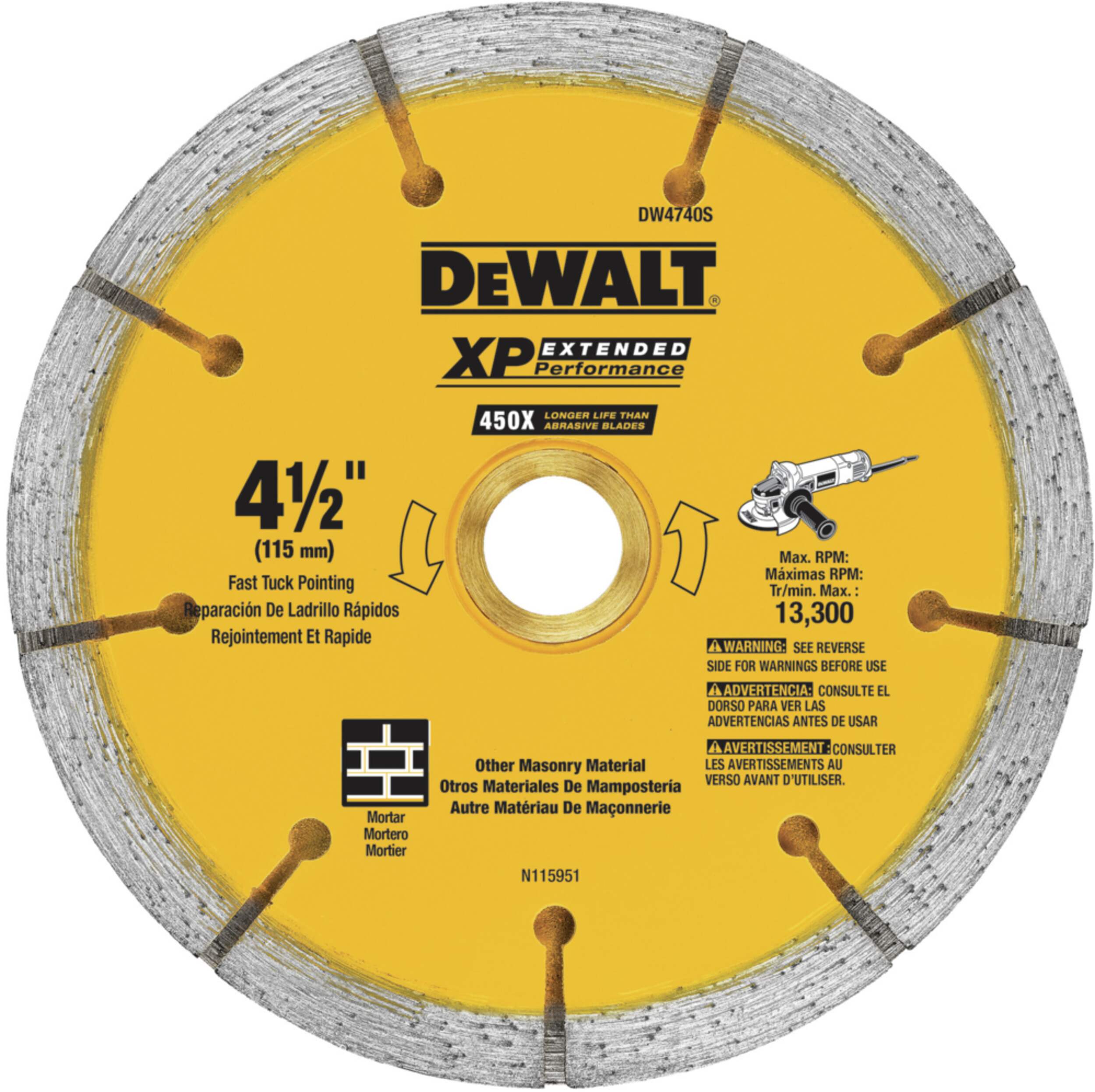 DEWALT DW4740S 4 1/2-Inch x 0.250 XP Sandwich Tuck Point Blades are designed for extended performance with a diamond matrix for long life and enhanced material cutting. Segmented rim blades are laser welded with heat treated steel bodies which provides increase durability and long life. This blade features large diamond segments with cobalt ideal for use across various product applications such as dry cutting concrete, stone and brick and for fast rough cutting. Diameter: 4-1/2 Inch/Edge Thickness: 0.250-Inch/Segment Height: 8 mm/Max rpm: 13, 300.