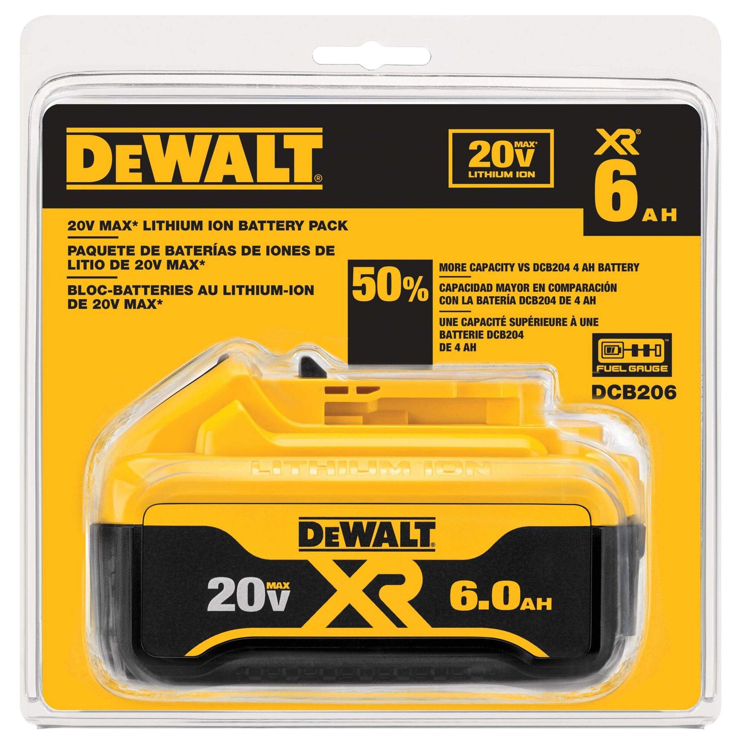 DEWALT DCB206 20V MAX XR 6.0 Ah Battery Pack offers twice the capacity of standard DCB200 20V MAX 3.0Ah battery pack and 3x the capacity of a compact DCB203 20V MAX Li-Ion battery pack