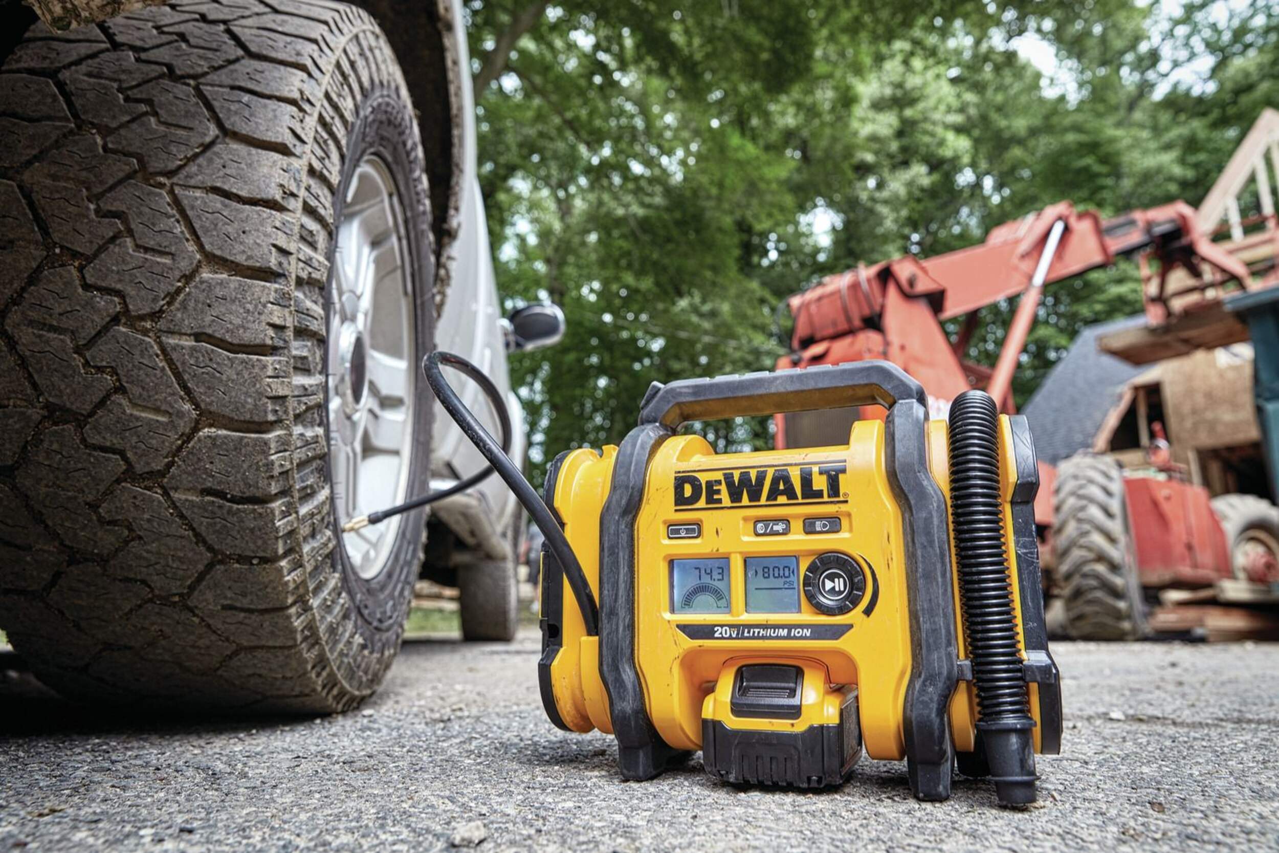 The DEWALT Lithium Ion Air Inflator/Deflator offers unmatched versatility. It runs on a 20V MAX battery, 12V DC power cord, or 110V AC power source. Ideal for job sites and travel, this inflator comes with a tough rubber tube and a digital gauge for simple pressure adjustments. The auto-shutoff function ensures precise inflation. It has an onboard LED light for visibility in dark spaces and heavy-duty rubber feet to reduce movement during operation. Whether you are inflating tires, sports equipment, or other inflatables, this tool is designed to meet your needs with ease and reliability.
