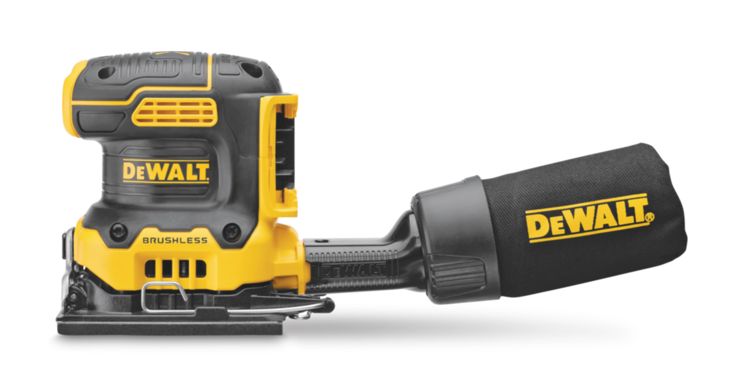 The Dewalt 20V MAX XR Brushless Cordless 1/4 Sheet Sander delivers powerful performance and long runtime. It features a variable-speed dial with settings from 8,000 to 14,000 OPM for versatile sanding. The one-handed locking dust bag attaches securely for effective dust collection, or you can connect the sander to DWV010 or DWV012 dust collectors (sold separately). A rubber overmold grip ensures comfort, and the paper clamp holds sandpaper firmly in place.