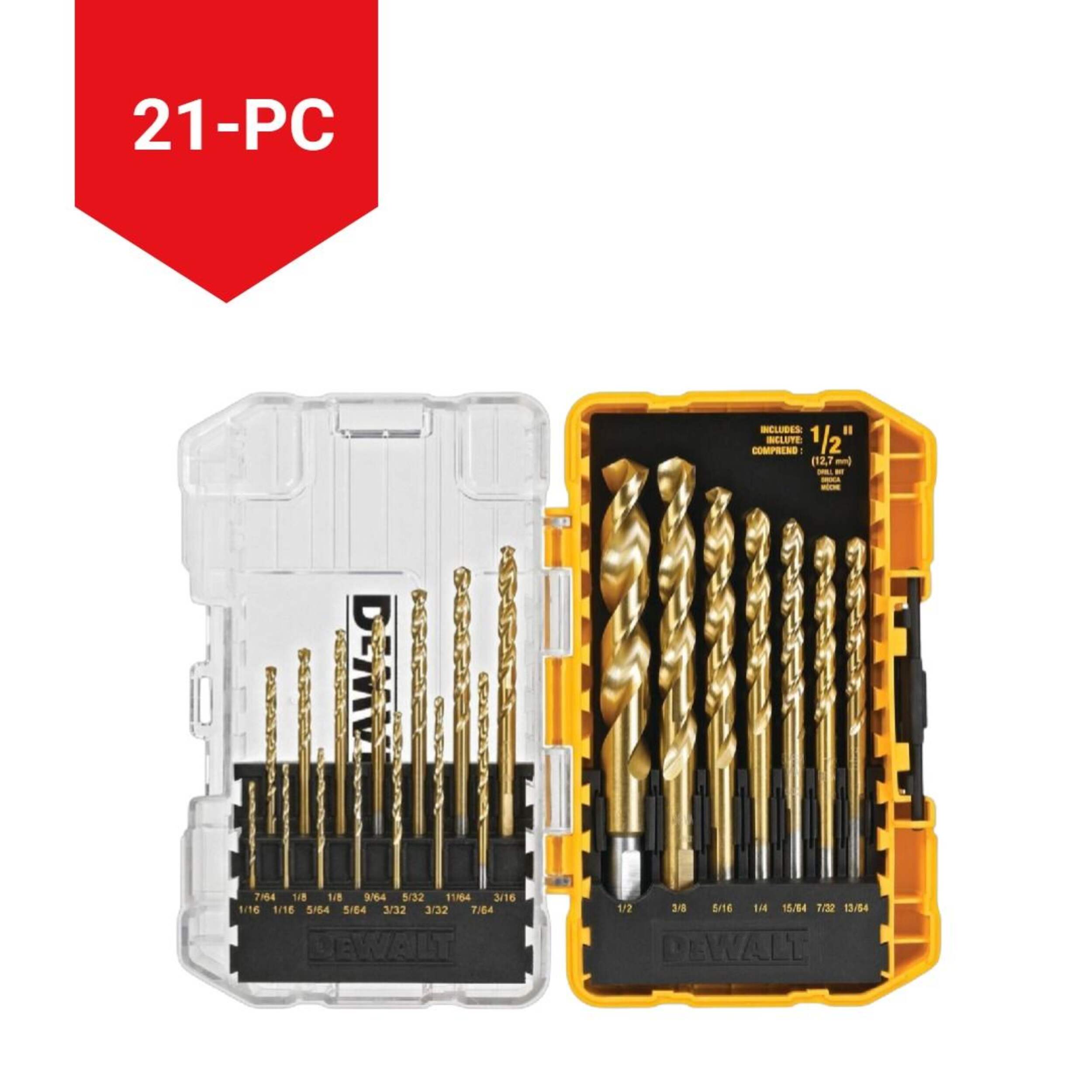 Set includes 21 drill bits ranging from 1/16" to 1/2"