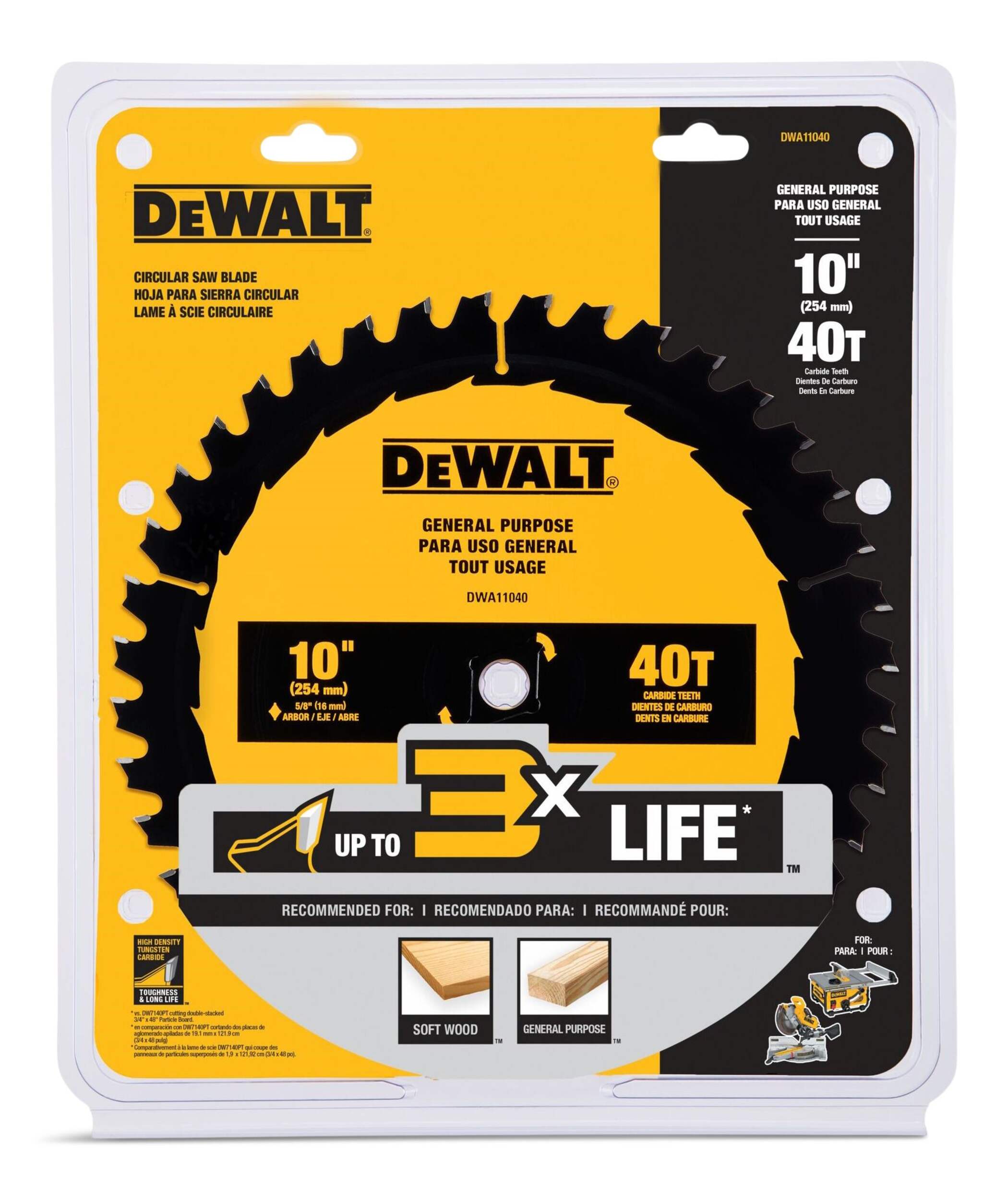 The DEWALT DW3114 10-in 40T Carbide Tipped Circular Saw Blade delivers up to 3X longer life with its optimized tooth geometry and ultra-sharp carbide-tipped teeth. Designed for clean, precise cuts, this durable blade ensures high performance and reliability for woodworking projects. Its 40-tooth design provides efficient cutting performance across various materials including softwoods, hardwoods, and composites.