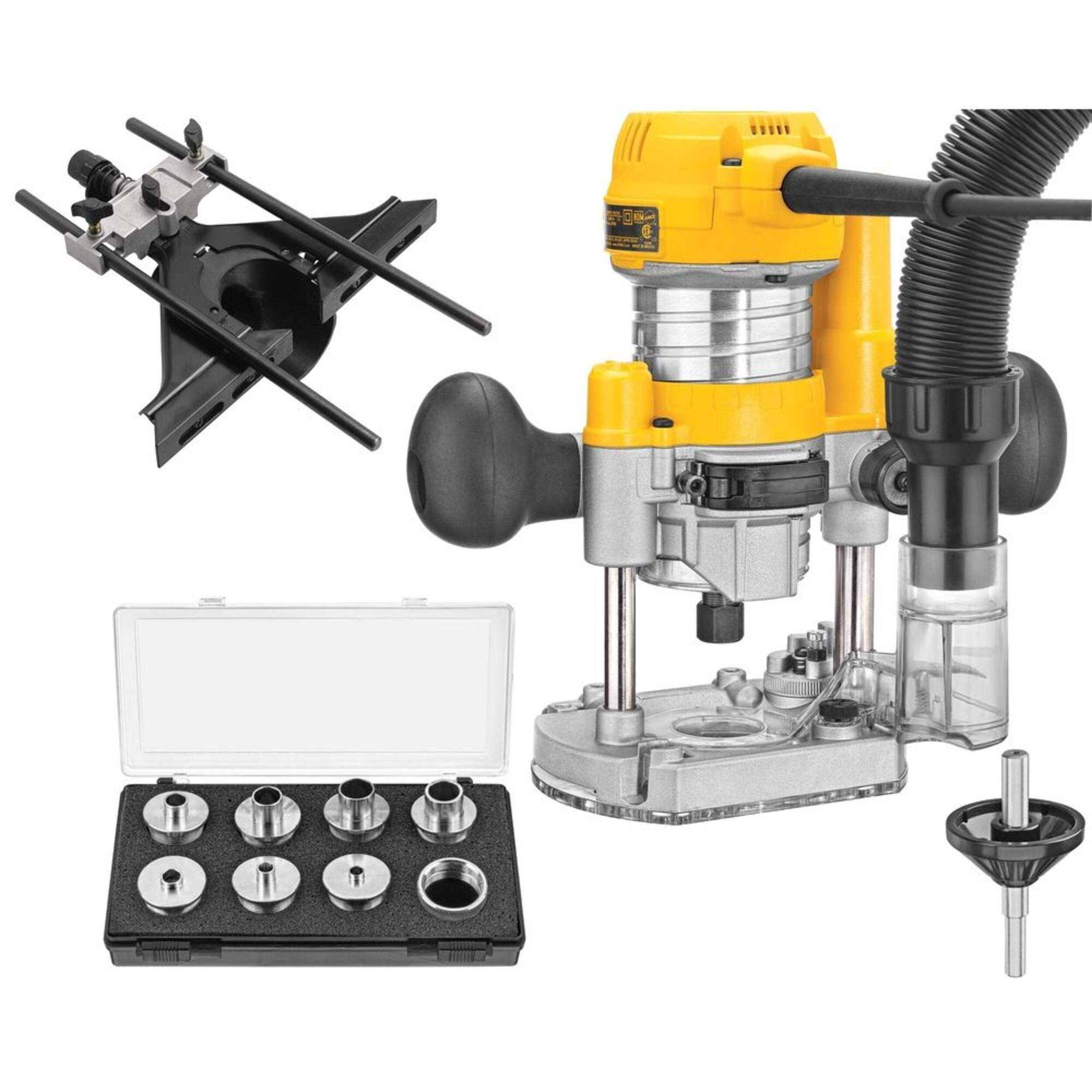 The DWP611PK 1-1/4 HP Max Torque Variable Speed Compact Router Combo Kit with LED's has a 1-1/4 HP motor to deliver power for the toughest applications, and variable speed control for optimal bit speed in each application. DEWALT fixed router features precise depth adjustments and fast, easy motor pack removal for bit and base changes. LED light and clear plastic fixed base provide superior bit visibility.
