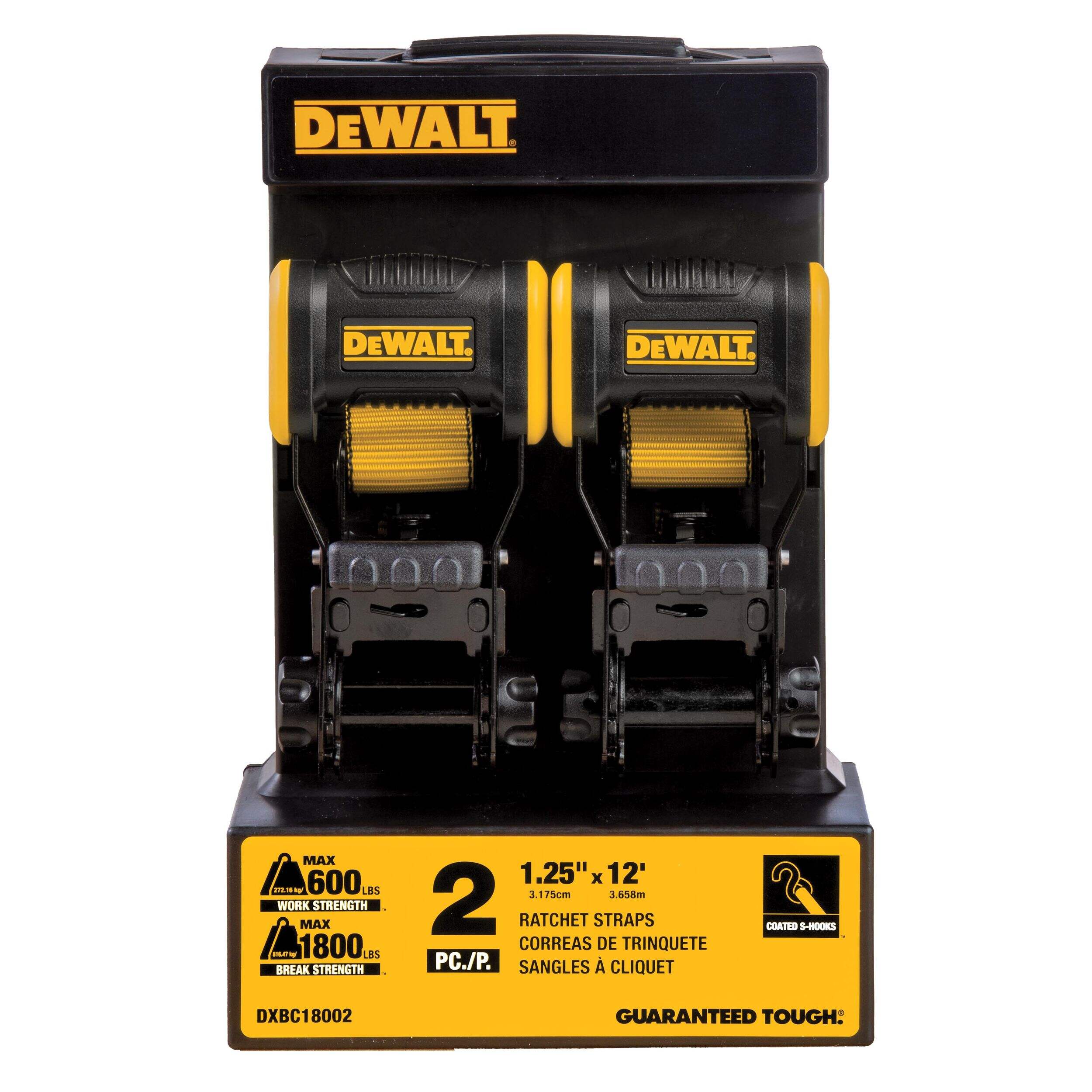 The DEWALT 1,800-lb Ratchet Tie-Down Straps provide superior load security with weather-resistant components and an ergonomic handle design. Durable and sturdy, these ratchet straps securely fasten cargo loads on trucks, trailers, and more. The ratchet mechanism allows easy tightening with an ergonomic grip that reduces hand fatigue, while the vinyl-coated S-hooks prevent damage to cargo and your vehicle.