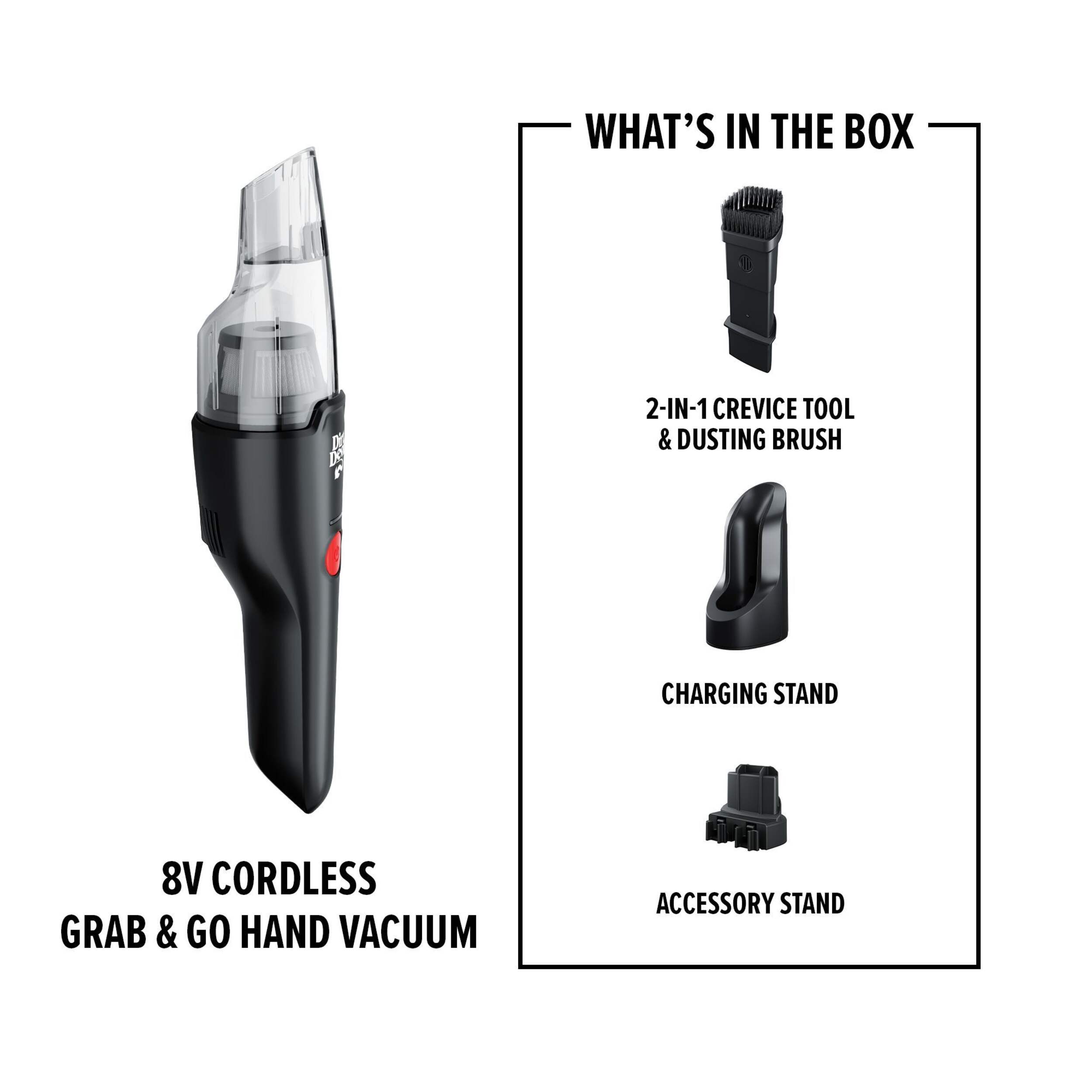 The ideal companion for quick pick-ups around the home, the Dirt Devil Grab 'N' Go Cordless is lightweight and compact. With a small but powerful charging stand, the Grab & Go+ Hand Vacuum is always ready for any unexpected dry mess or accident, and the ergonomic design lets you get to all those out-of-the-way messes with ease.